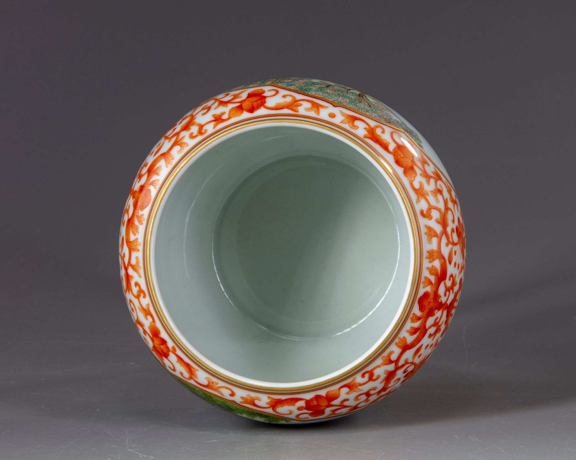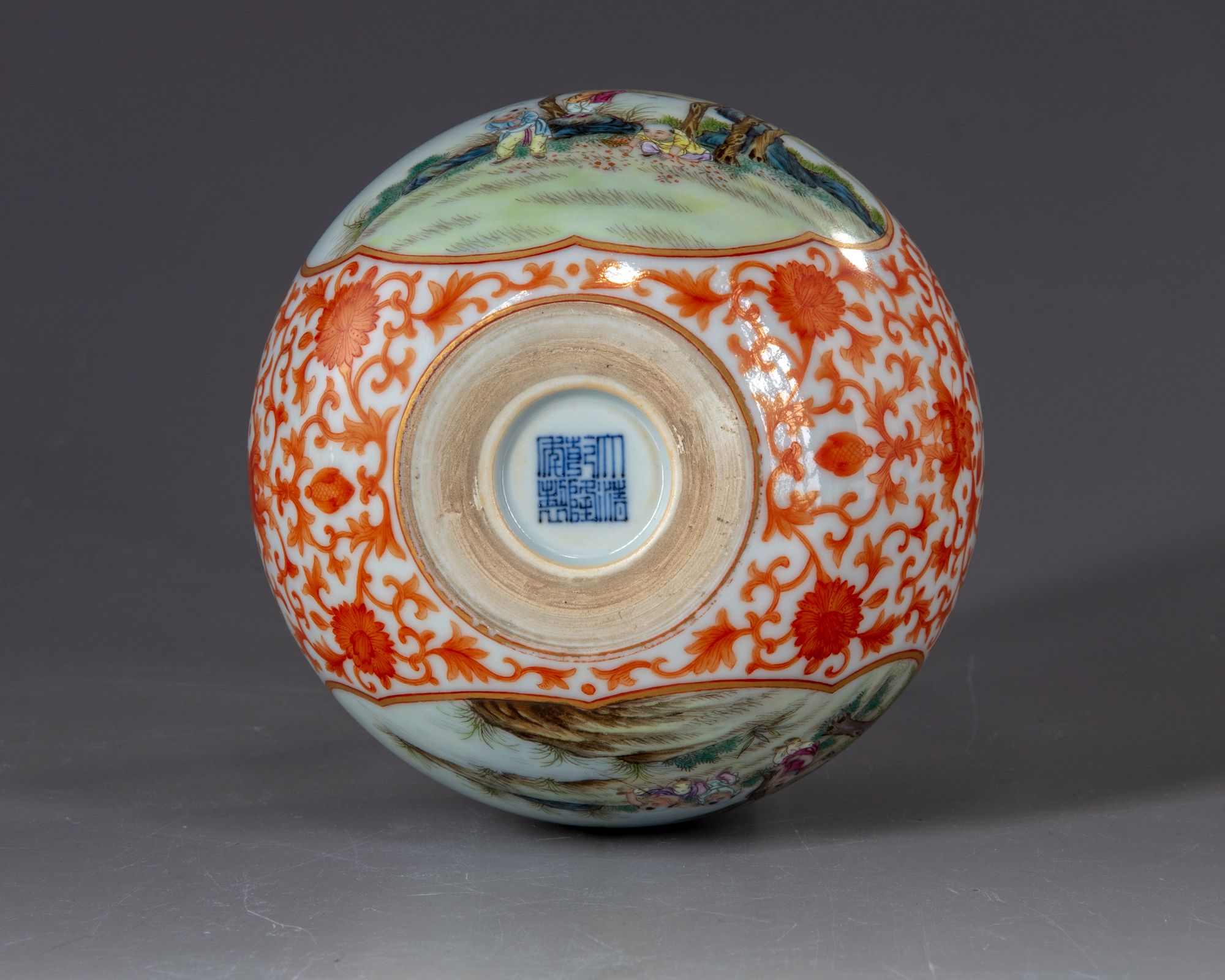 A Chinese porcelain pot, decorated to the exterior with two panels enclosing kids at play in a landscape, further painted with lotus scrolls and Fu bats amongst foliage. The bottom with a Chinese Qianlong seal mark.