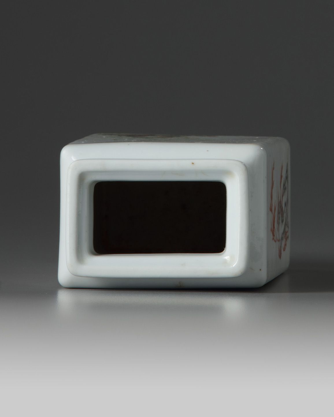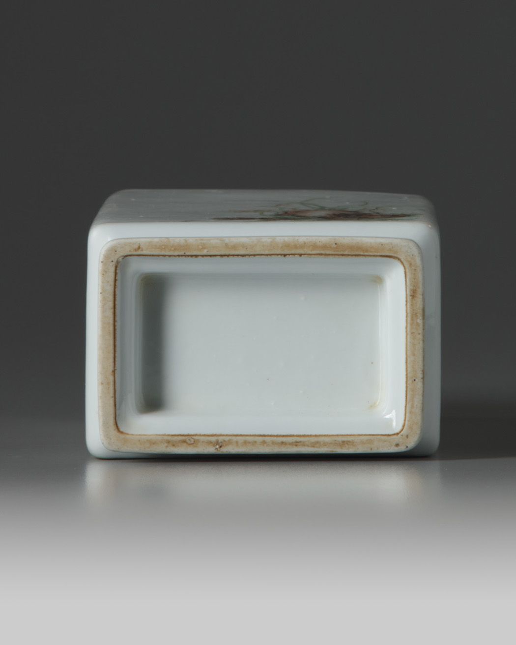 The vase is decorated to one side with orchids flowering from rocks, and to the other with a leafy green bamboo stalks growing from rocks. The two narrow sides are decorated with iron-red bamboo.