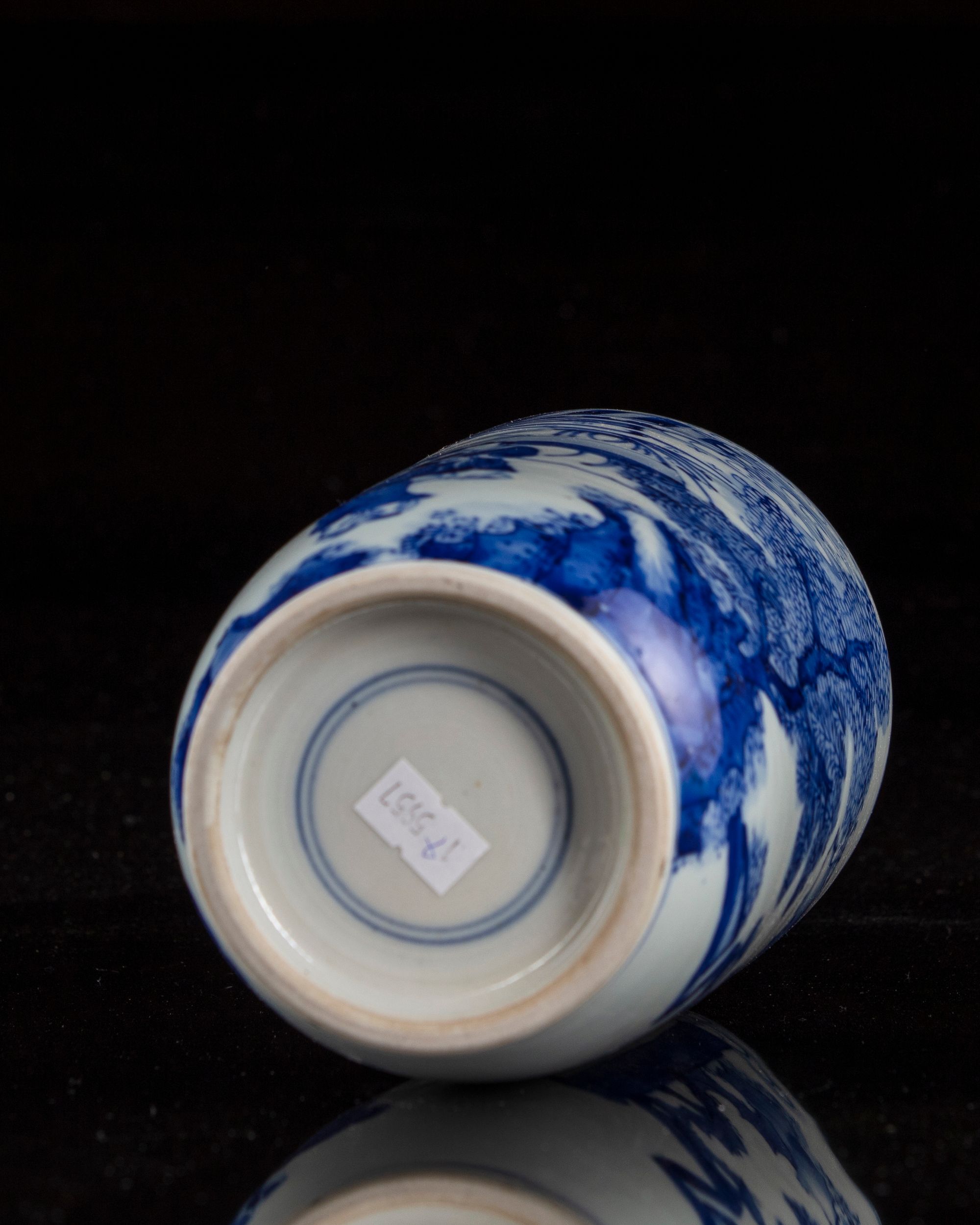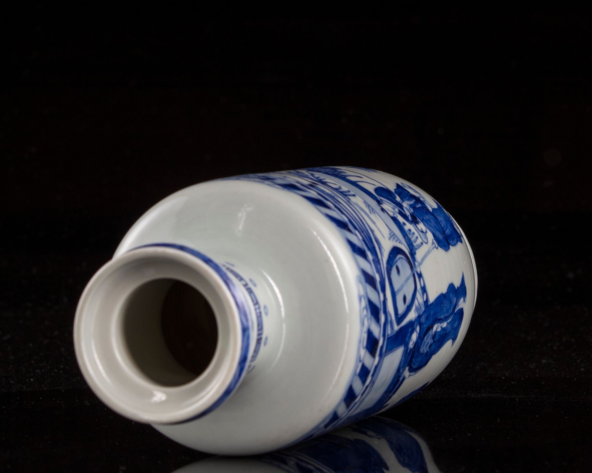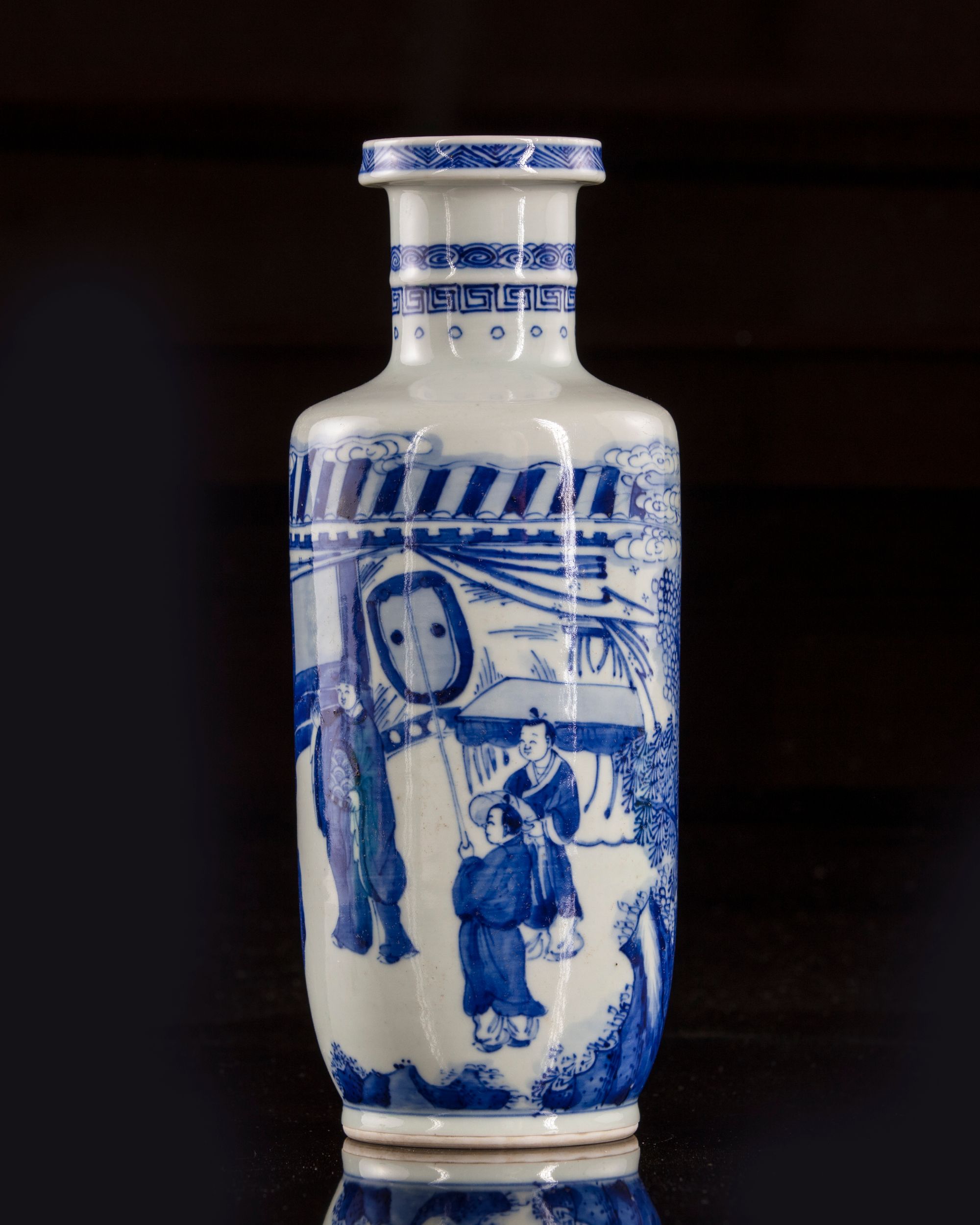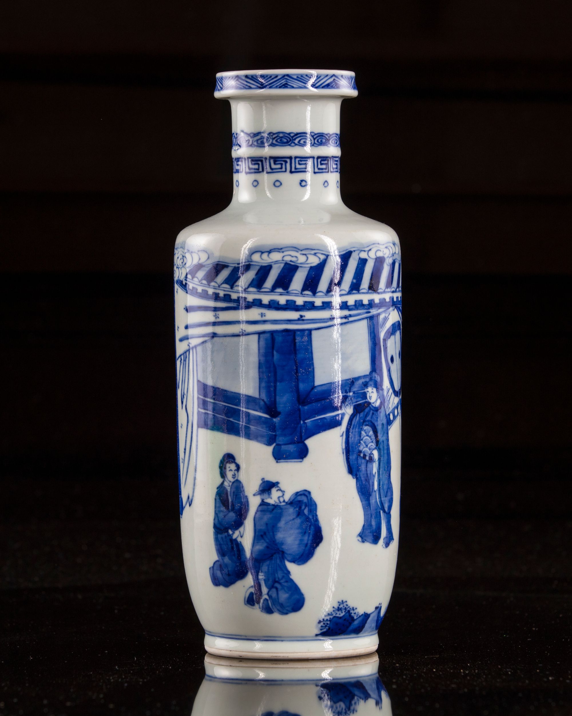 The vase is decorated with a continuous scene of a scholar kneeling before a standing scholar holding an osmanthus branch in an interior setting. The base with a double circle.