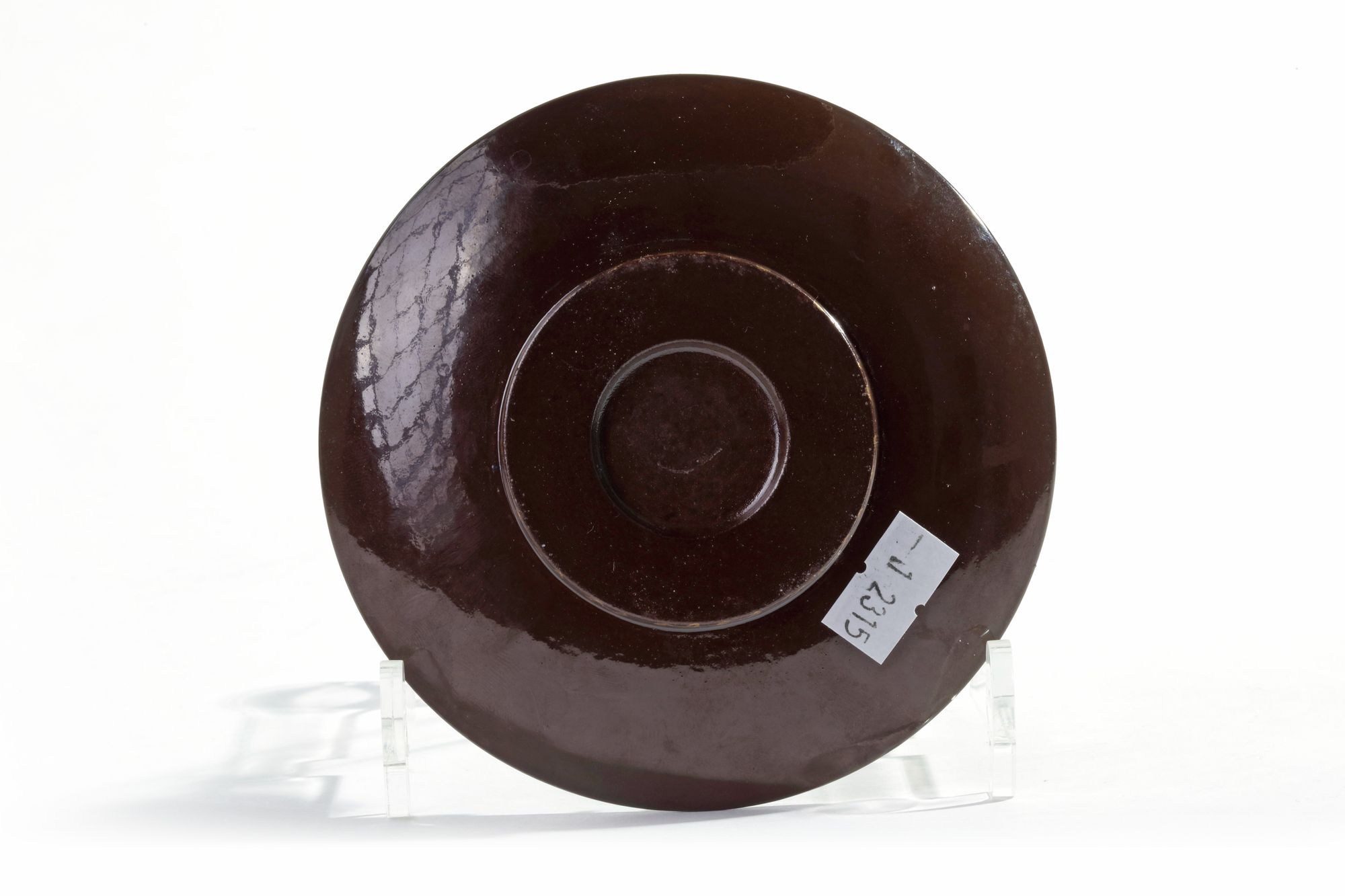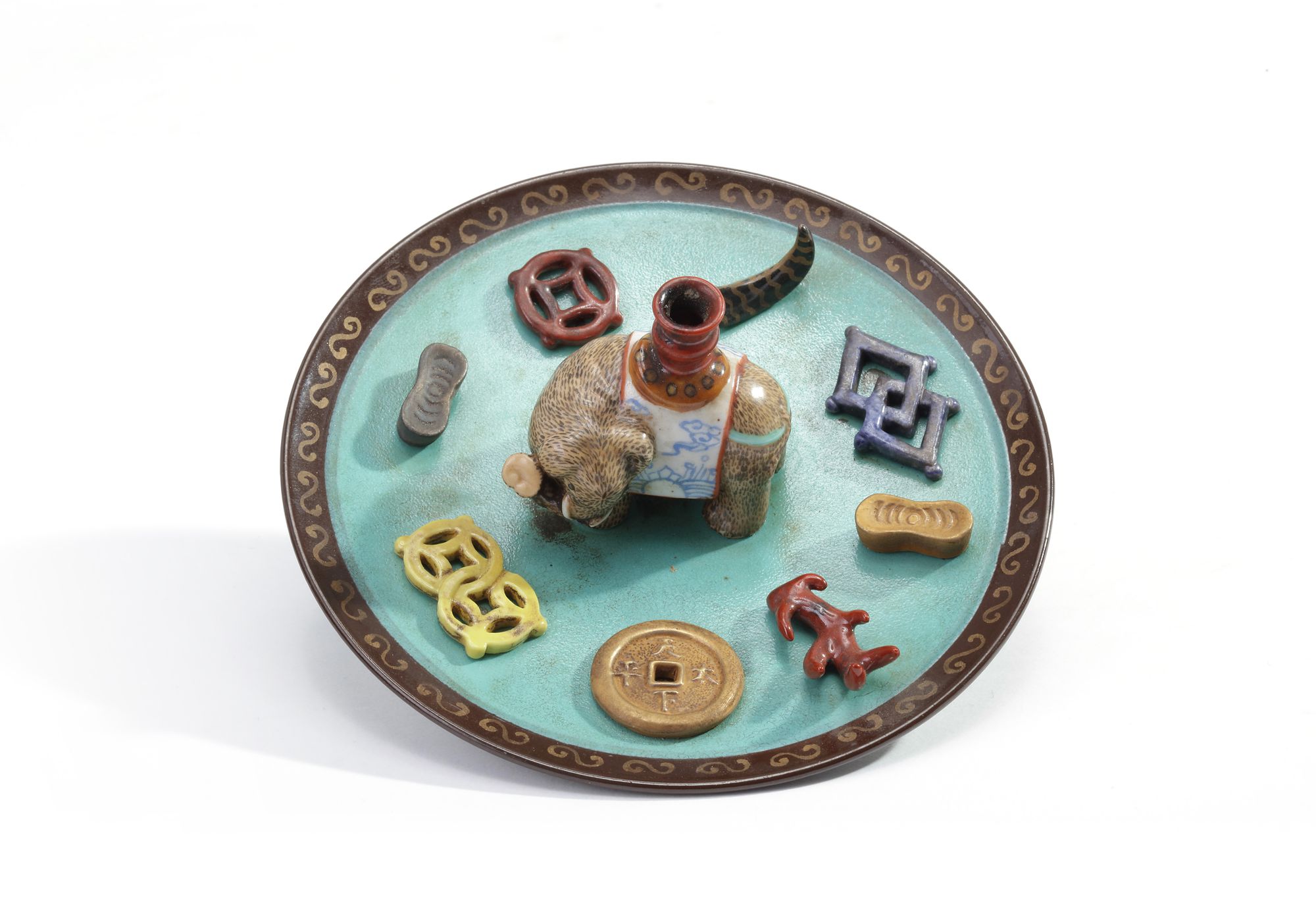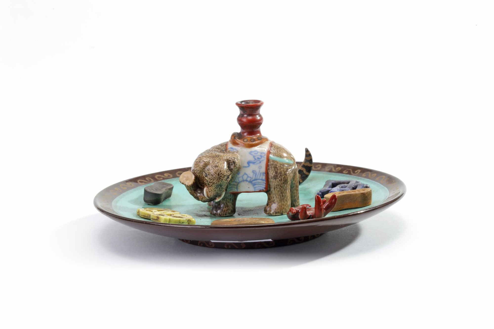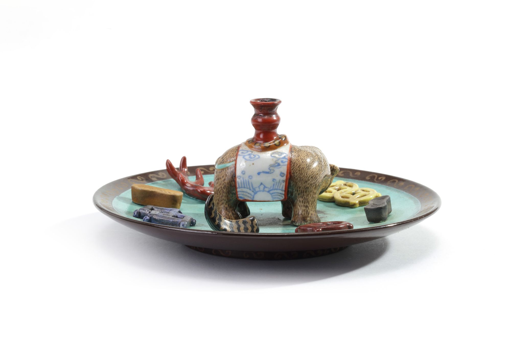 The turquoise-ground circular holder is applied to the centre with a model of a caparisoned elephant, supporting a miniature vase surrounded by applique enamelled precious objects. The underside and base are enamelled brown.