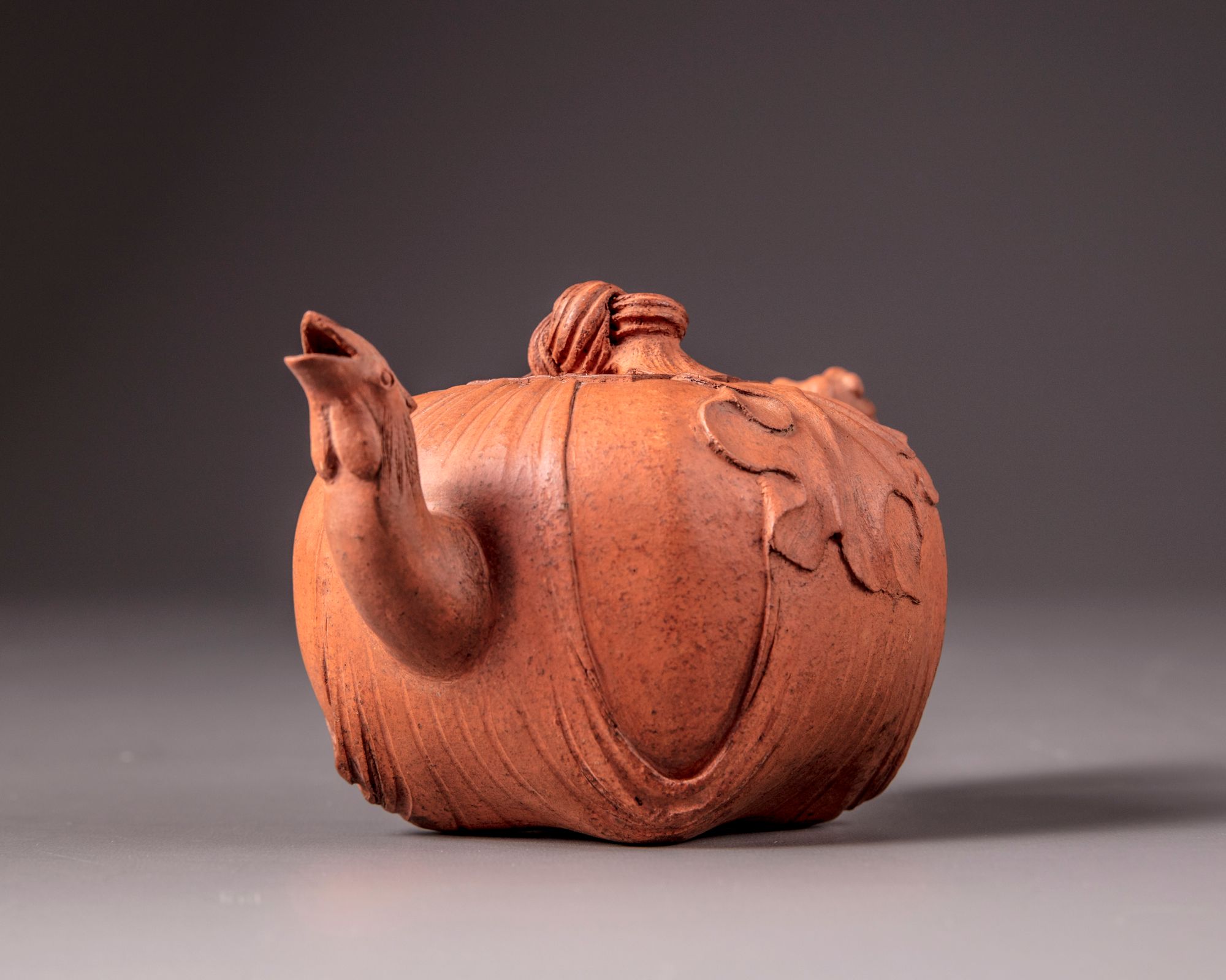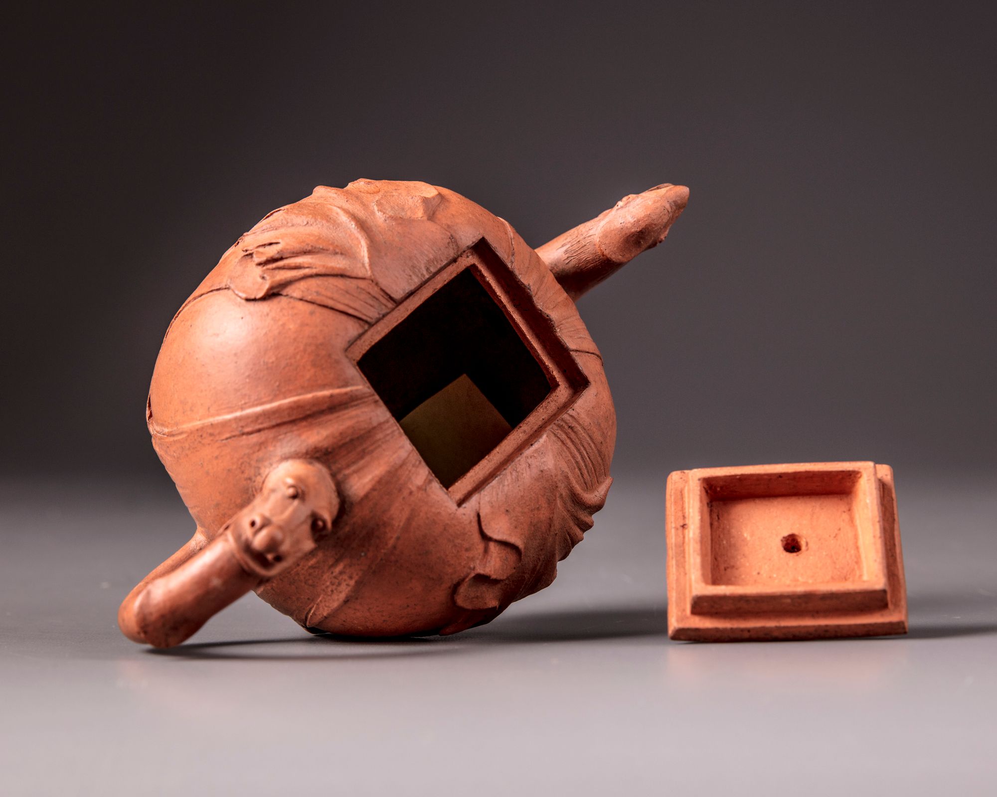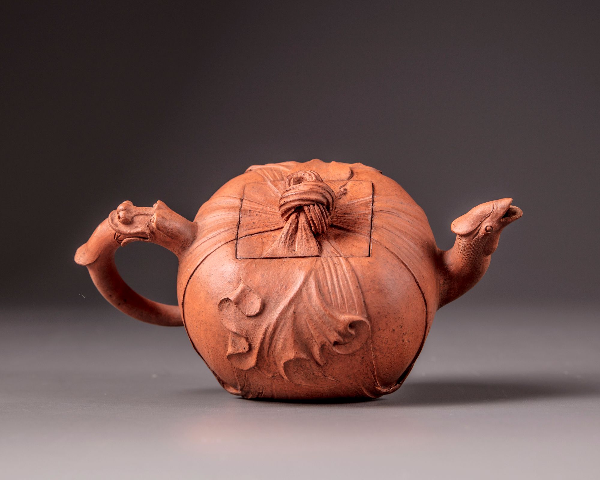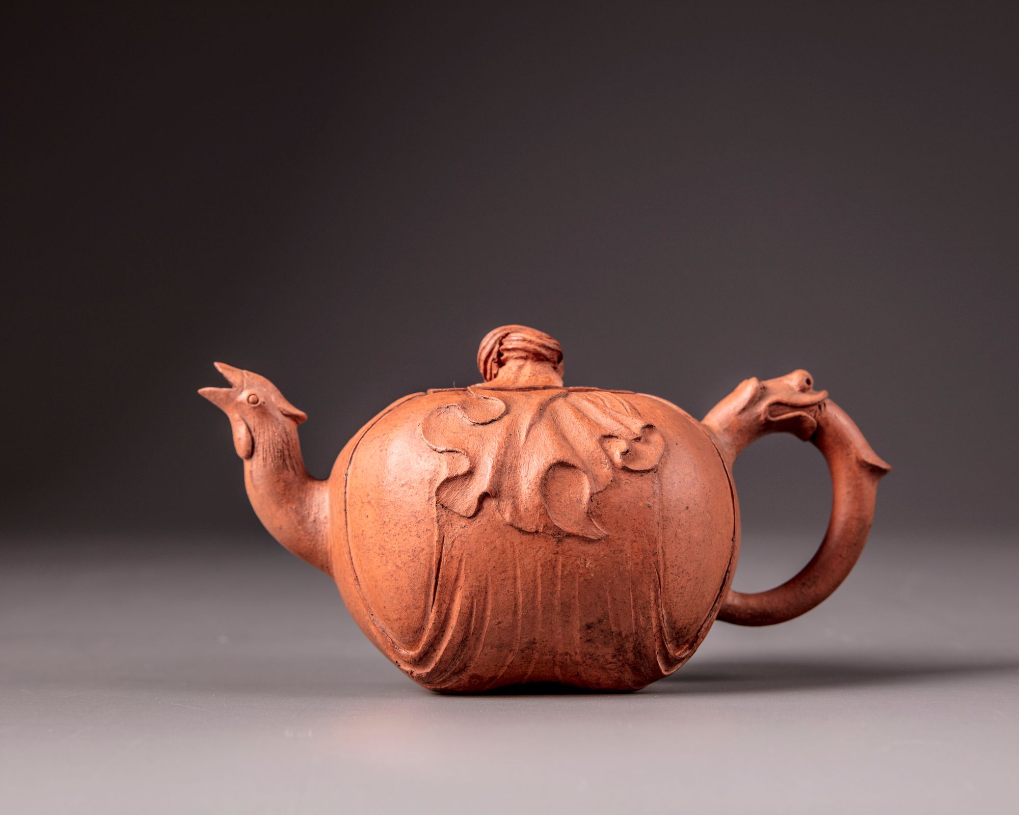 The teapot is decorated with phoenix-shaped spout and a dragon handle, the body is moulded as a seal box wrapped in fabric, the knot forming the finial of the cover with the remainder of the fabric cascading down the sides. It stands on four protusions that form the feet. The base is inscribed.