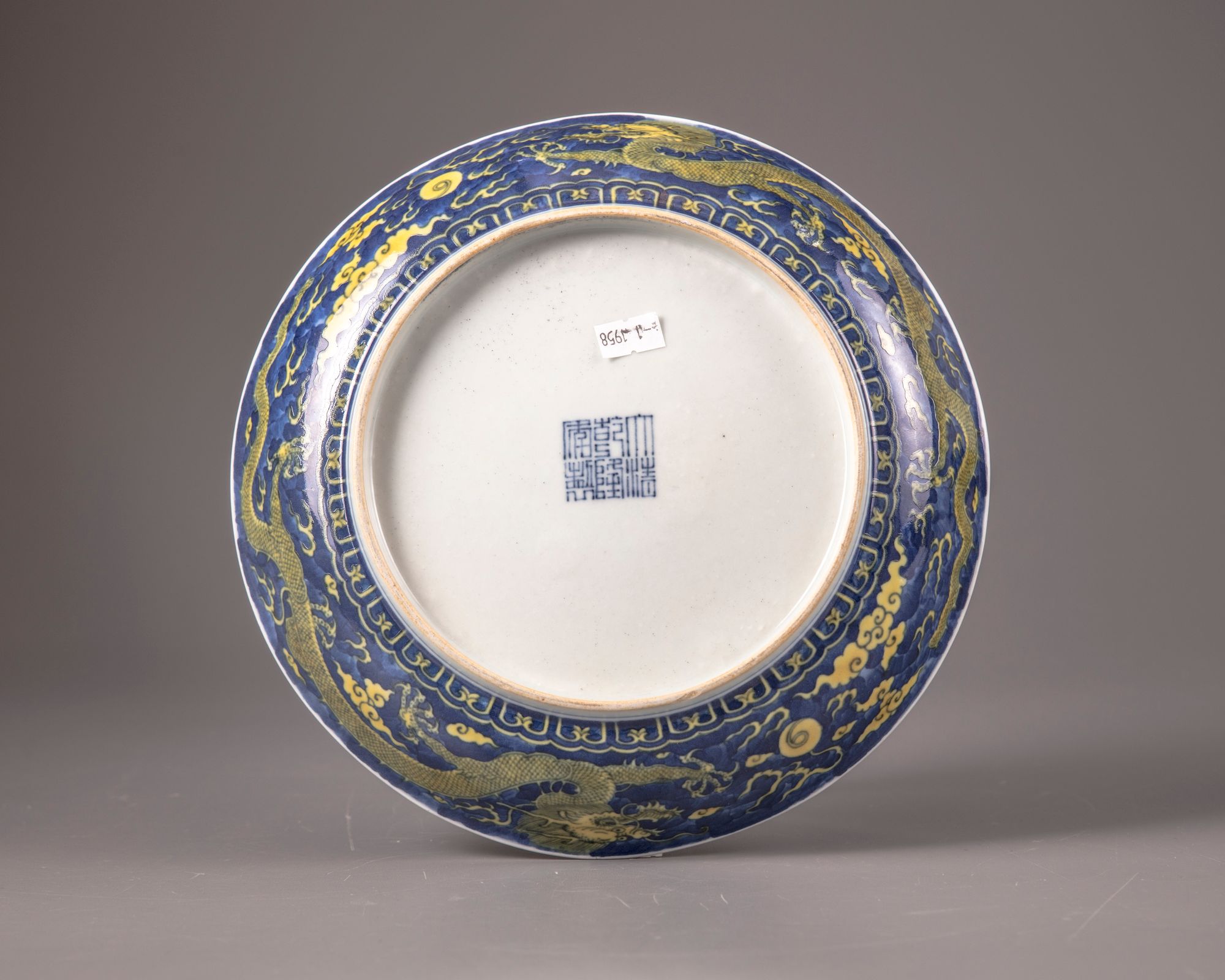 A Chinese yellow-glazed blue and white 'dragon' dish