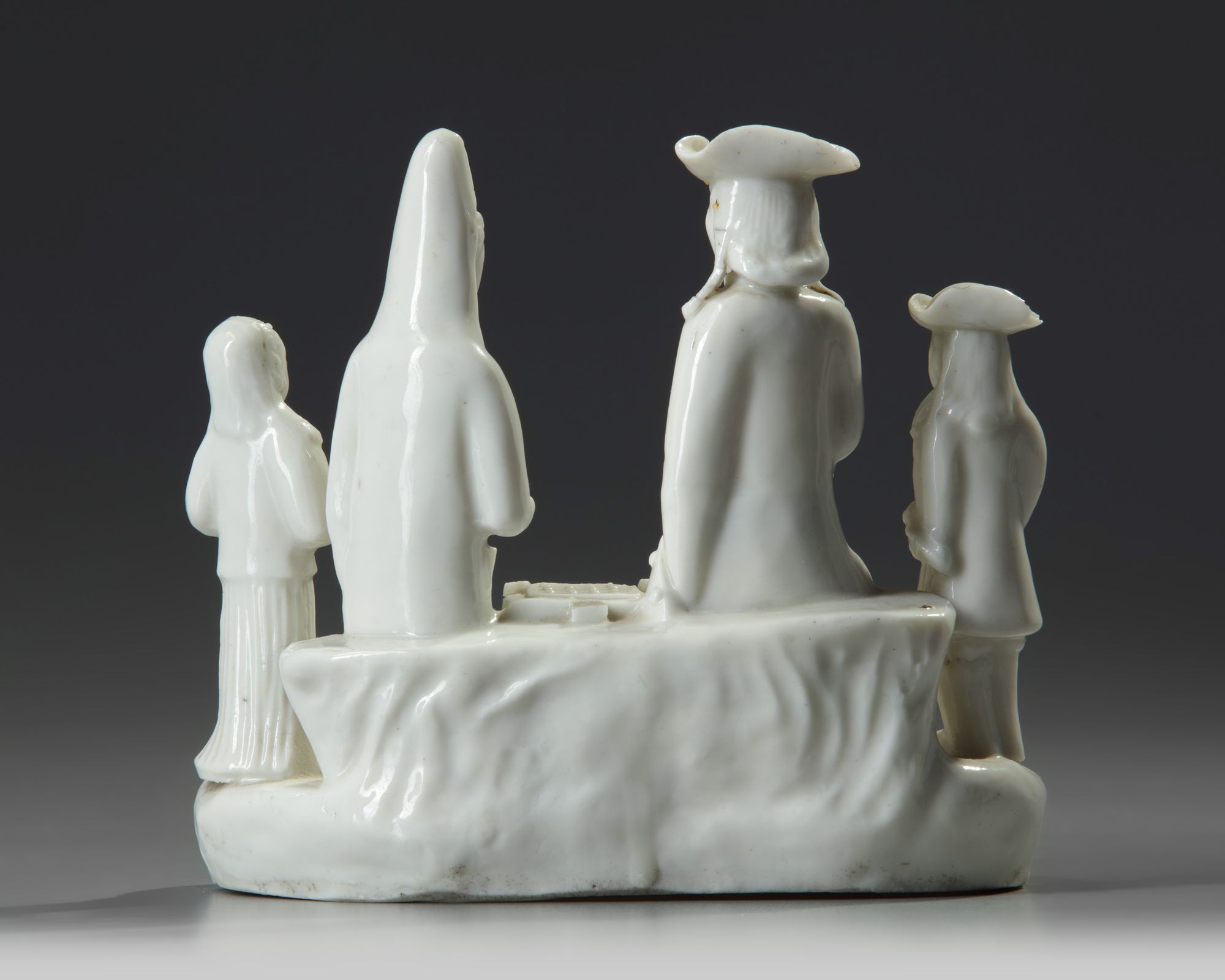 Also known as the 'Governor Duff' group, the group is modelled as a European couple seated at a table, the man is holding a goblet of wine and wearing a tricorn hat, and the woman wearing a cowl. They are seated between their son and daughter standing on each side. Before them is their dog, their monkey, and a jardiniere.
