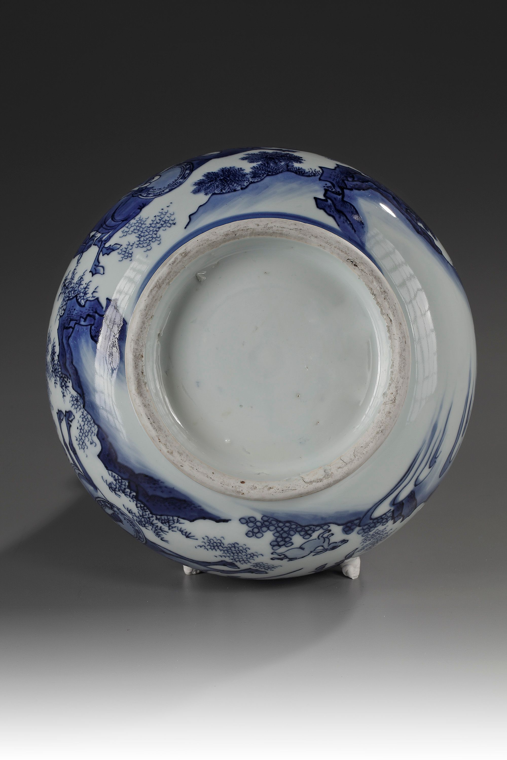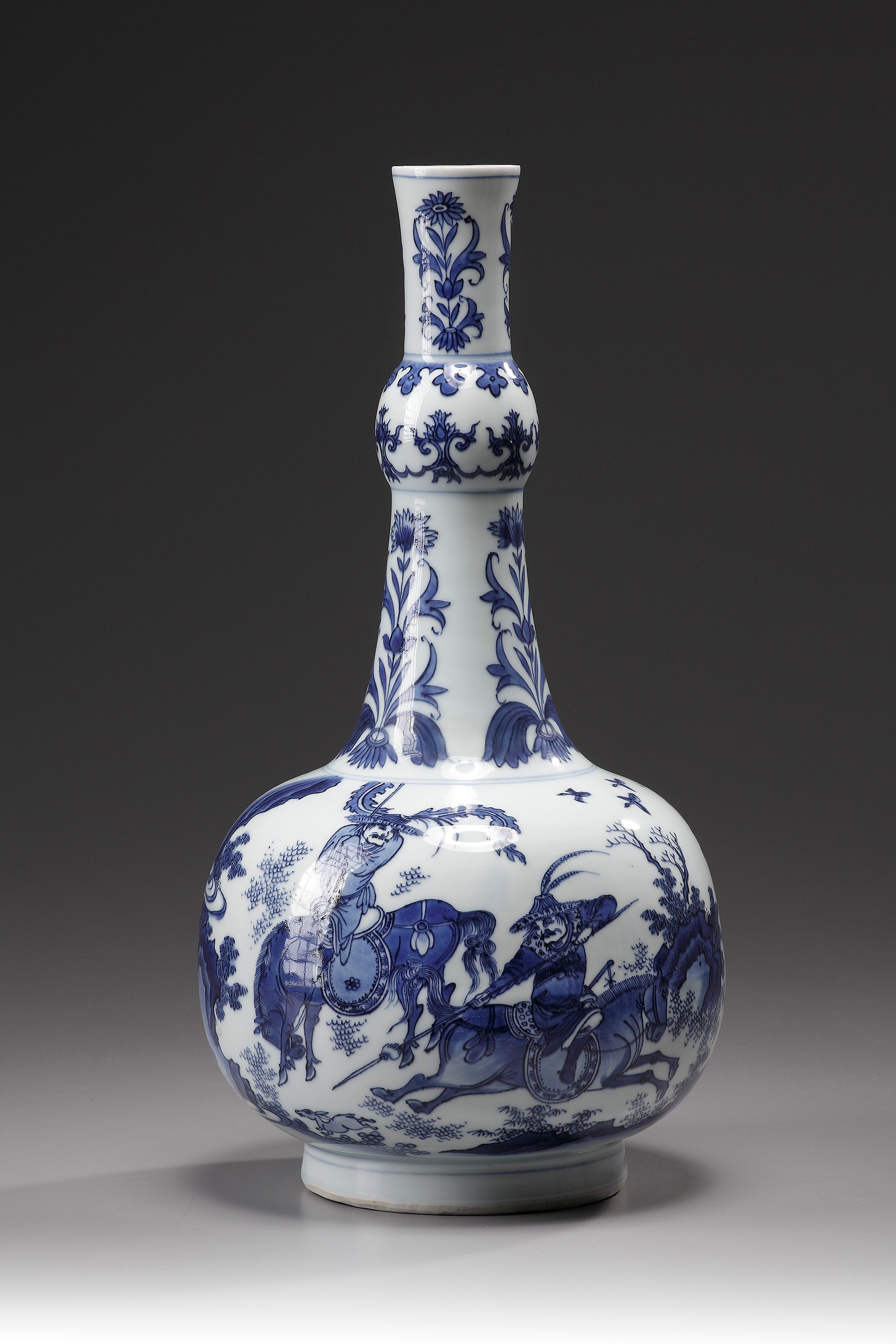 painted to the globular body in underglaze blue with a continuous hunting-scene of four men on horseback hunting ducks and hare, surmounted with a tall neck moulded with a bulb, painted with stylised upright tulips.