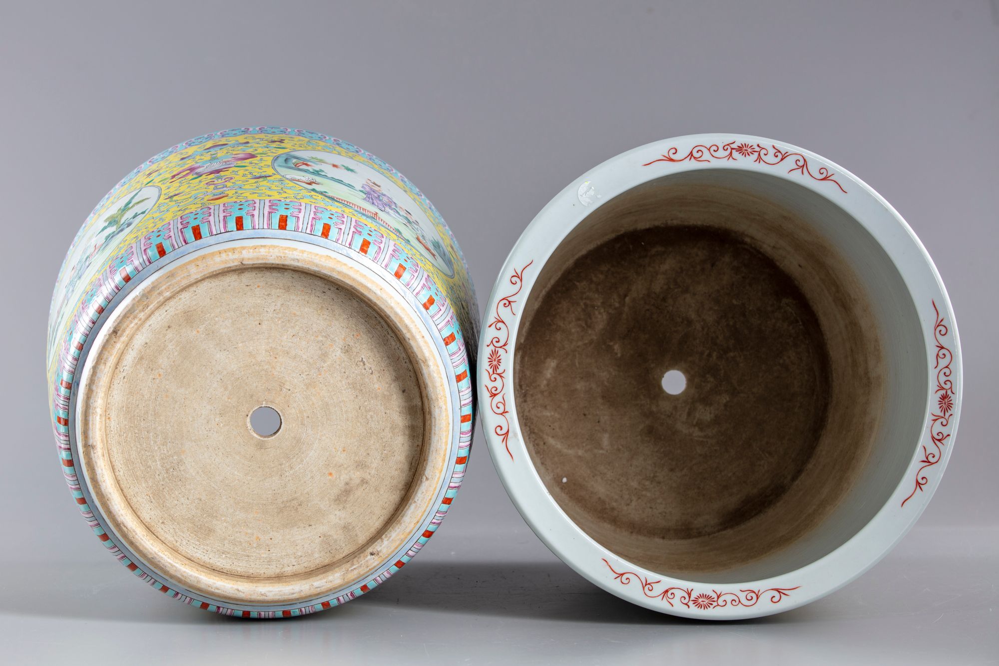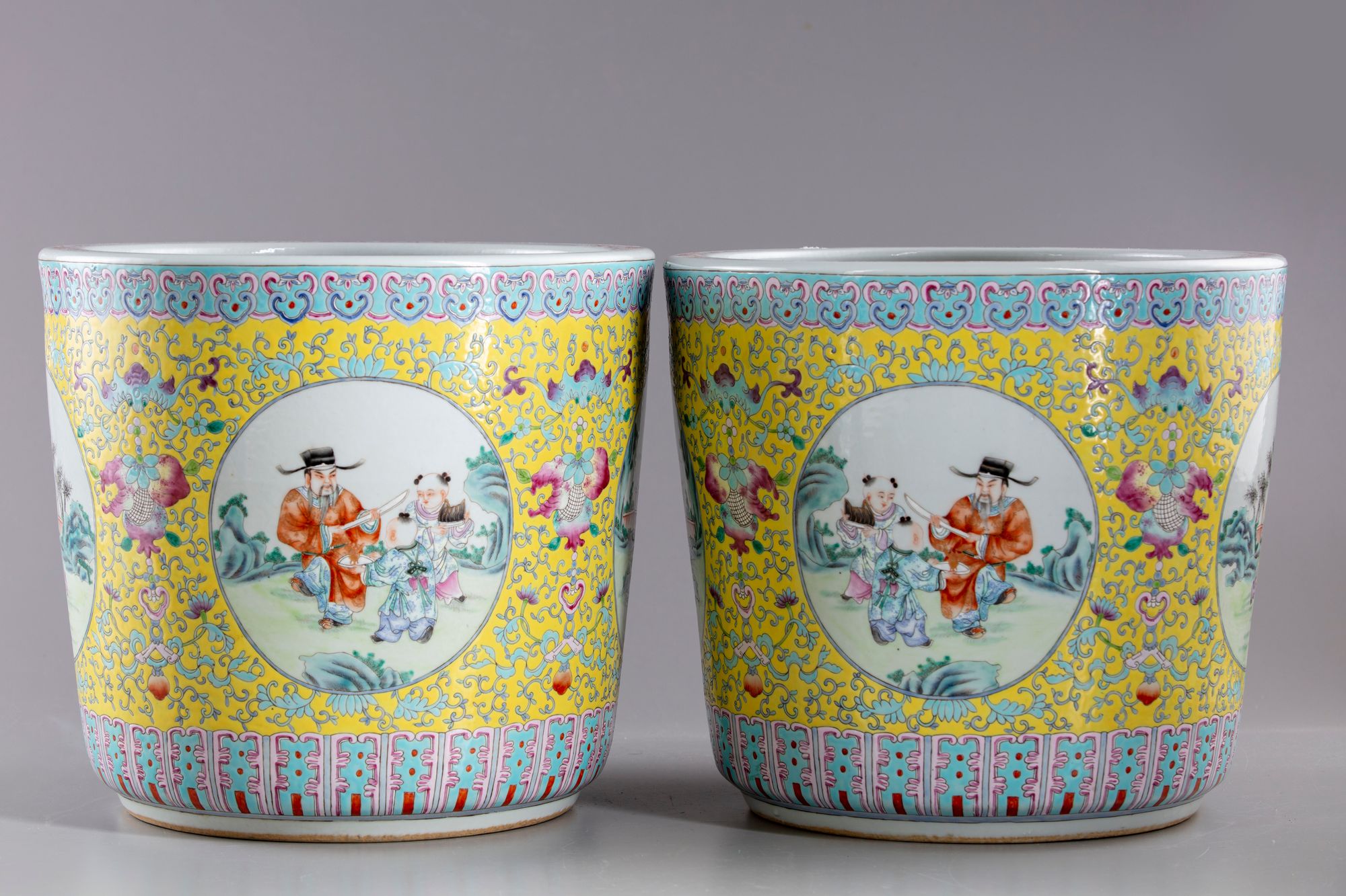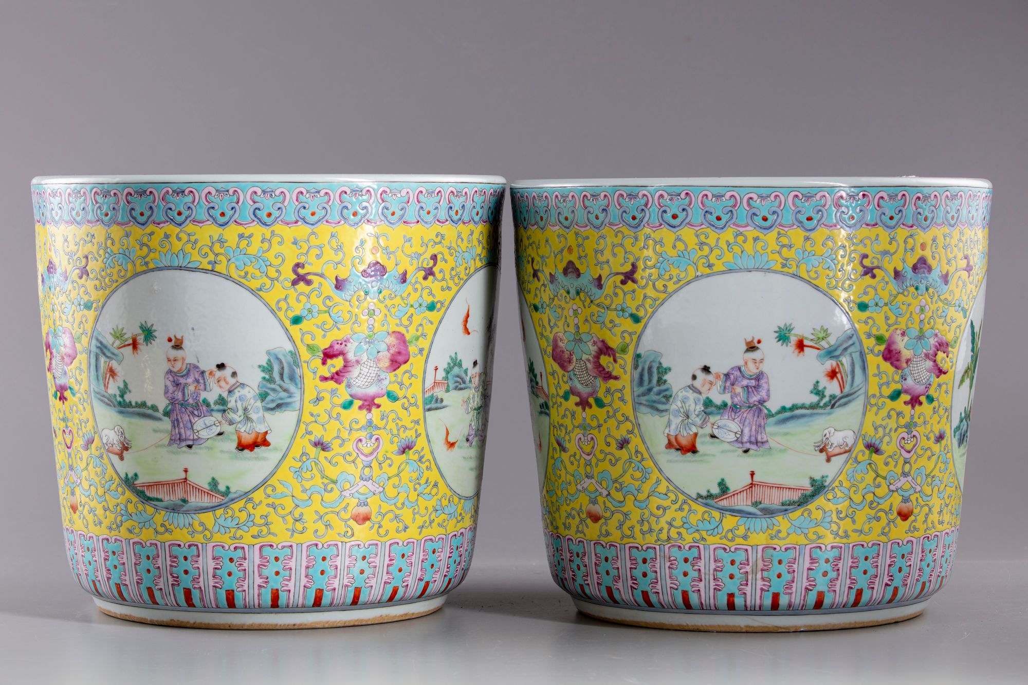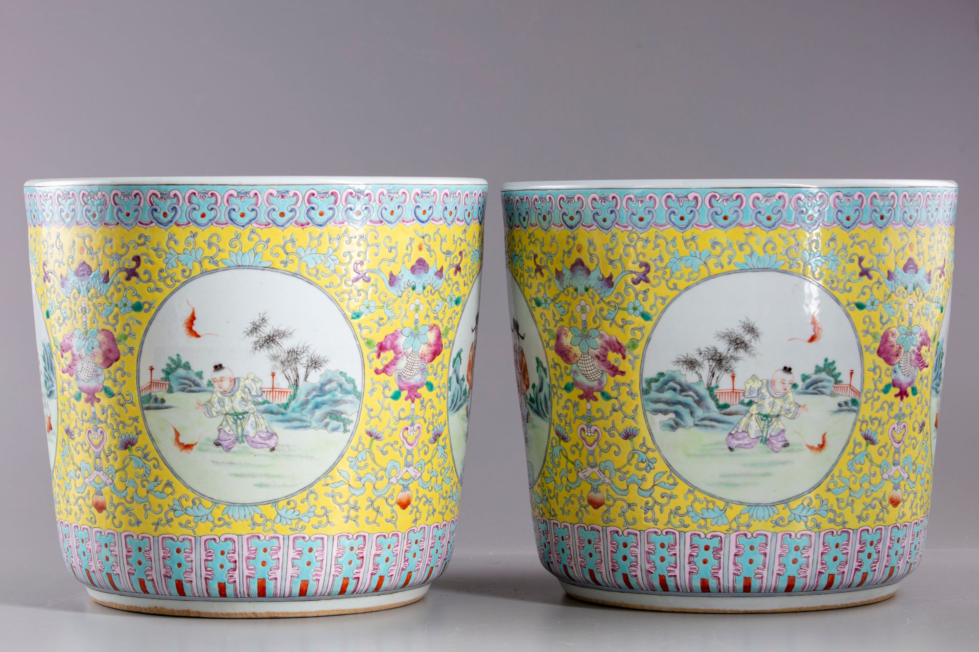 The exterior is decorated with rounded enclosing boys at play, interspersed with bats suspending the three abundances and chimes, all on a scrolling floral ground, the rim with a ruyi band the the foot with a lappet band.