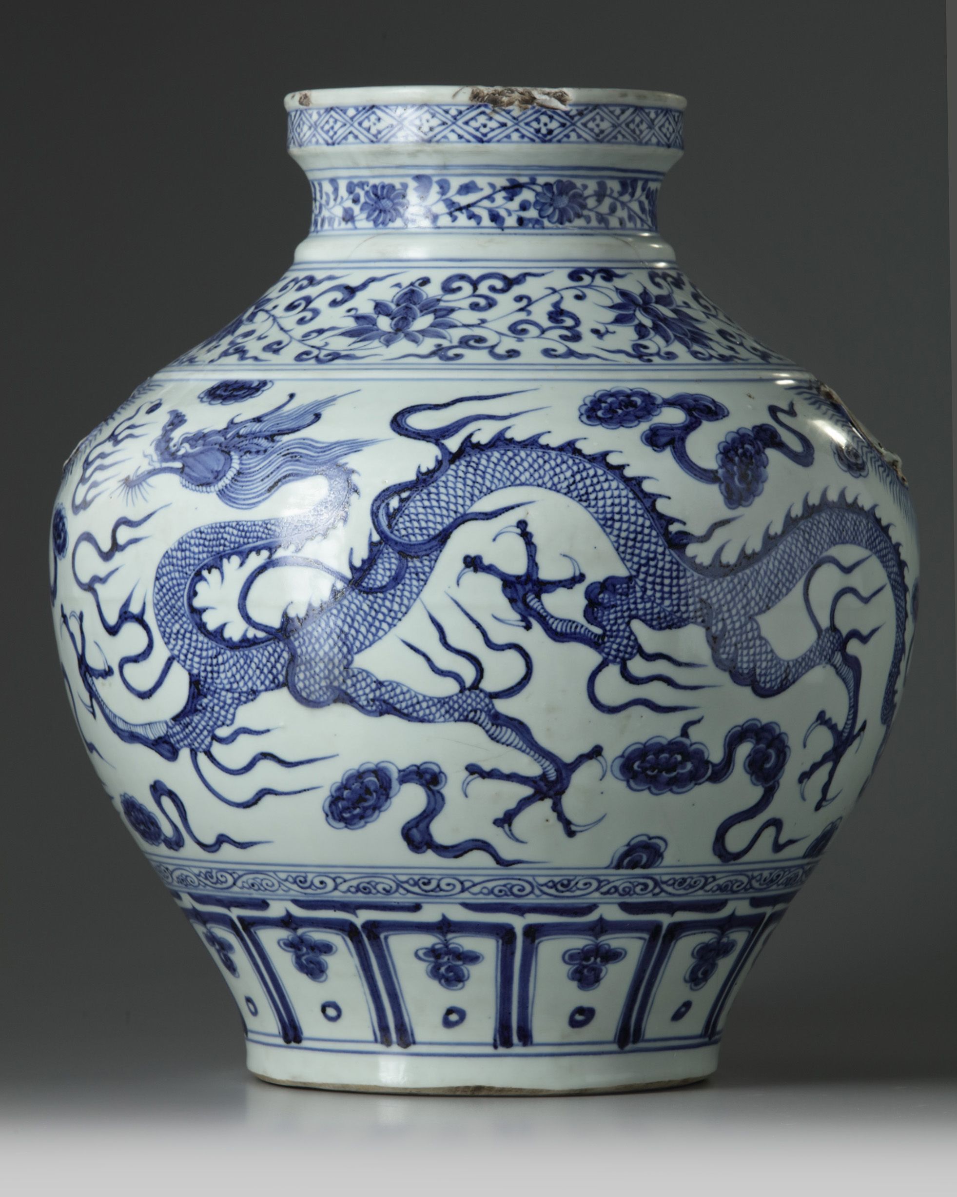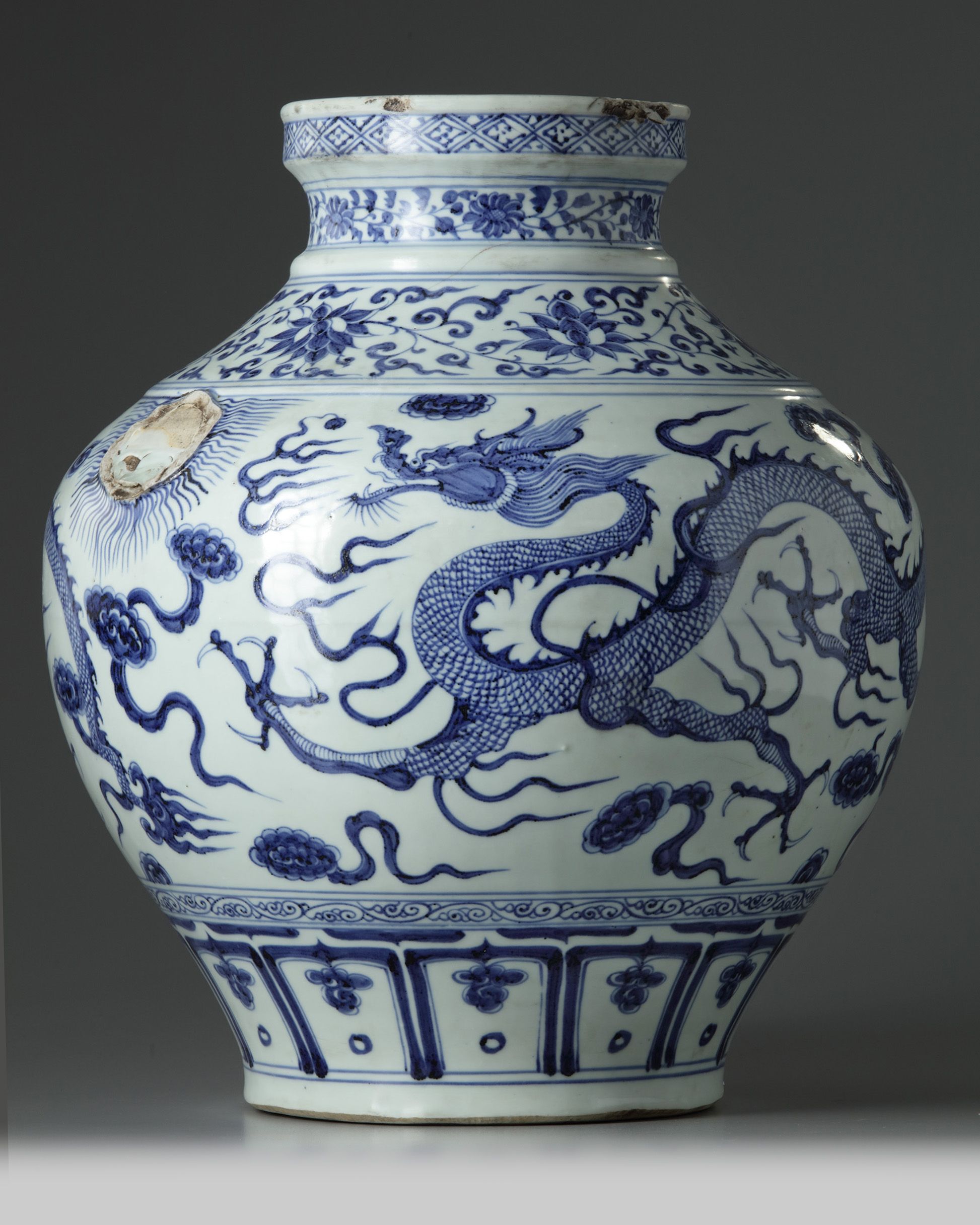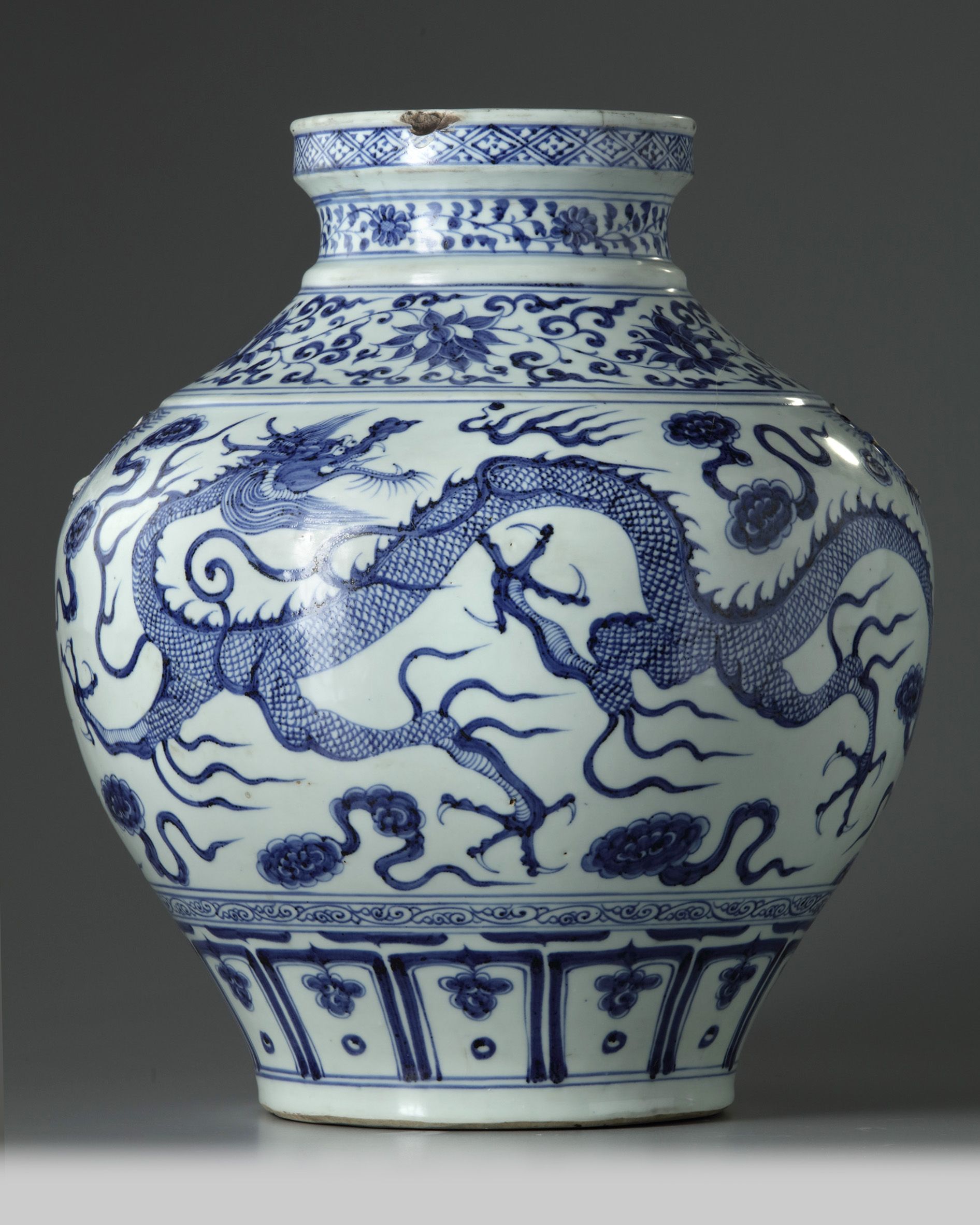 The vase is decorated to the body with two striding dragons below a lotus scroll band.