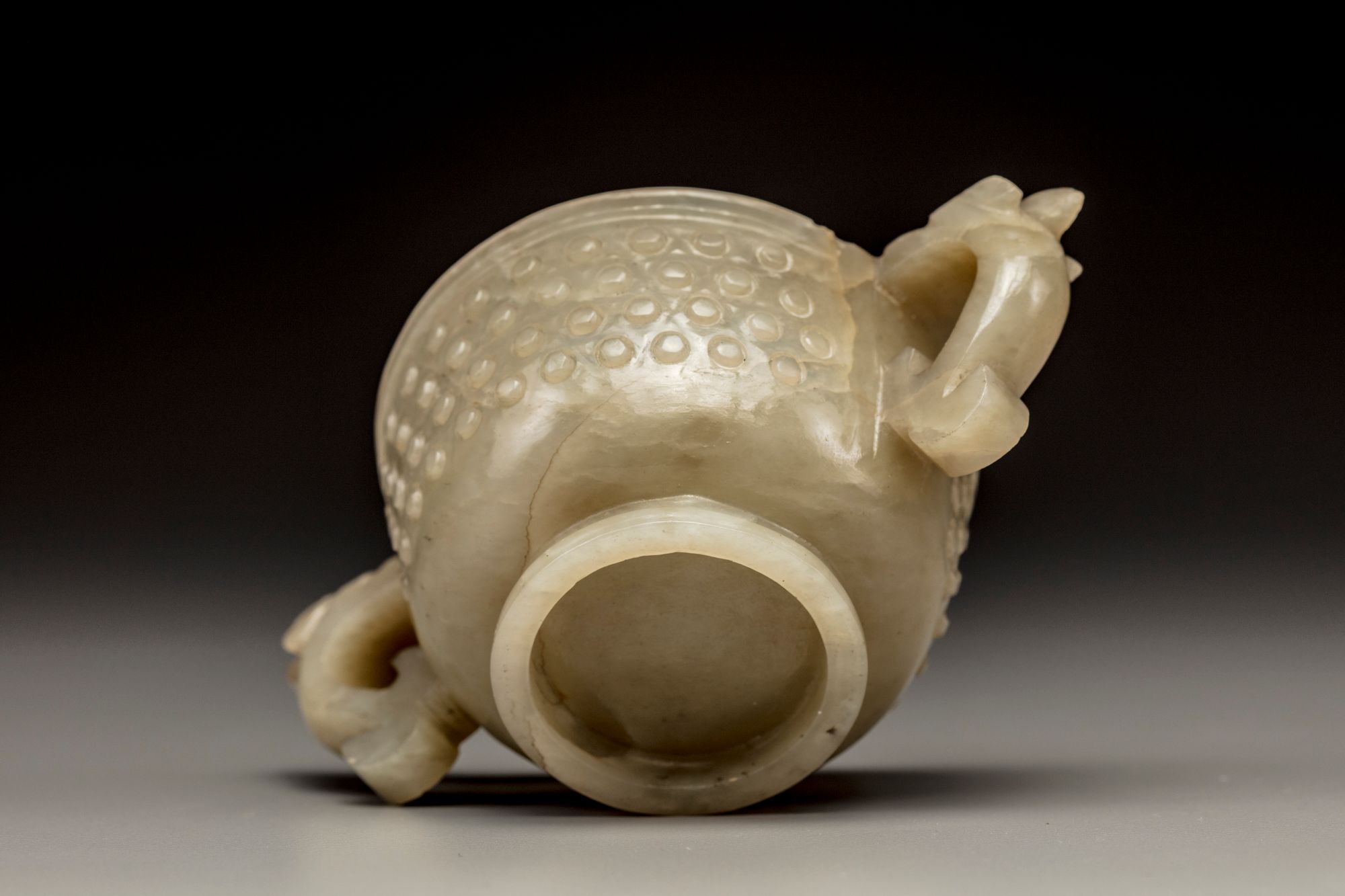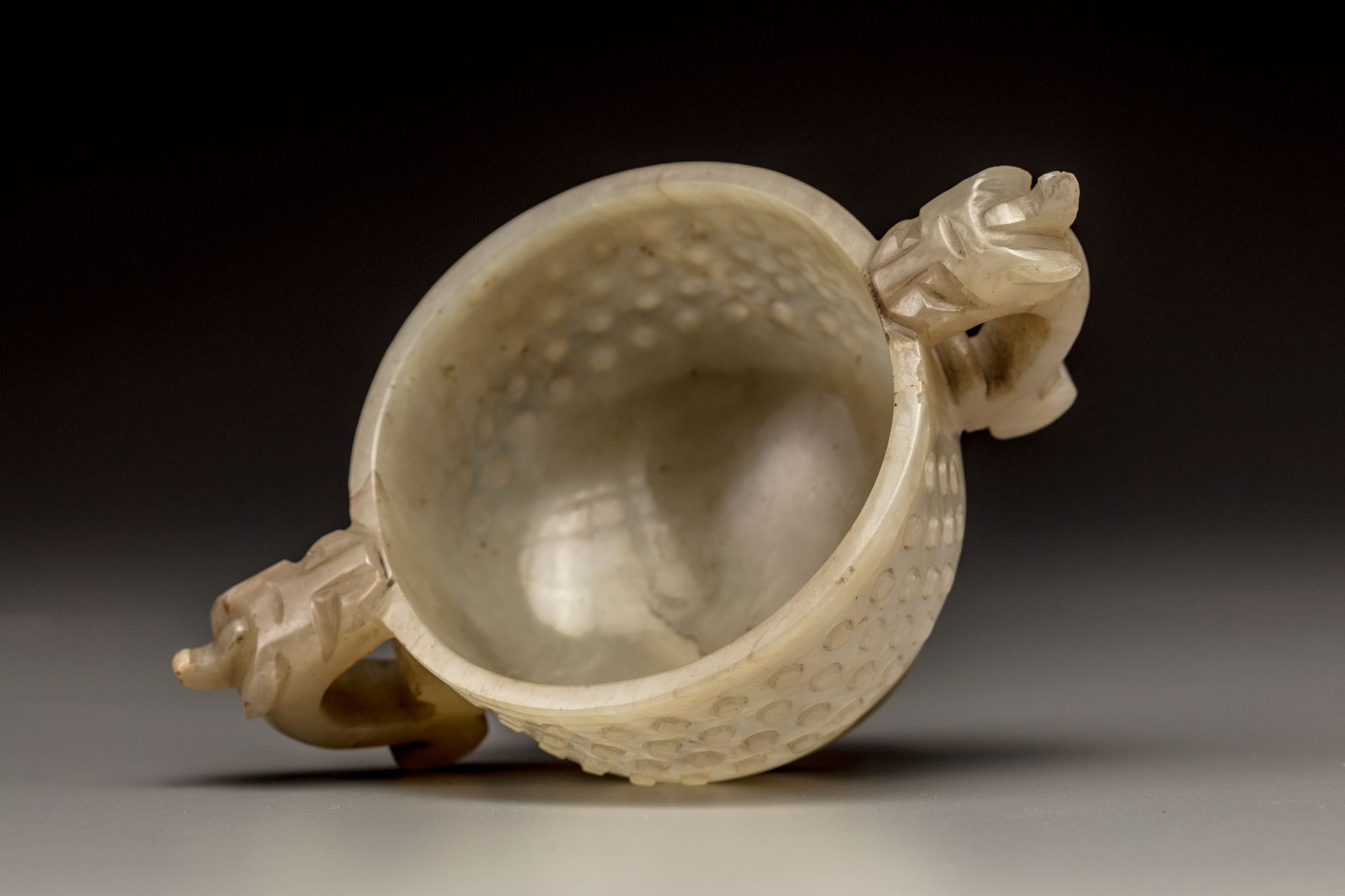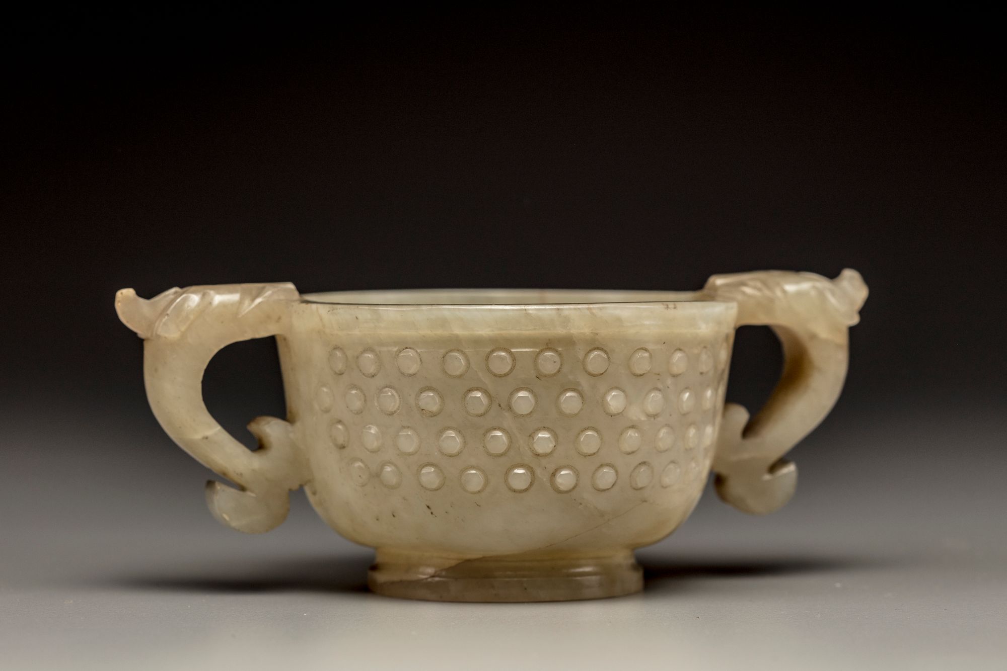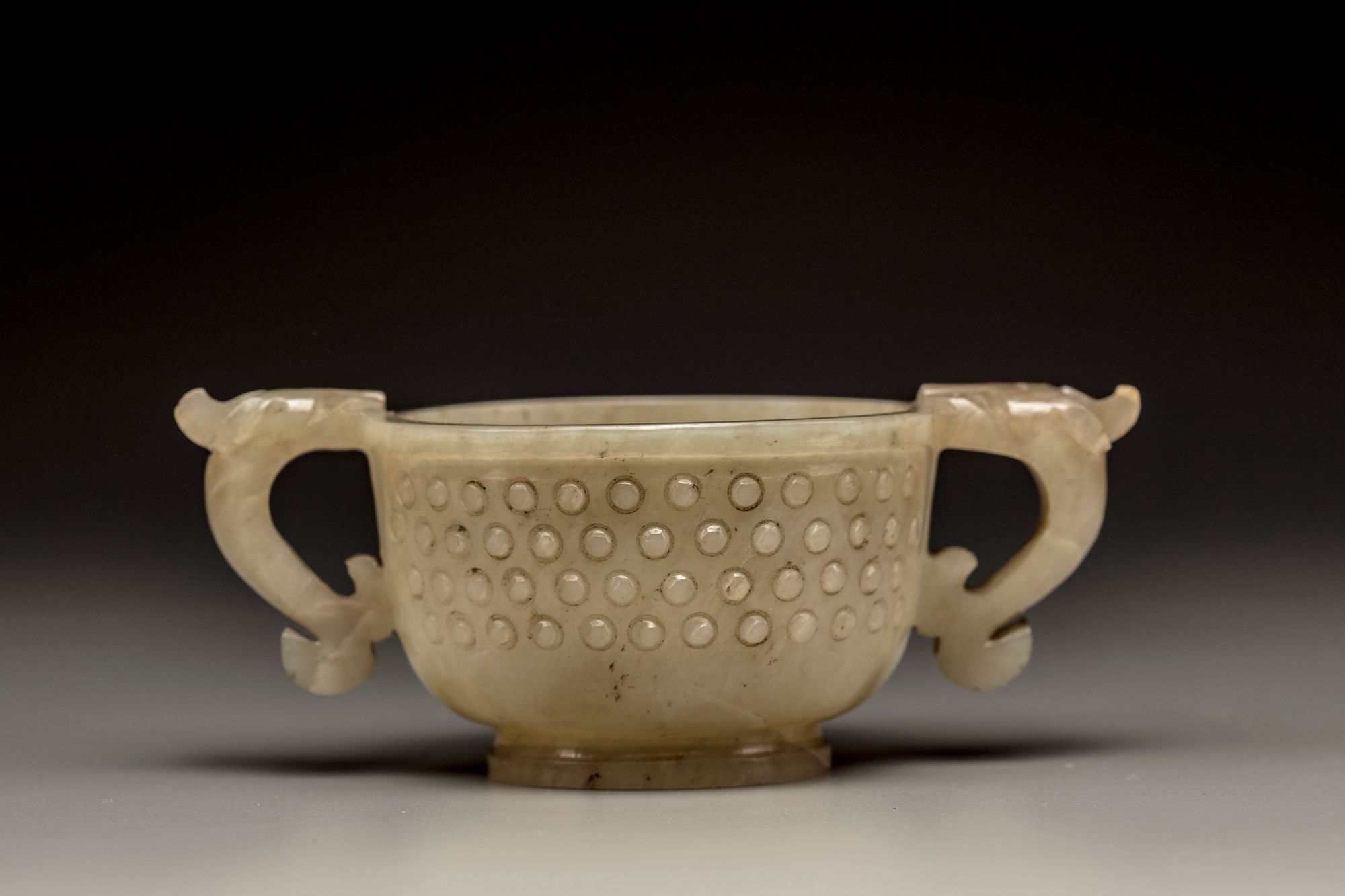 The cup is carved standing on a raised foot with two chilong-head handles to the shoulders. The body is decorated in low relief with dense rows of bosses. The stone is of a celadon tone with fine inclusions.