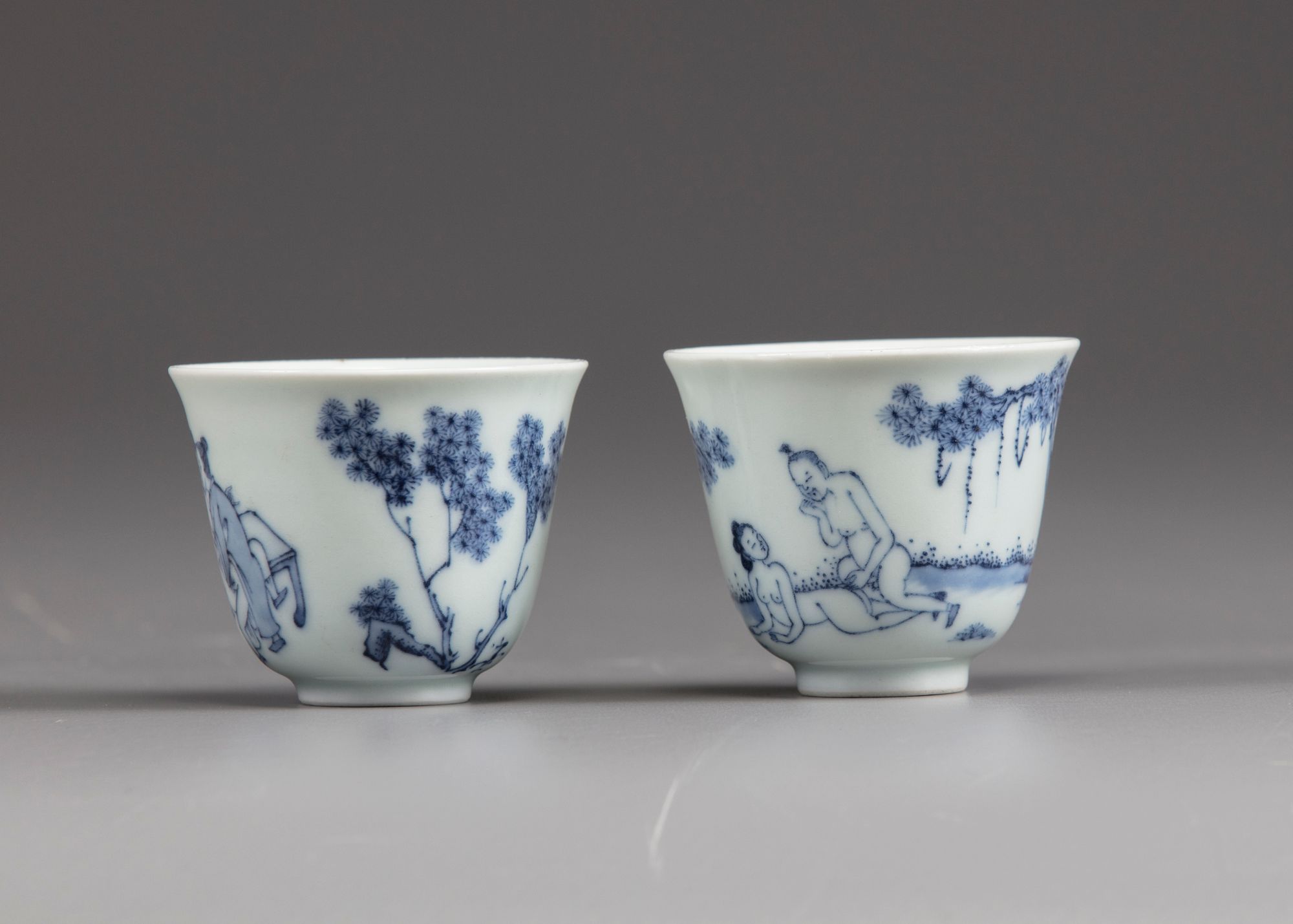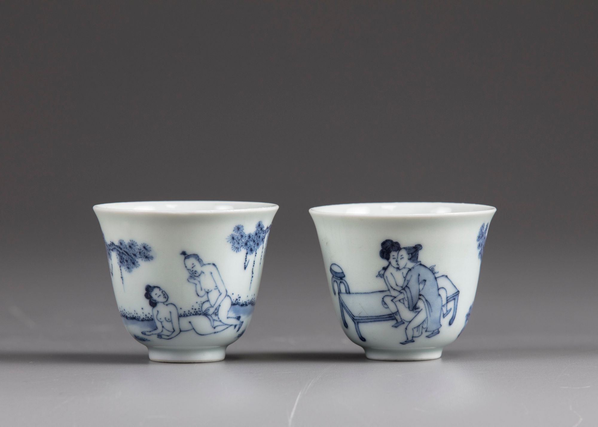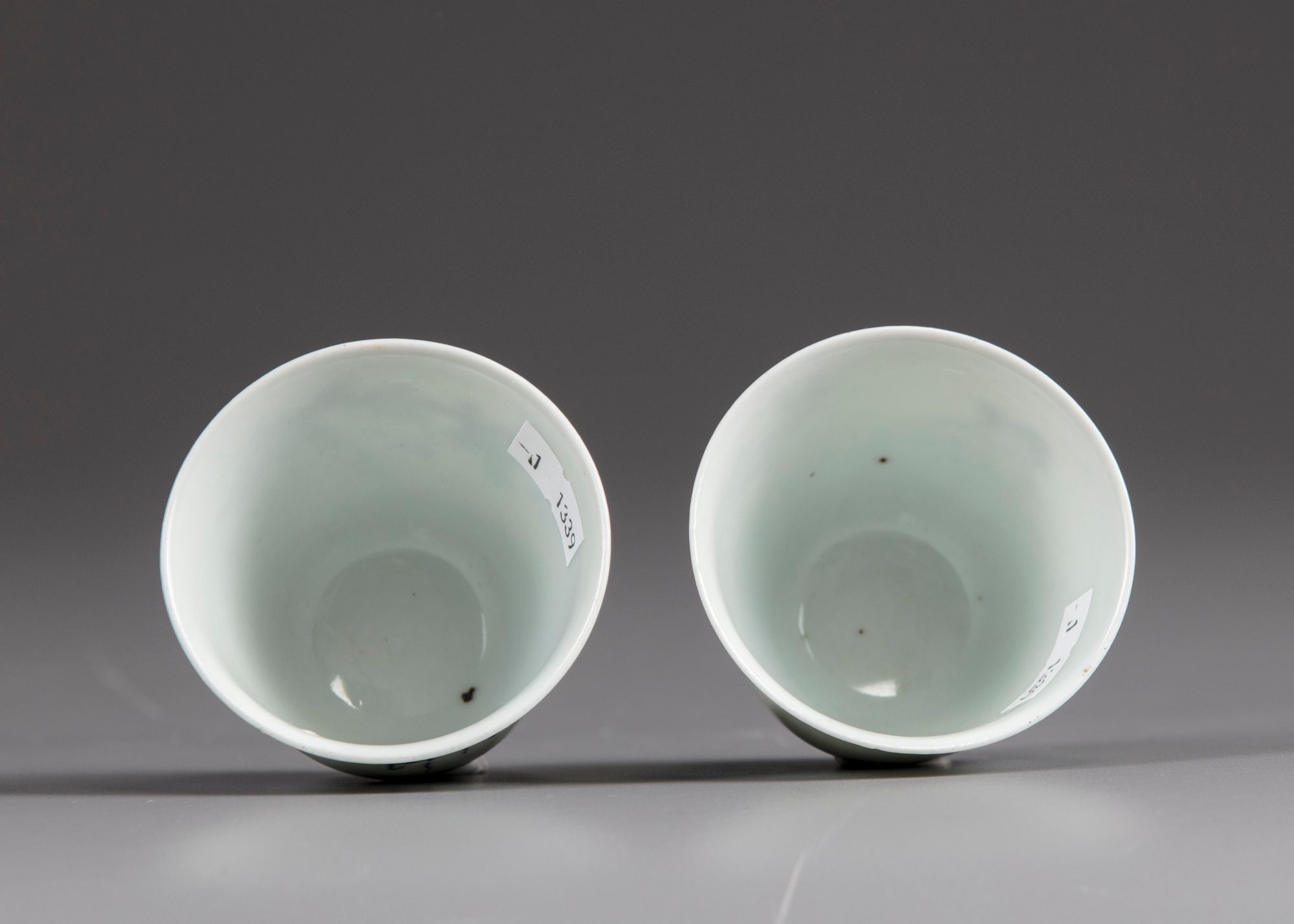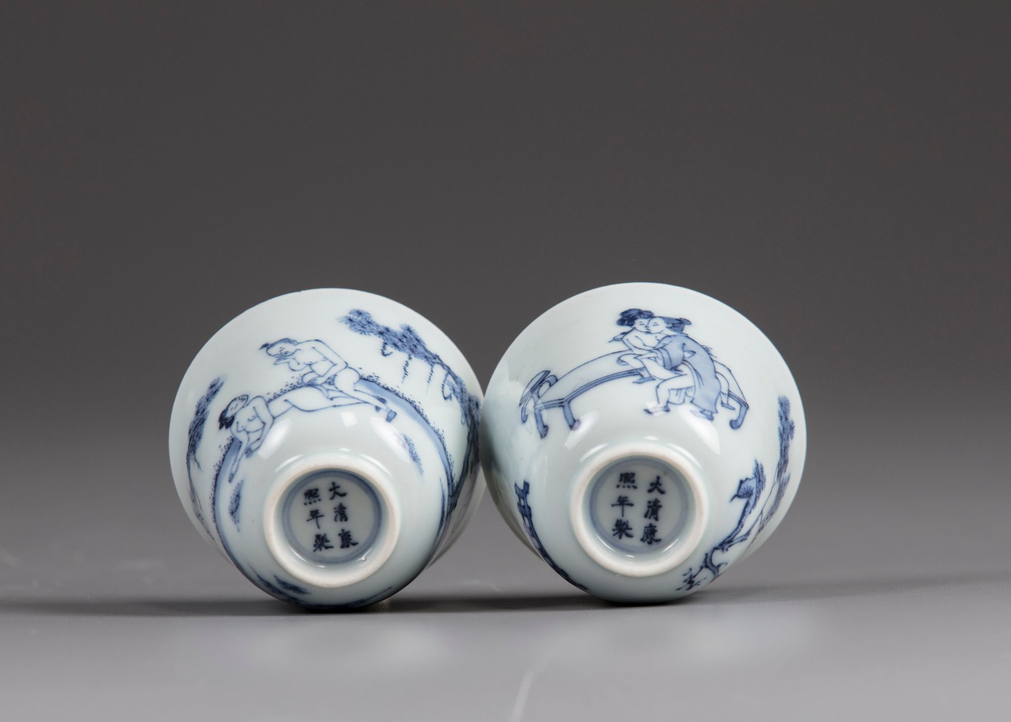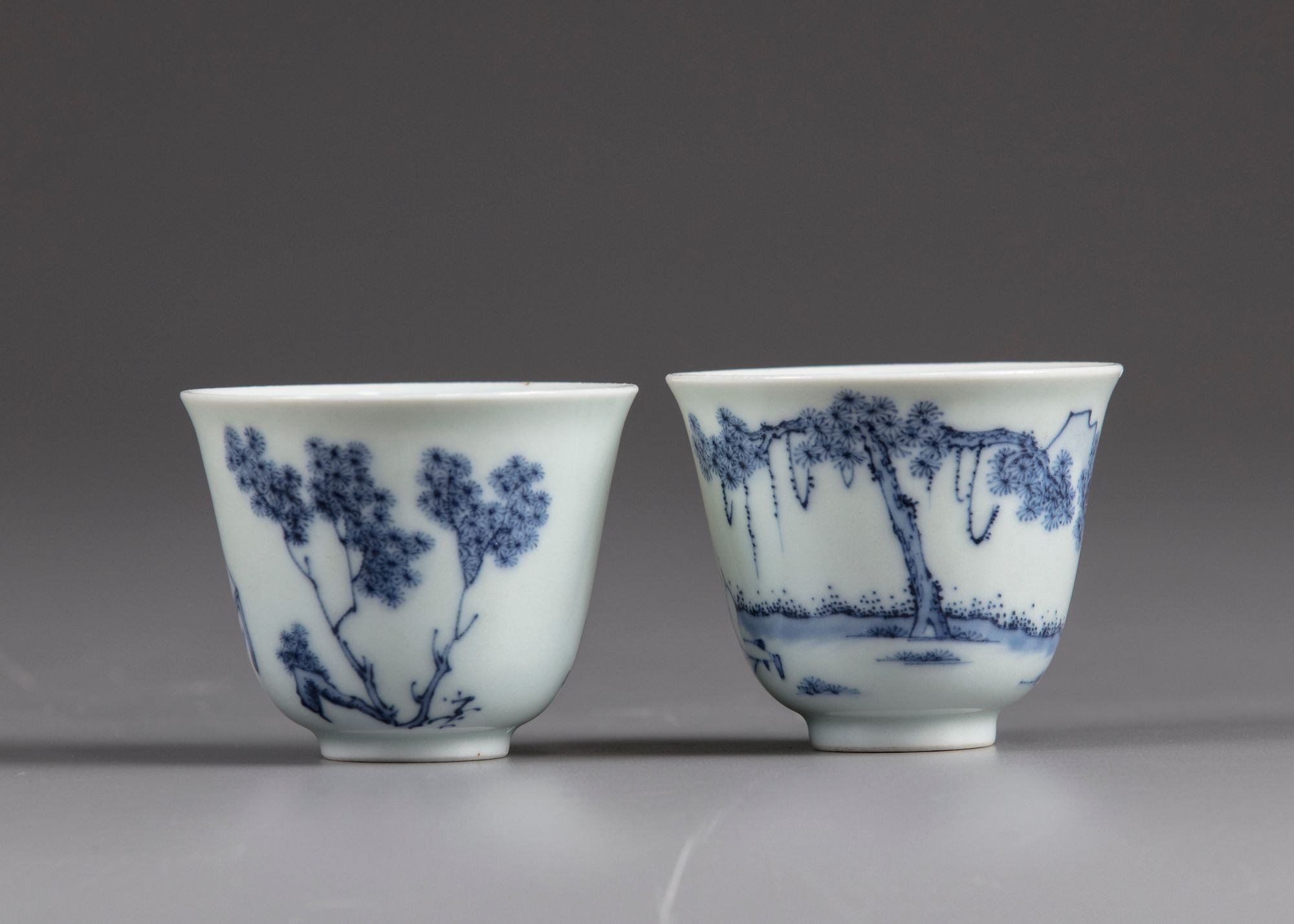 Each cup is decorated with a scene of a couple in an amorous pursuit, all below pine trees. The bases each with an apocryphal Kangxi mark.