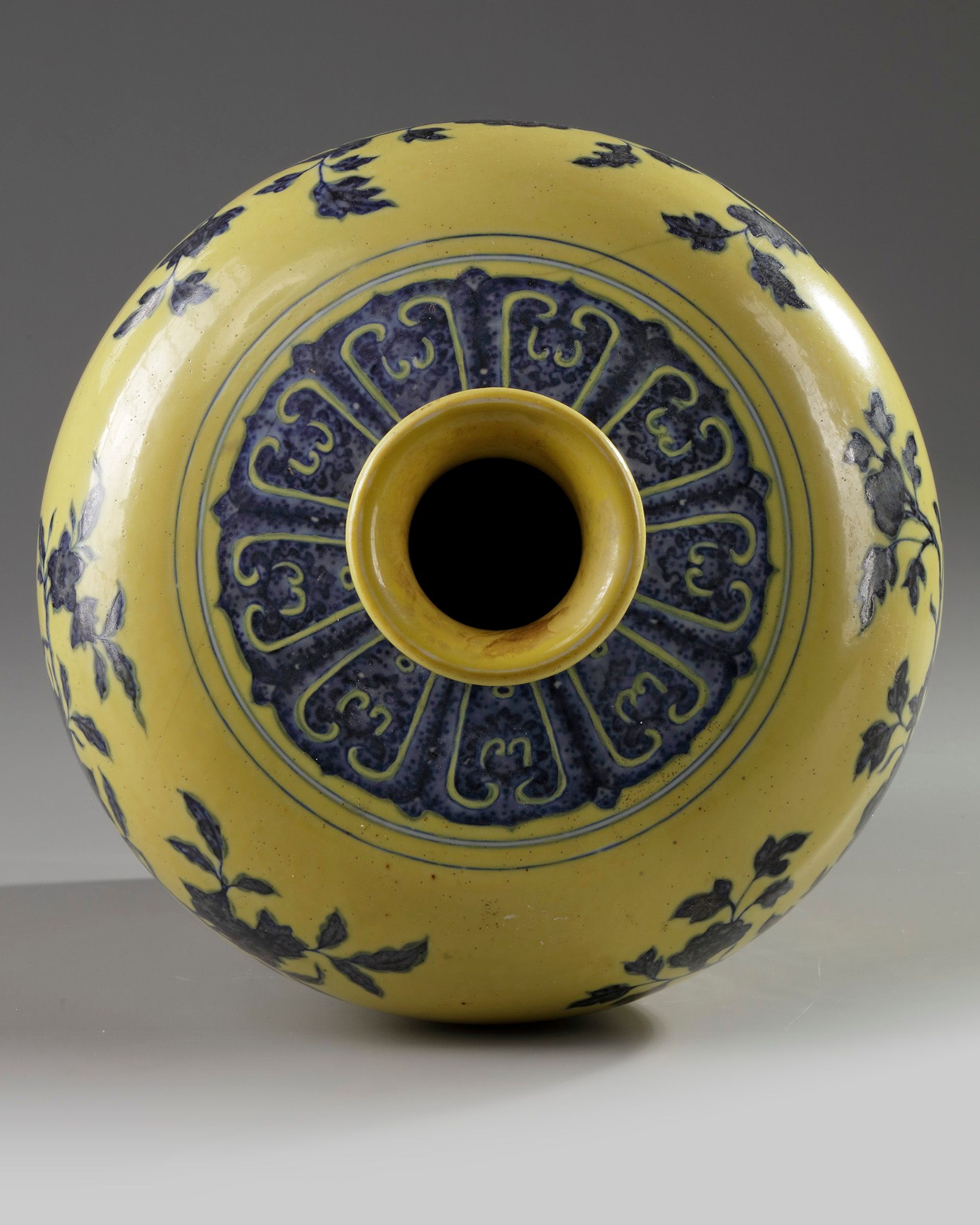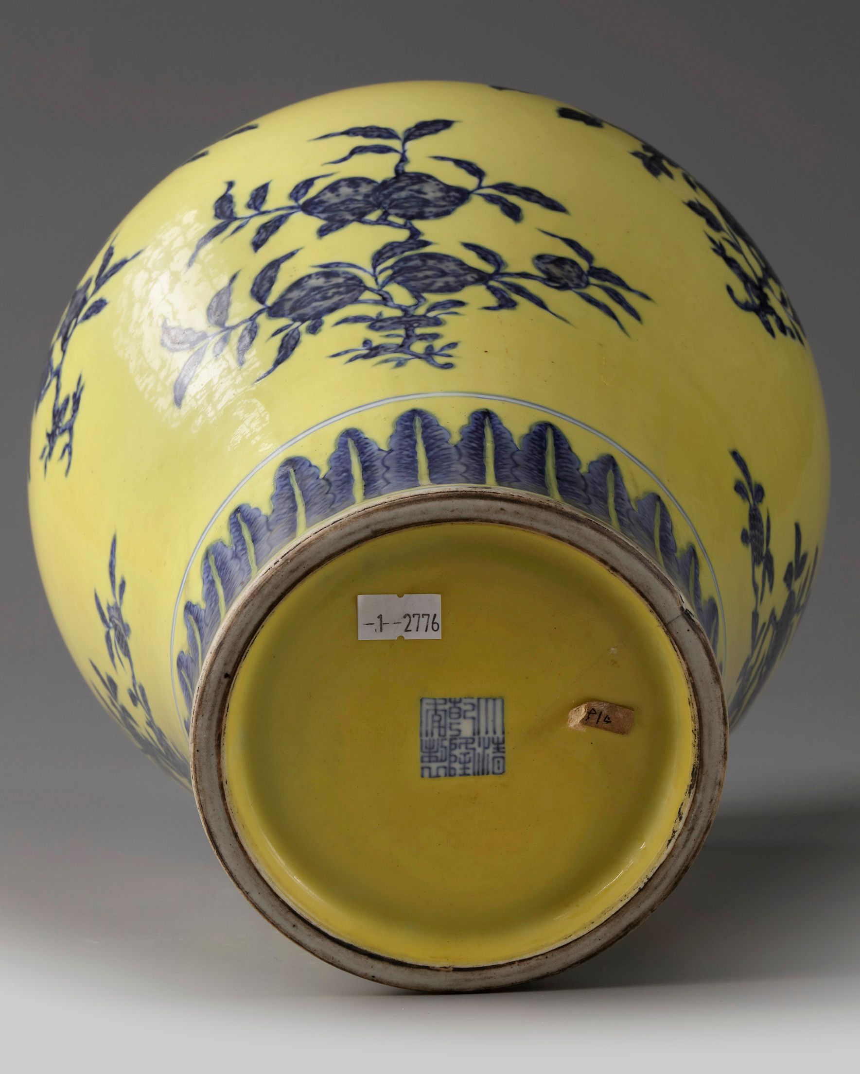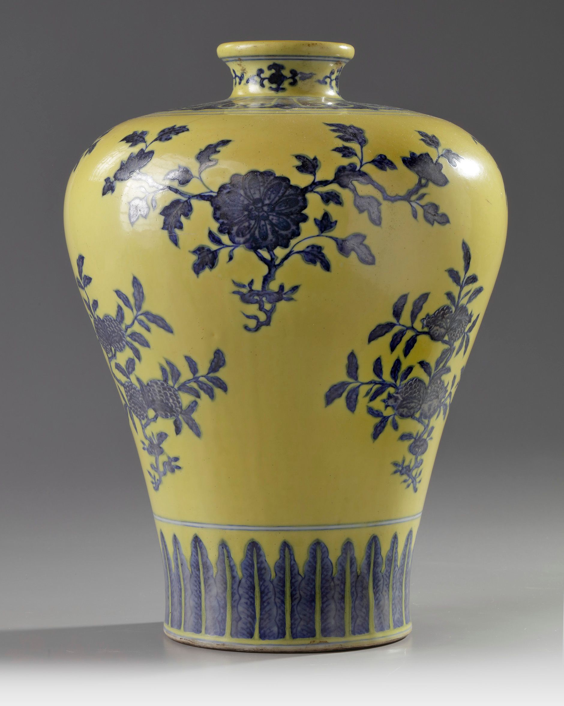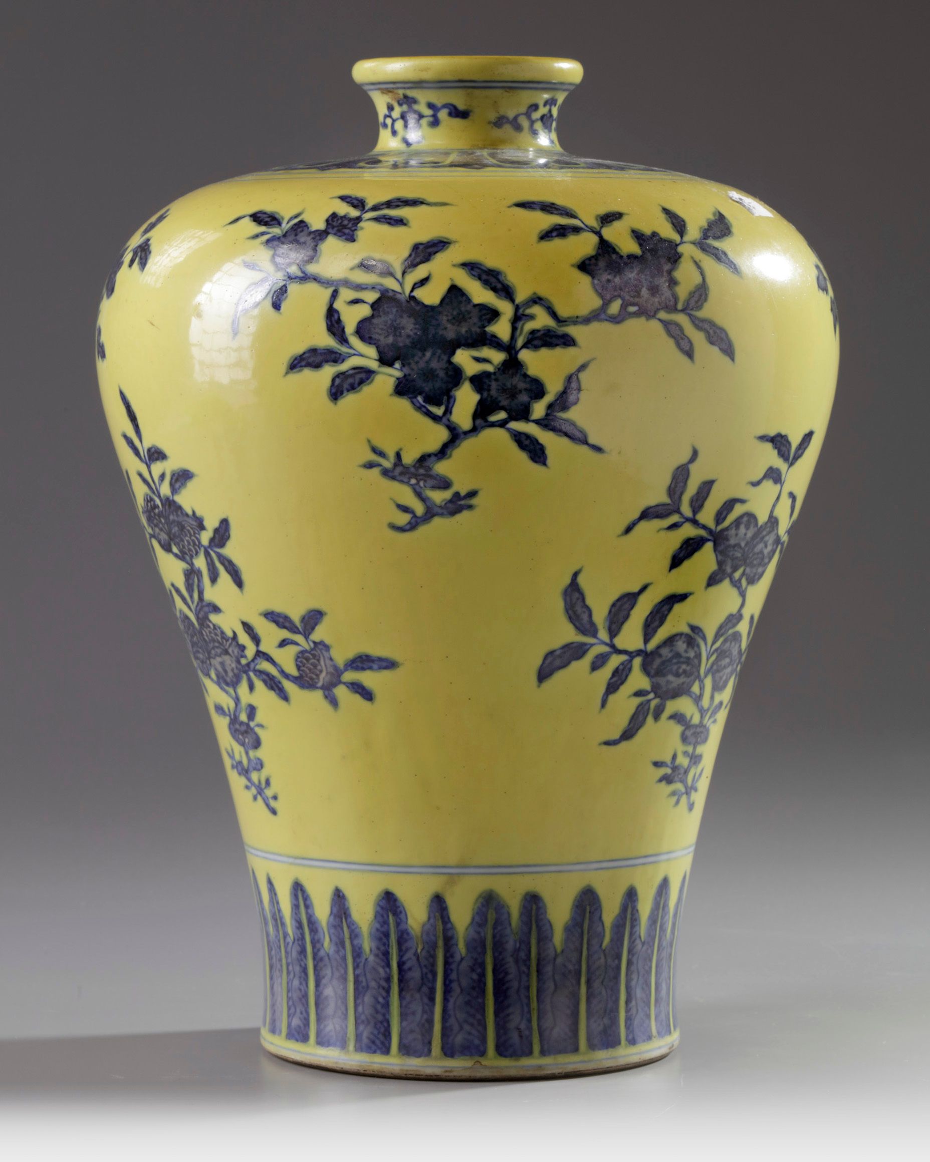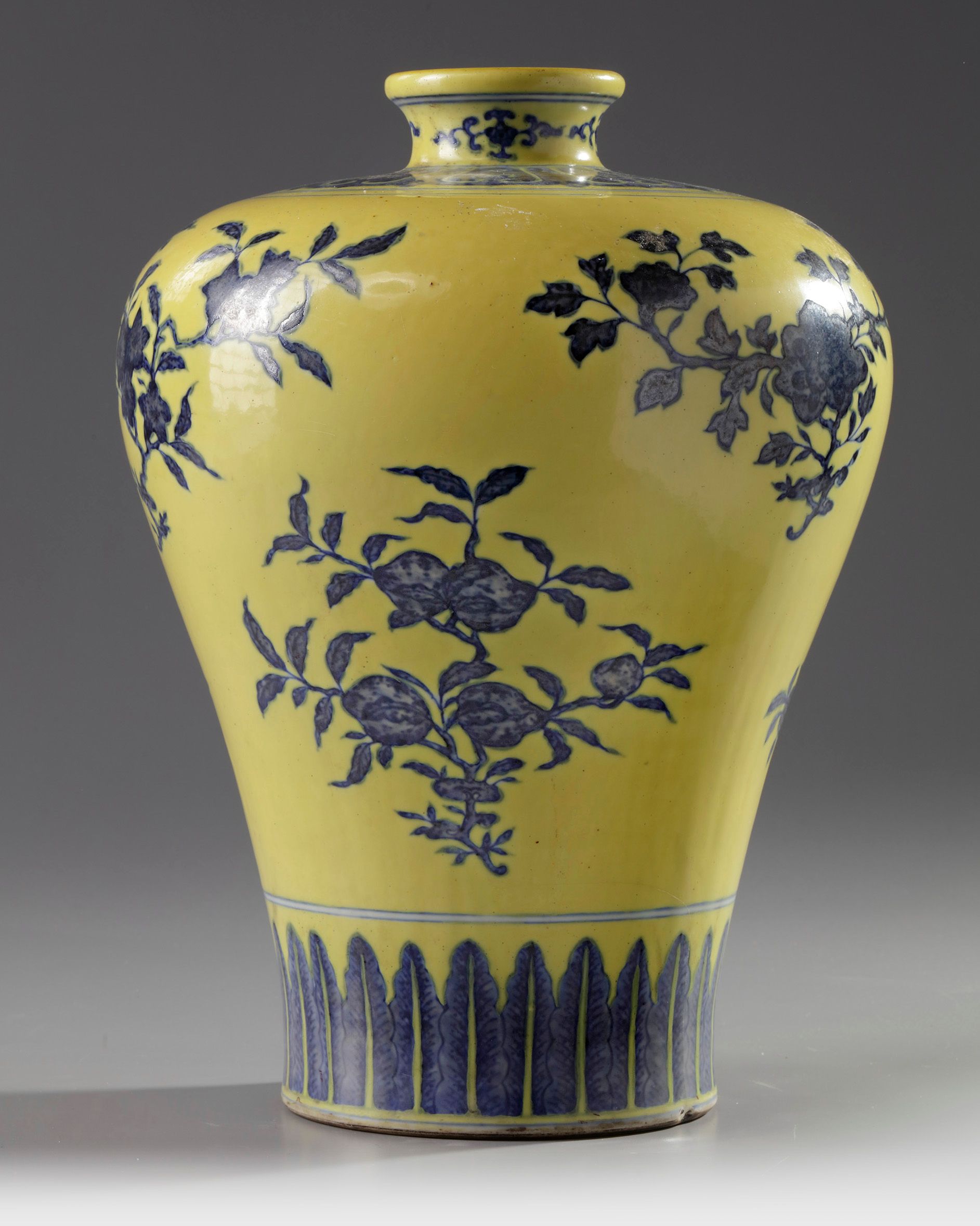 The vase is decorated to the body with the Three Abundances, sanduo, each on a leafy branch, and three different flowers also on leafy branches, in between a band of stiff leaves to the foot and a lappet band to the shoulder. The waisted neck is decorated with four flower sprays. The base with an apocryphal Qianlong mark. The ground is enamelled in an opaque lemon yellow.