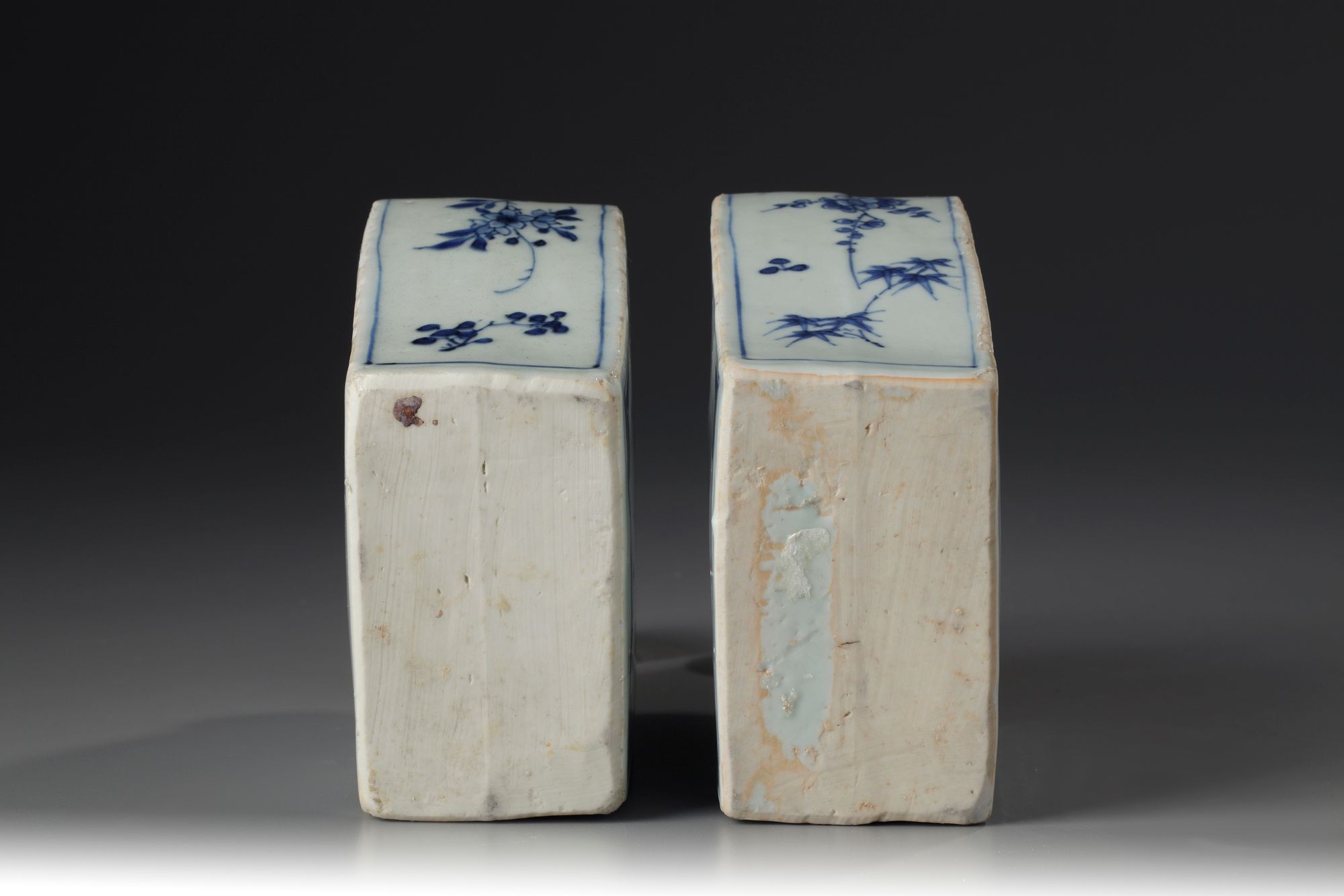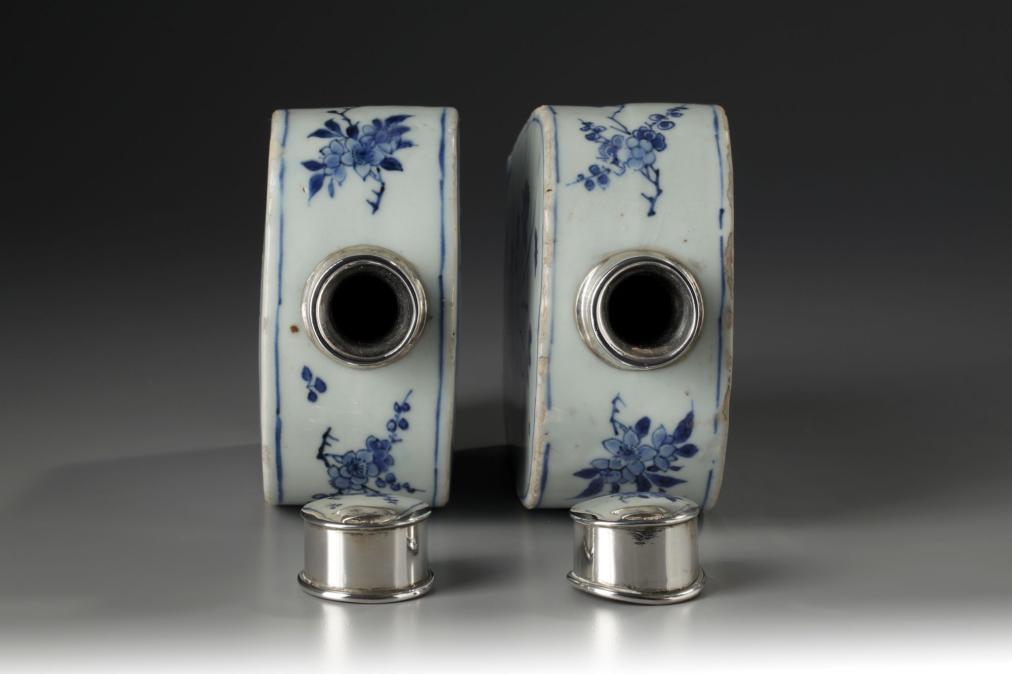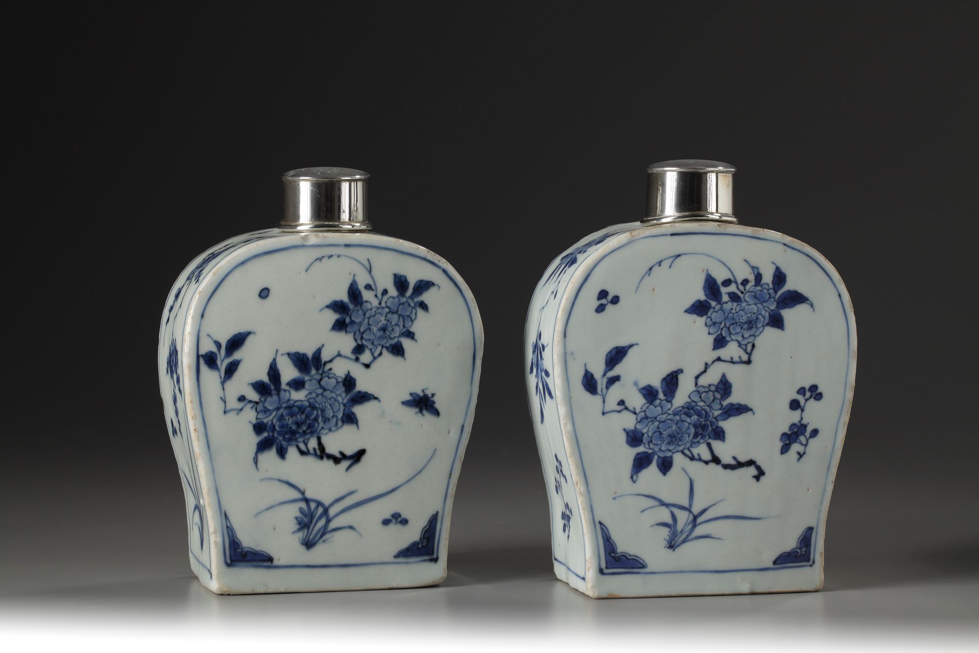 Both with flat sides decorated with peonies and blossoms to the shoulders; surmounted with later silver fitted lids.