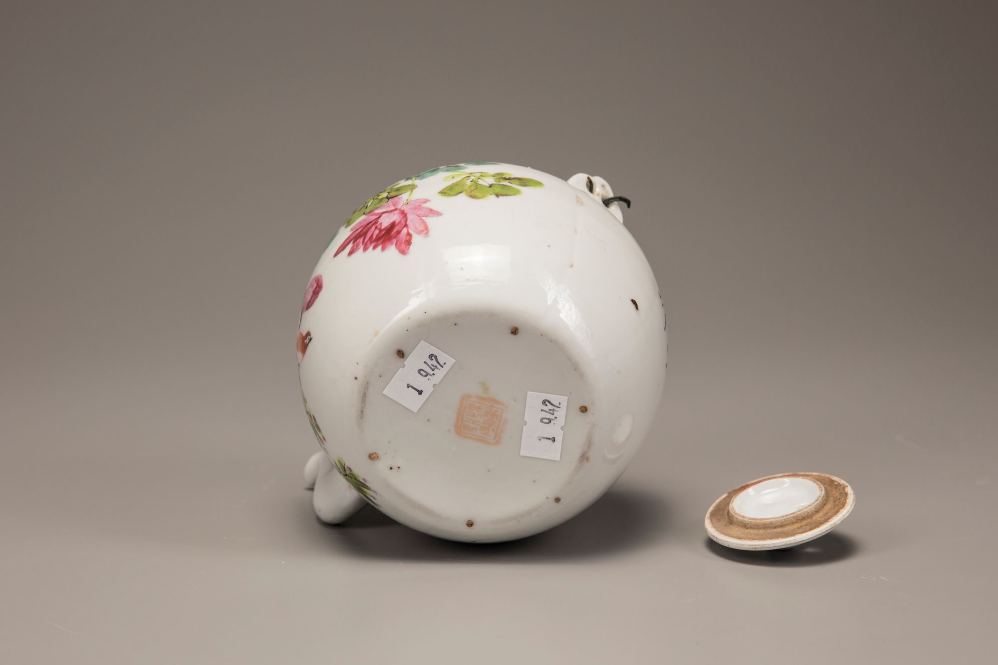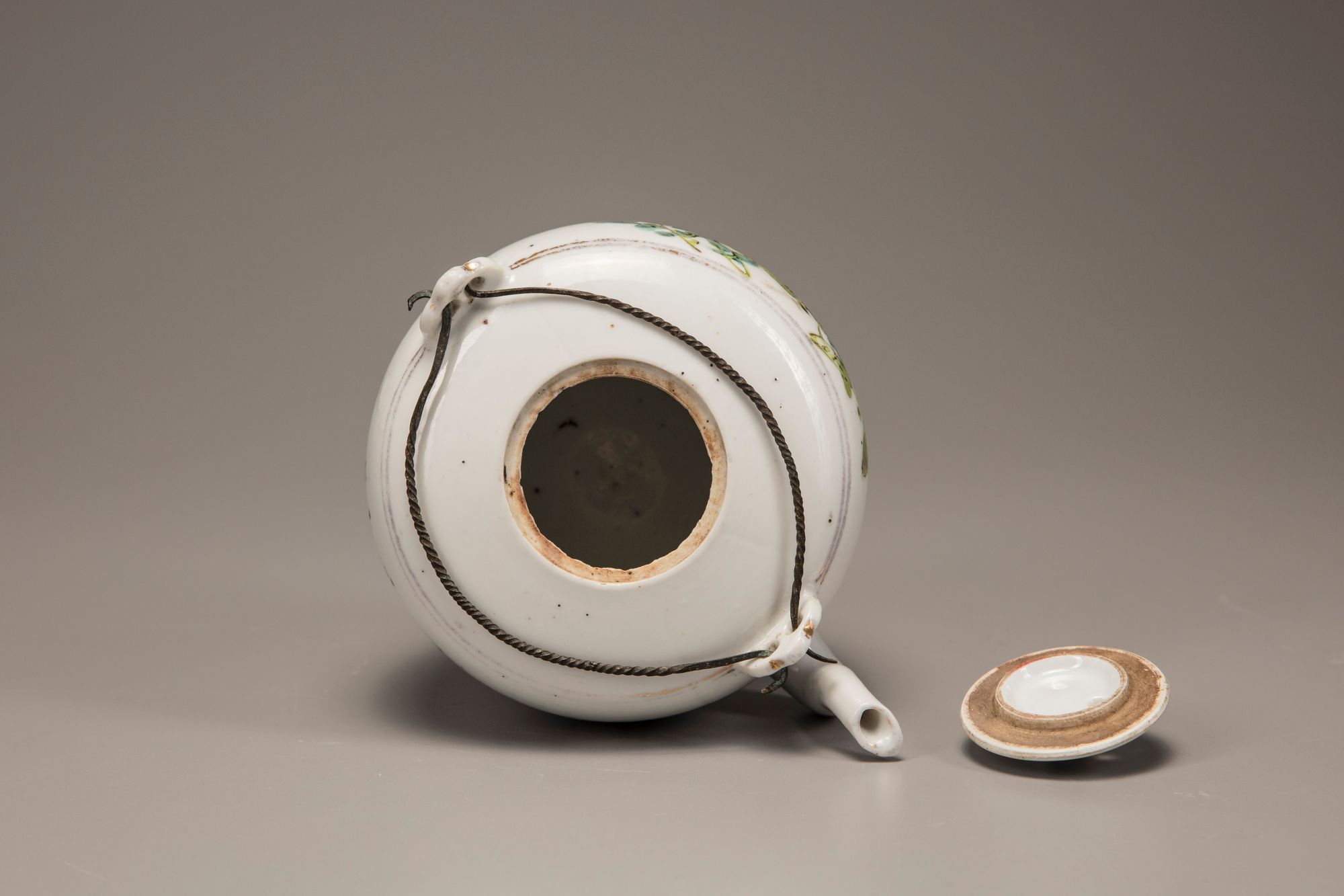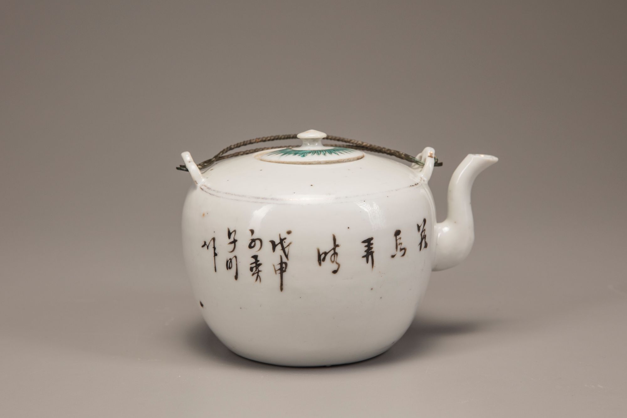 The globular teapot with two metal swing handles, and is decorated to one side with a bird on a flowering branch, and to the reverse with the scene entitled, dated, and signed 'Zi Chuan'. The base with an apocryphal stamped iron-red Tongzhi mark. The finial of the cover is surrounded by a leaf band.