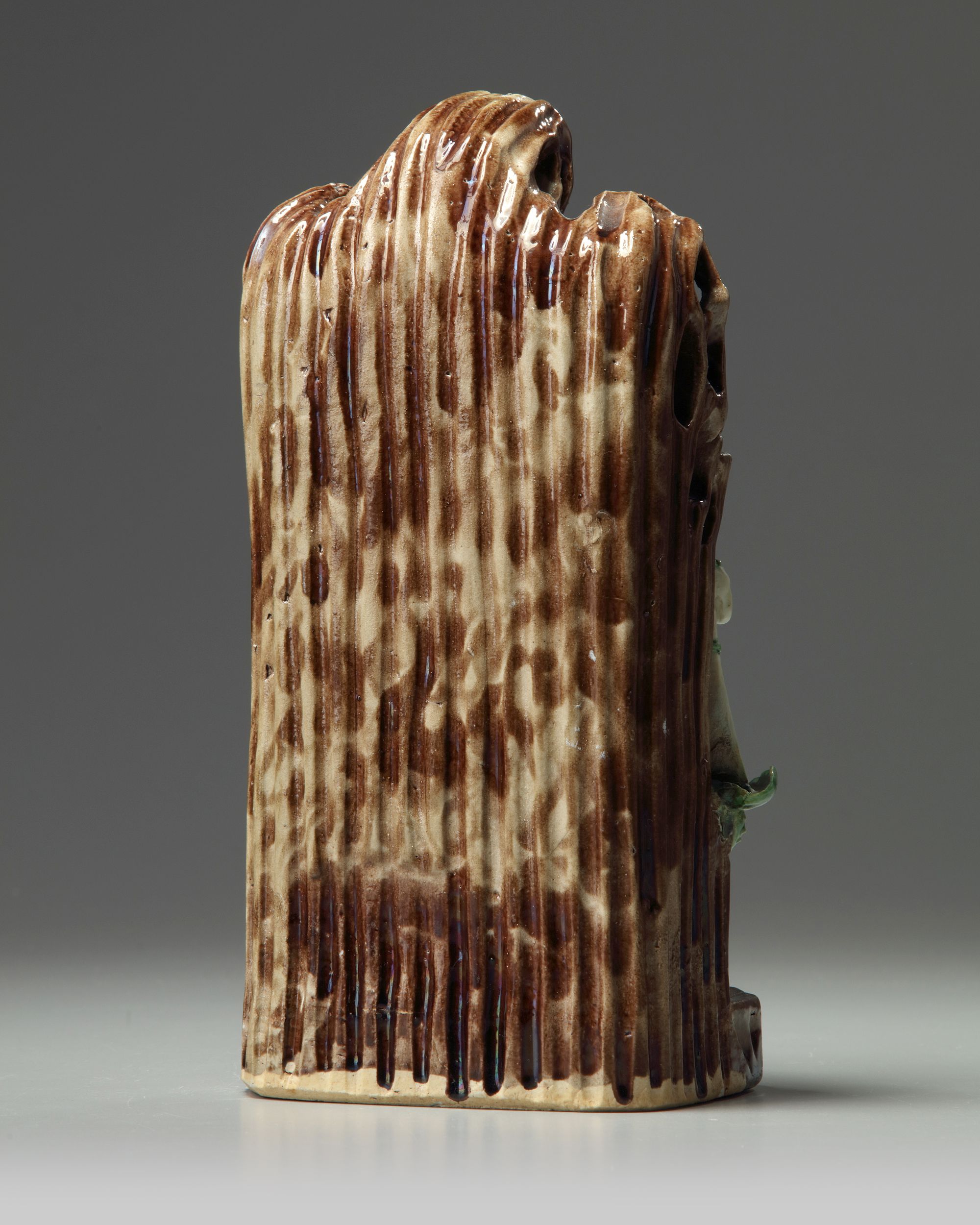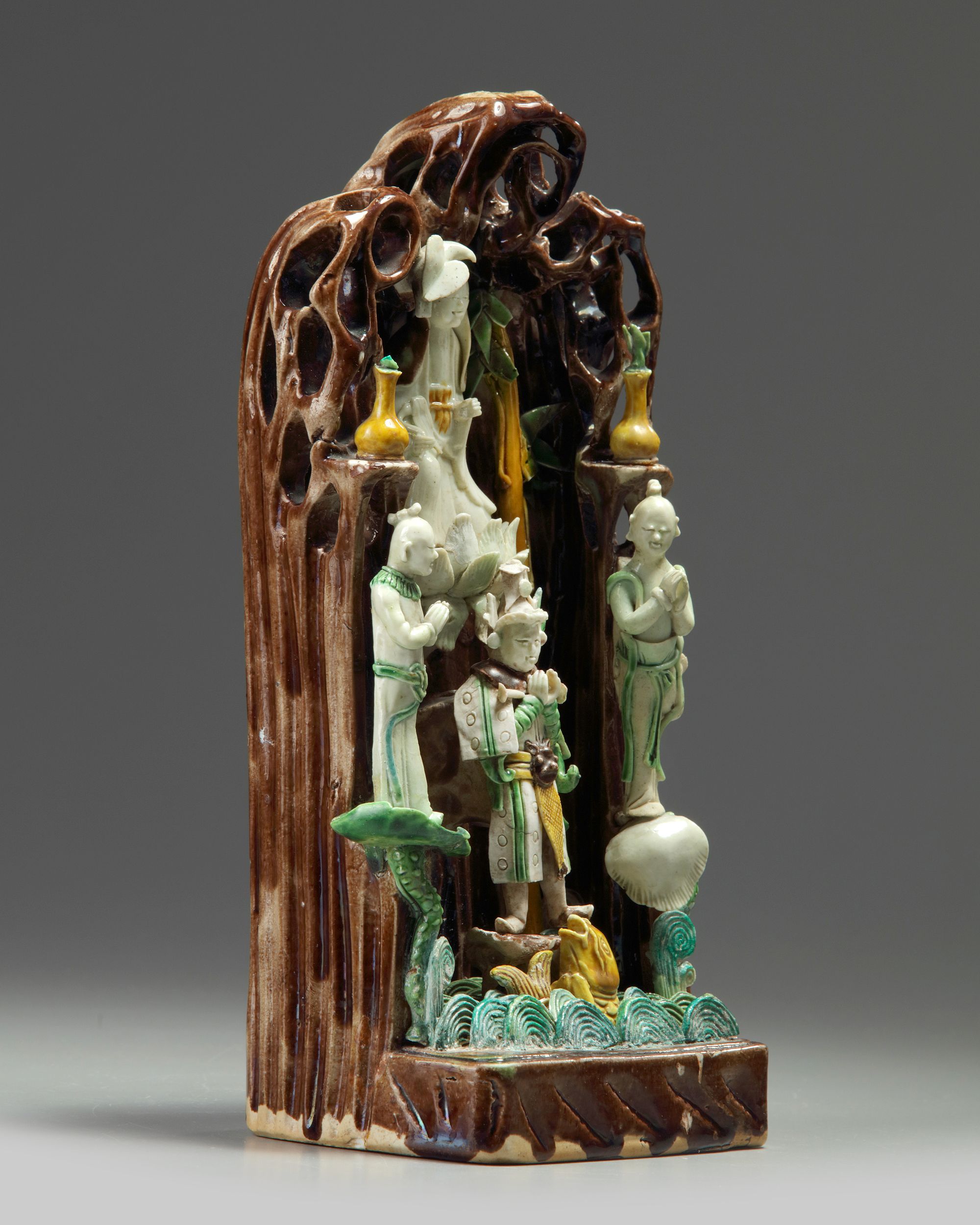 The grotto depicts a standing Guanyin with two attendants on lotus stems, all above a further Immortal and a carp leaping from waves.