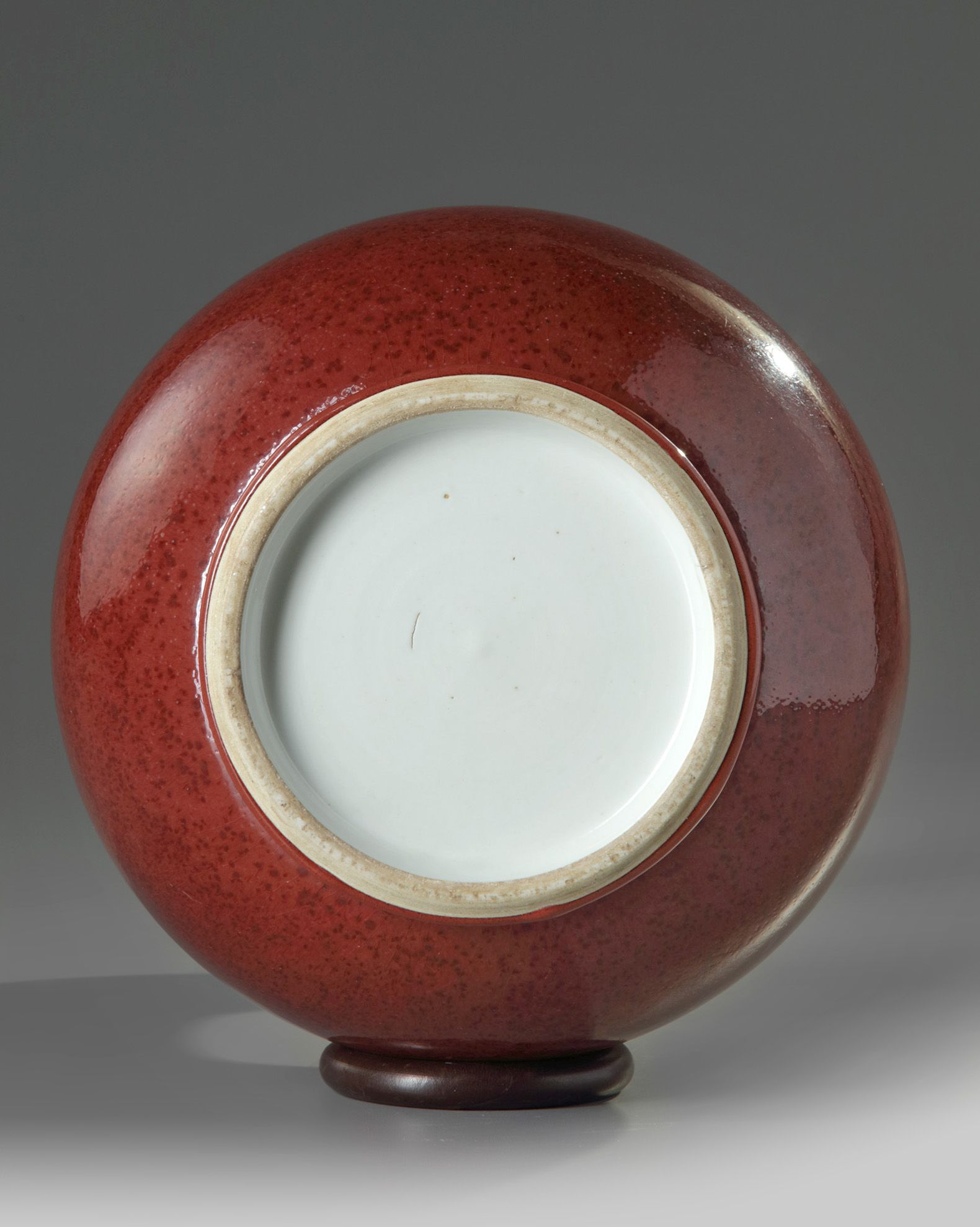 The vase is of an elegant form with a pear shaped lower section leading to a slender neck and flaring rim, the exterior is covered in a bubble-suffused glaze of crushed strawberry tone. The interior and base are glazed white.