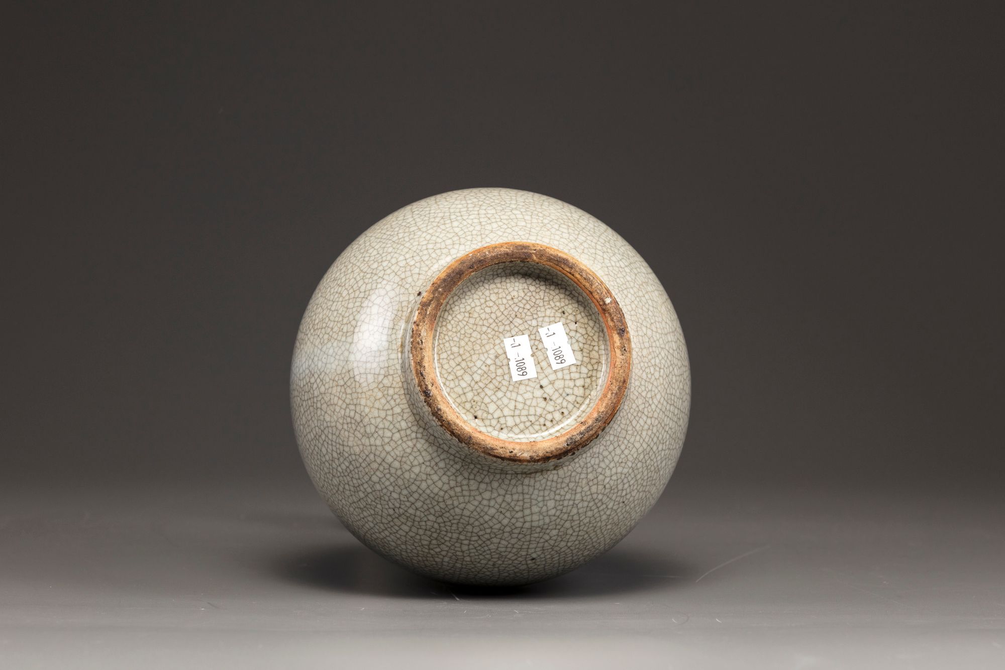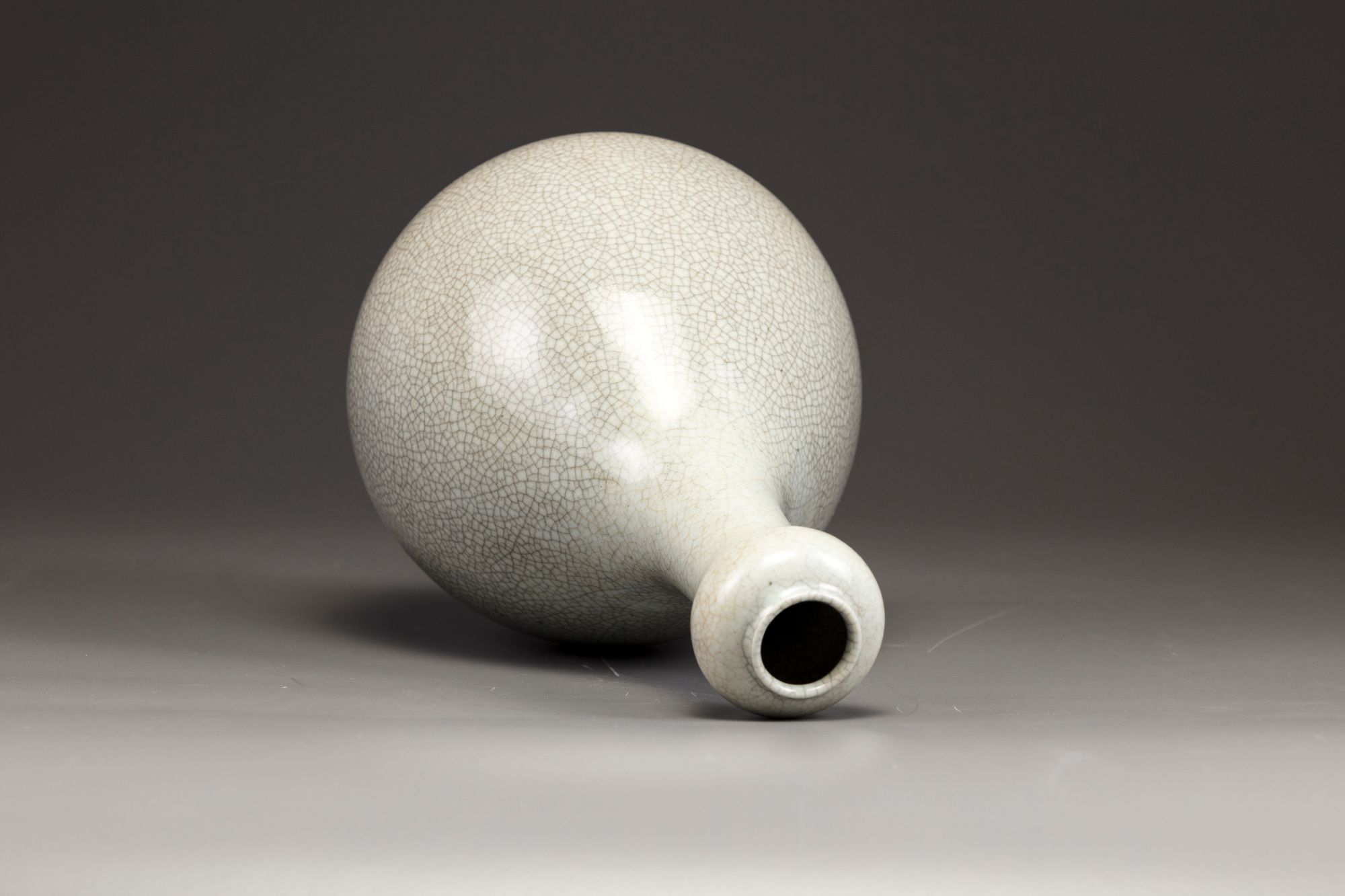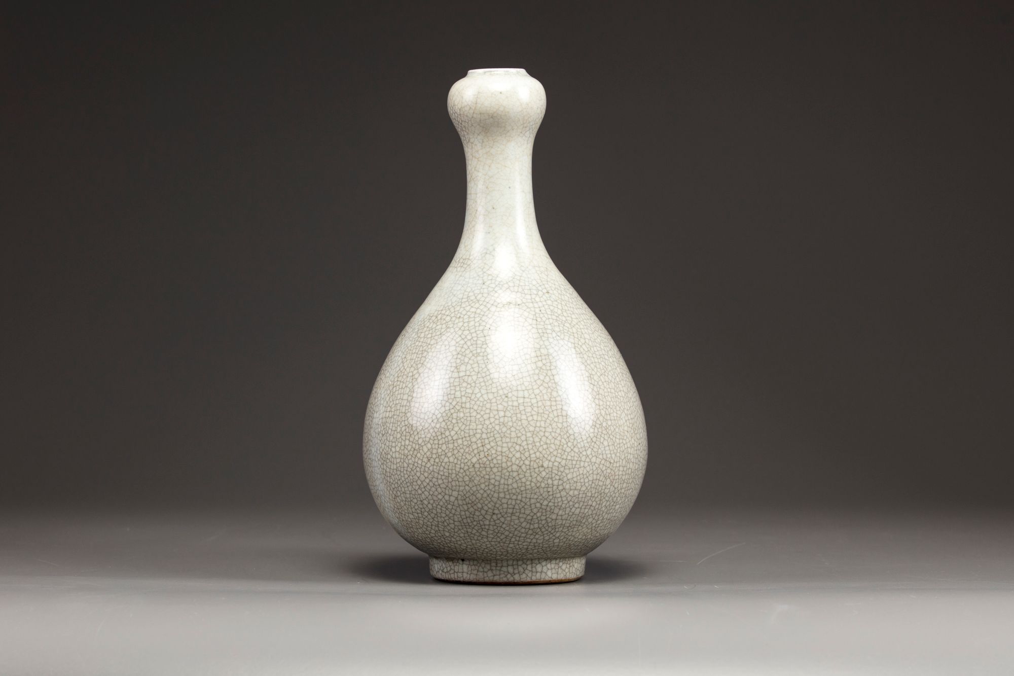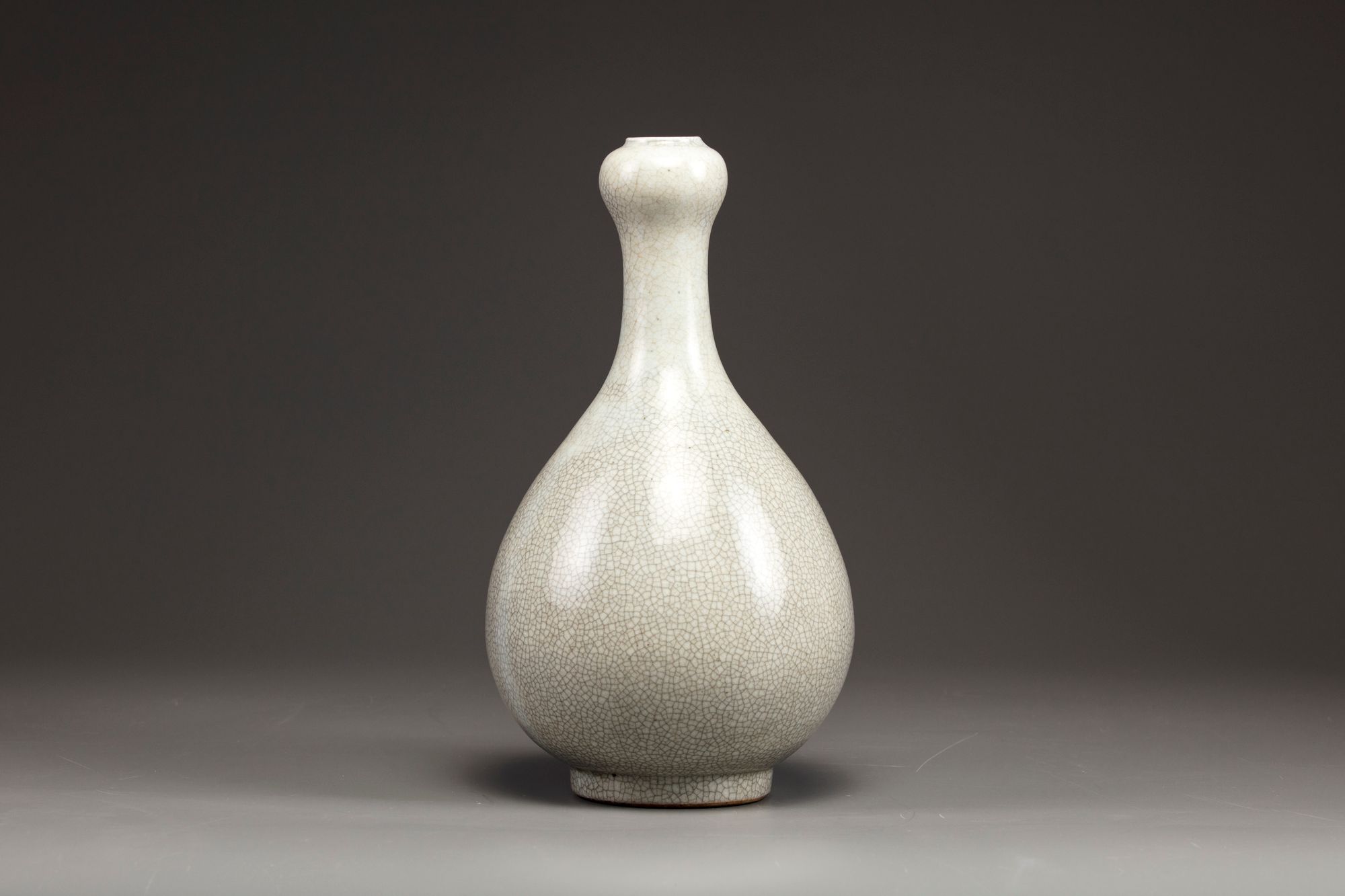 The pear-shaped body rises to a tall cylindrical neck surmounted by a garlic bulb-shaped mouth. The vase is covered overall with a soft crackled glaze of pale grey tone.