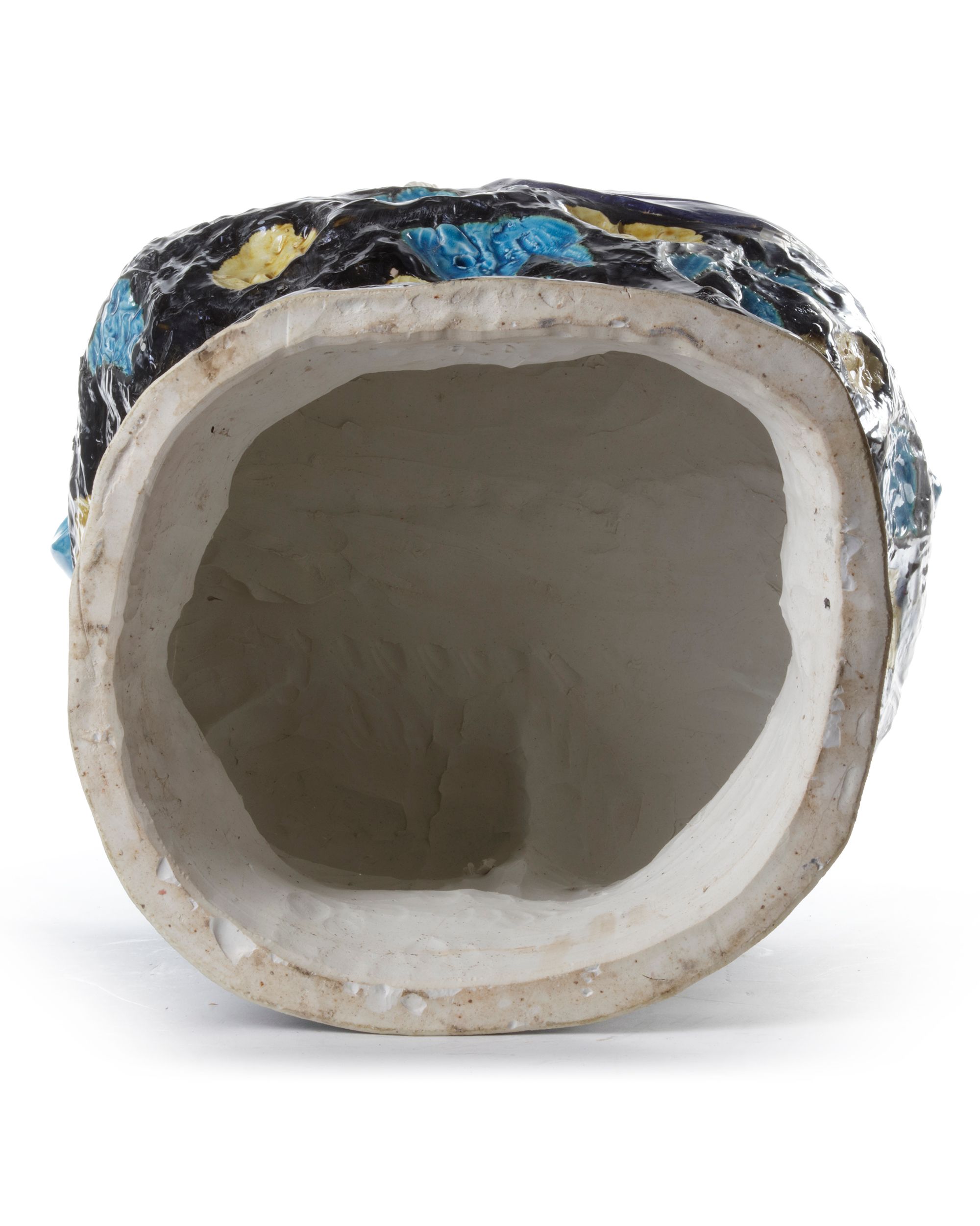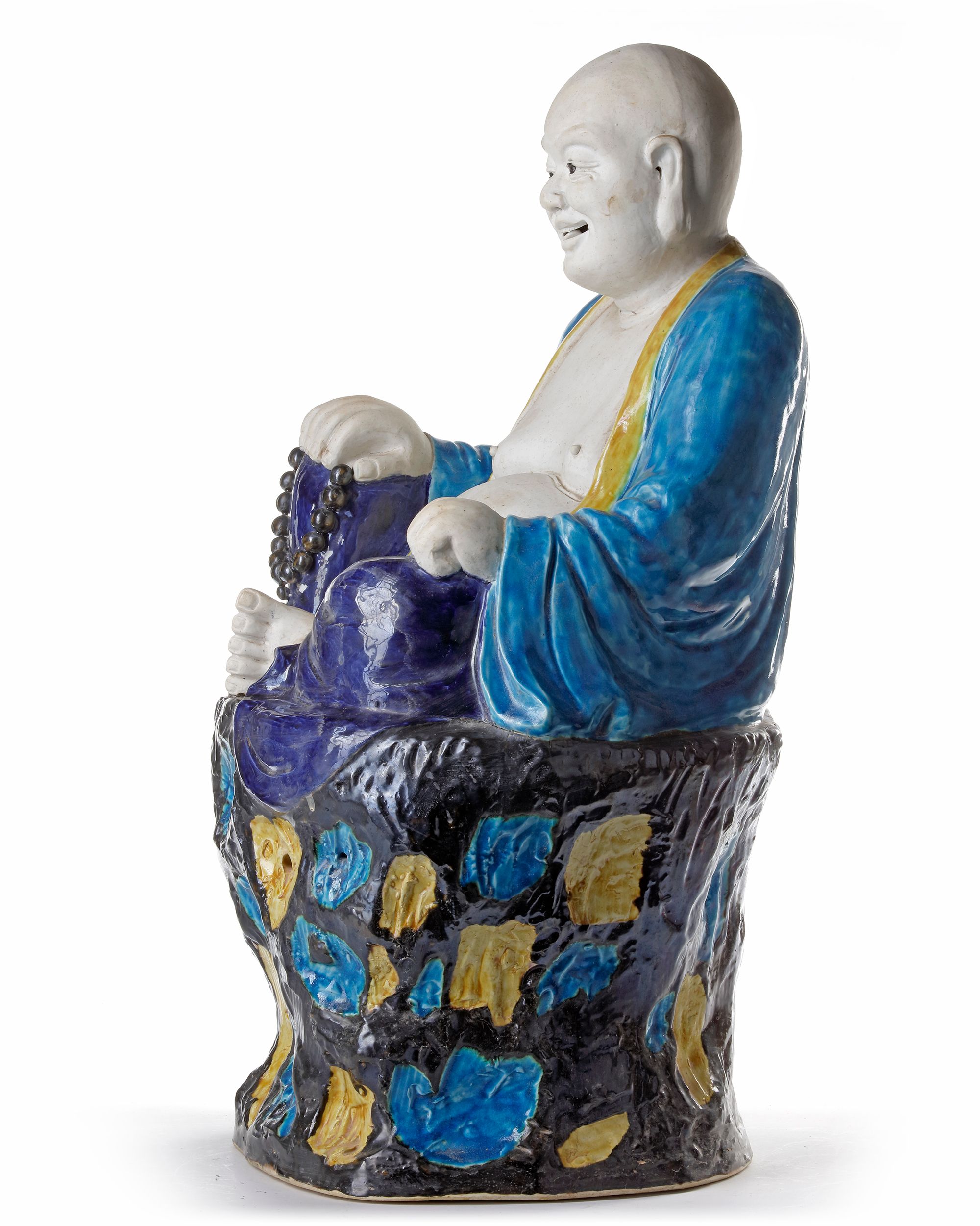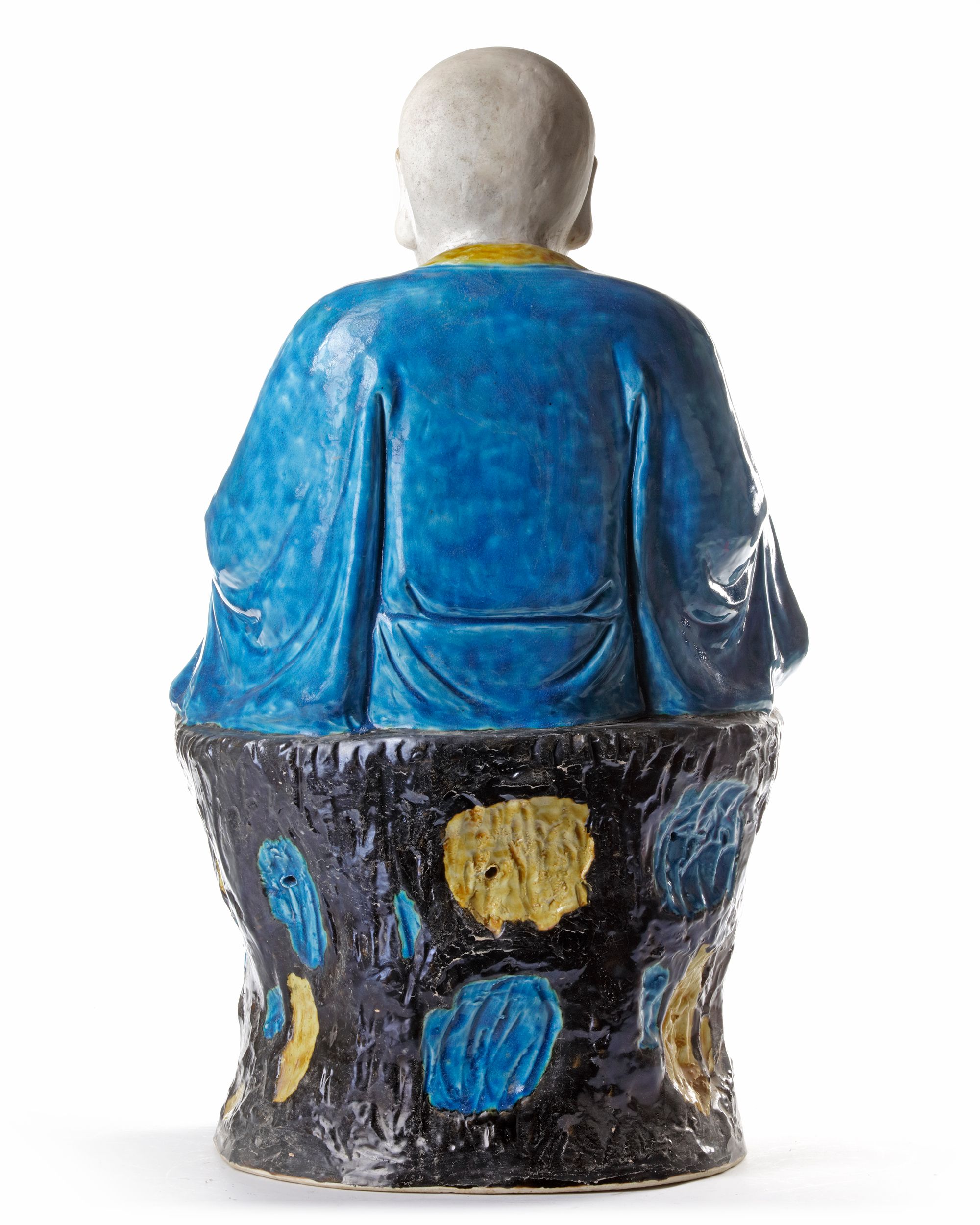 Glazed with a fahua glaze, his uncovered body is left unglazed. 60 cm.