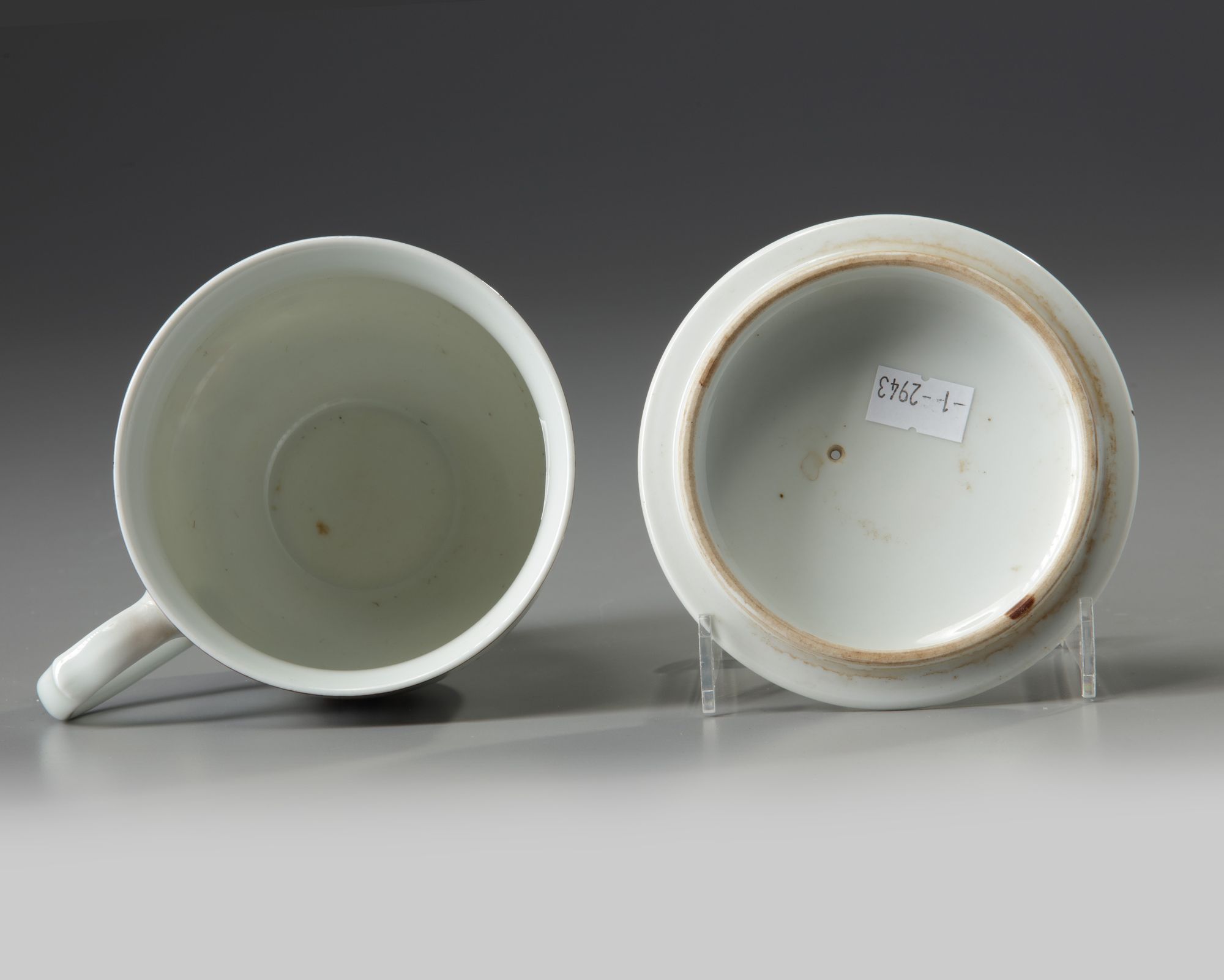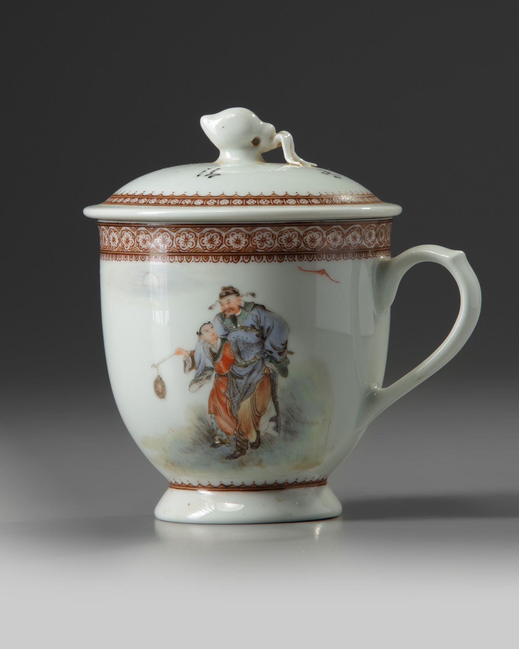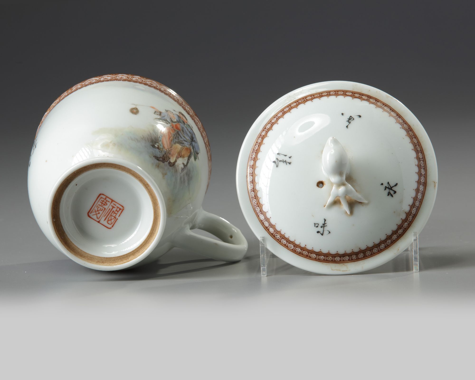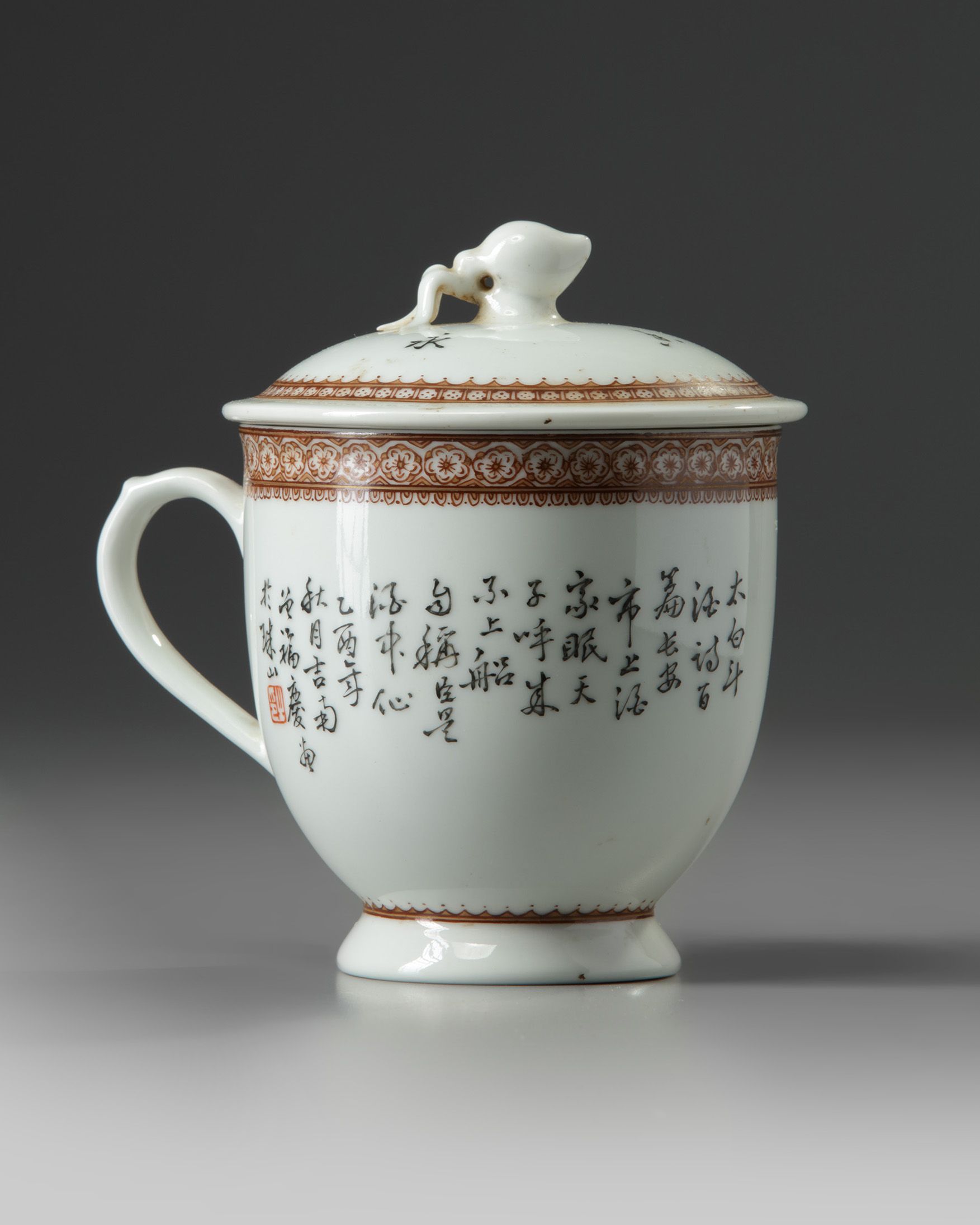 The cup is decorate to one side with the poet Li Bai and his attendant walking in the moonlight below a bat in flight all below an iron-red and gilt floral border at the rim. The reverse is inscribed with a poem and dated autumn of jichou year and signed Hui Fuqing. The domed cover is similarly decorated and is surmounted by a peach finial.