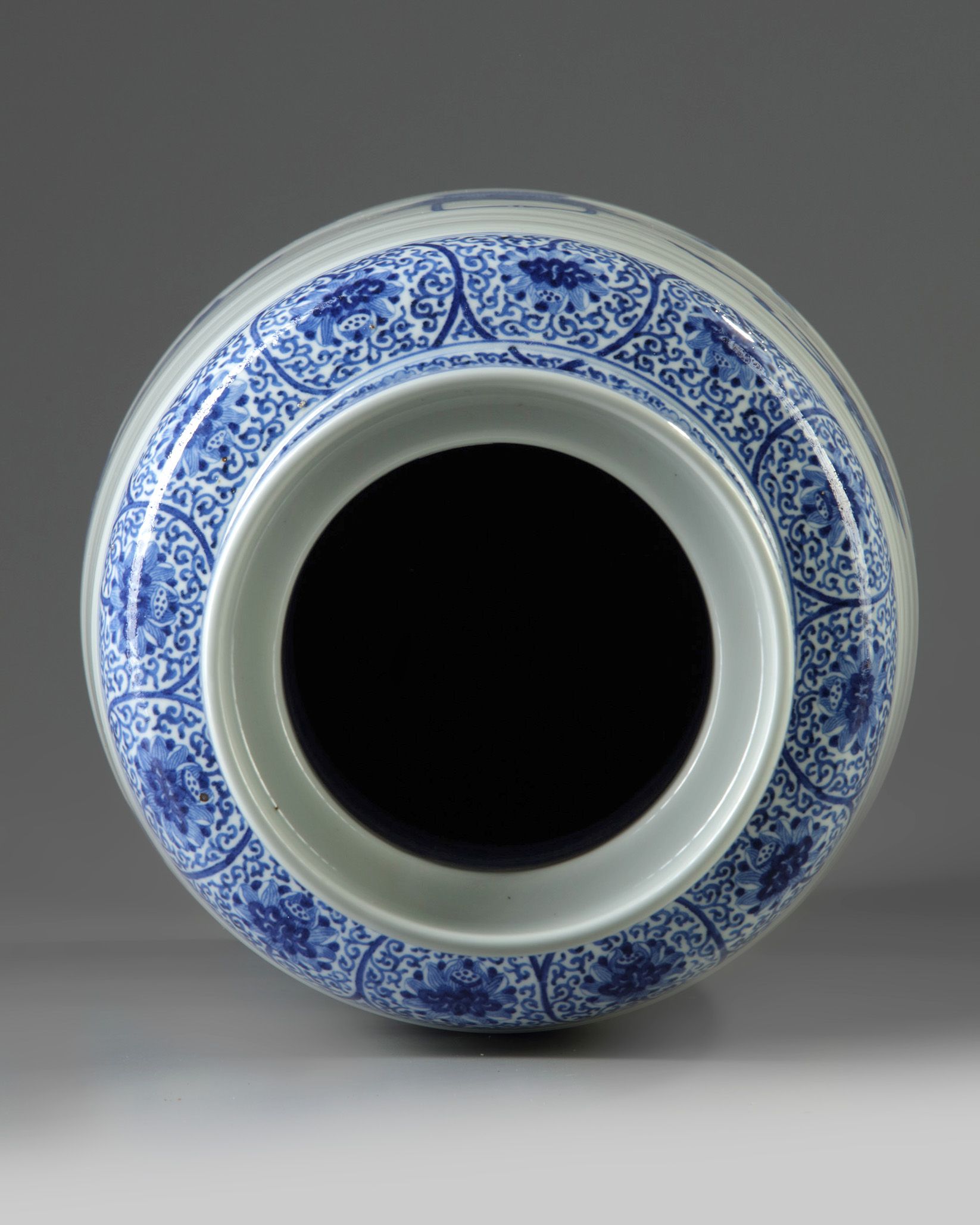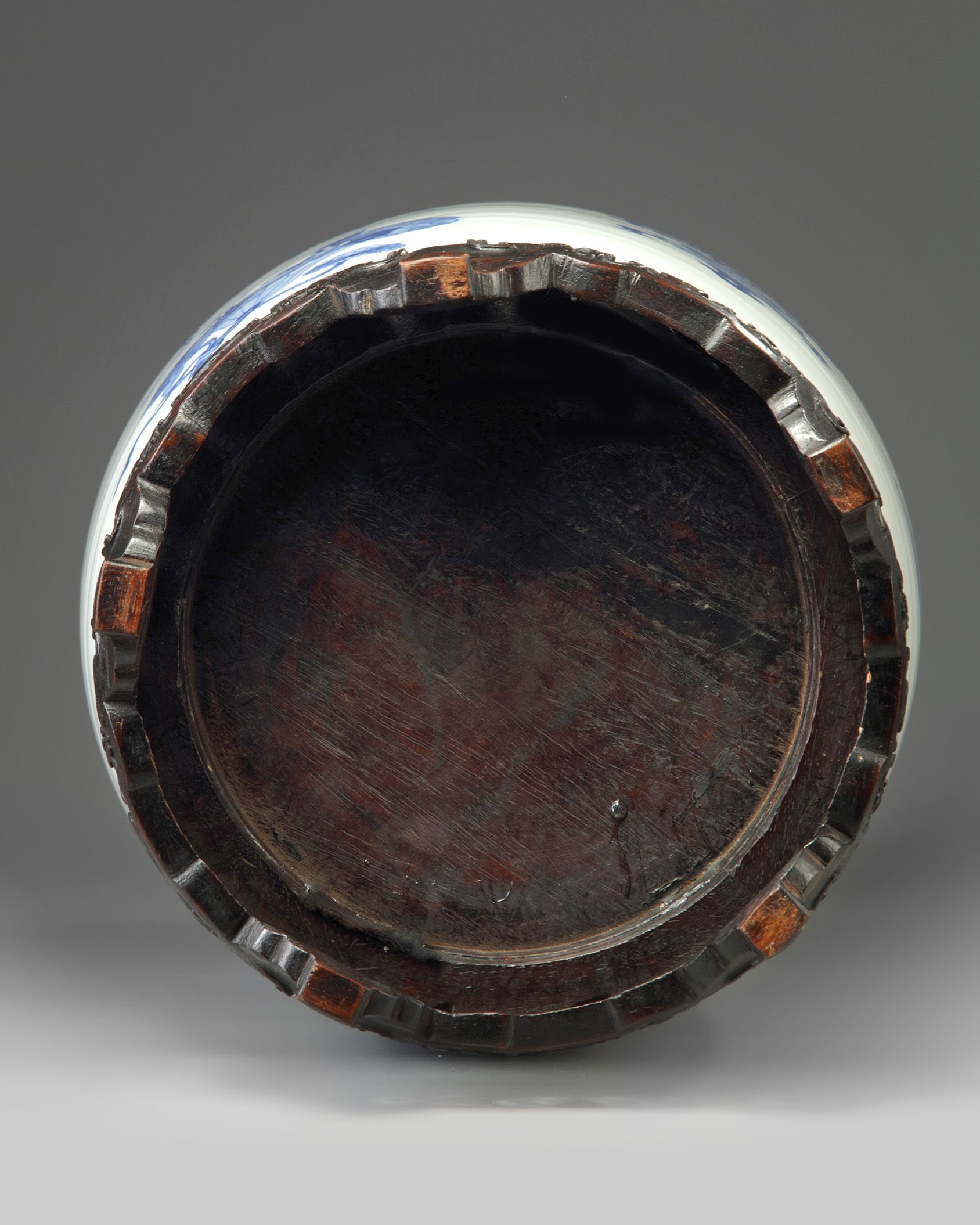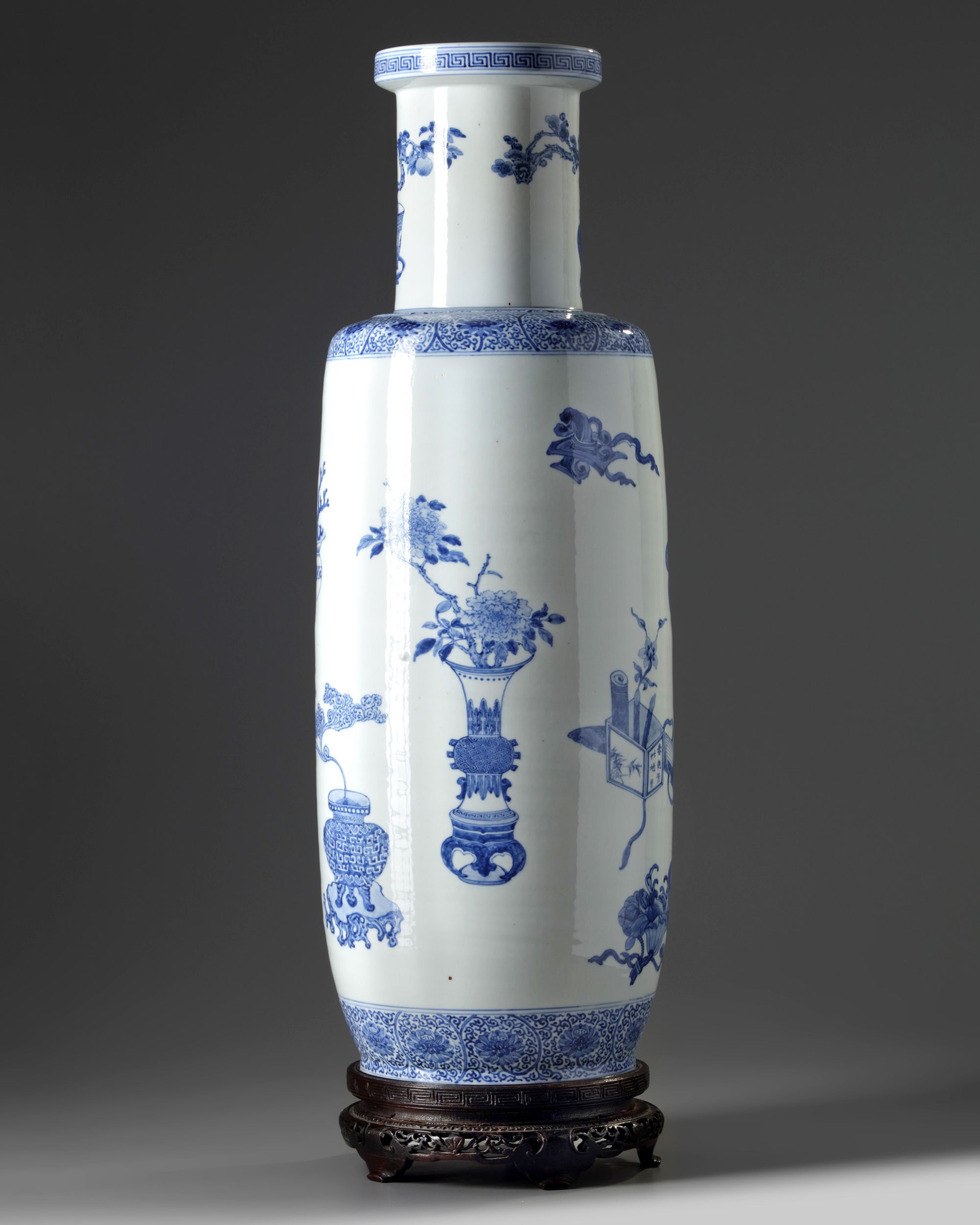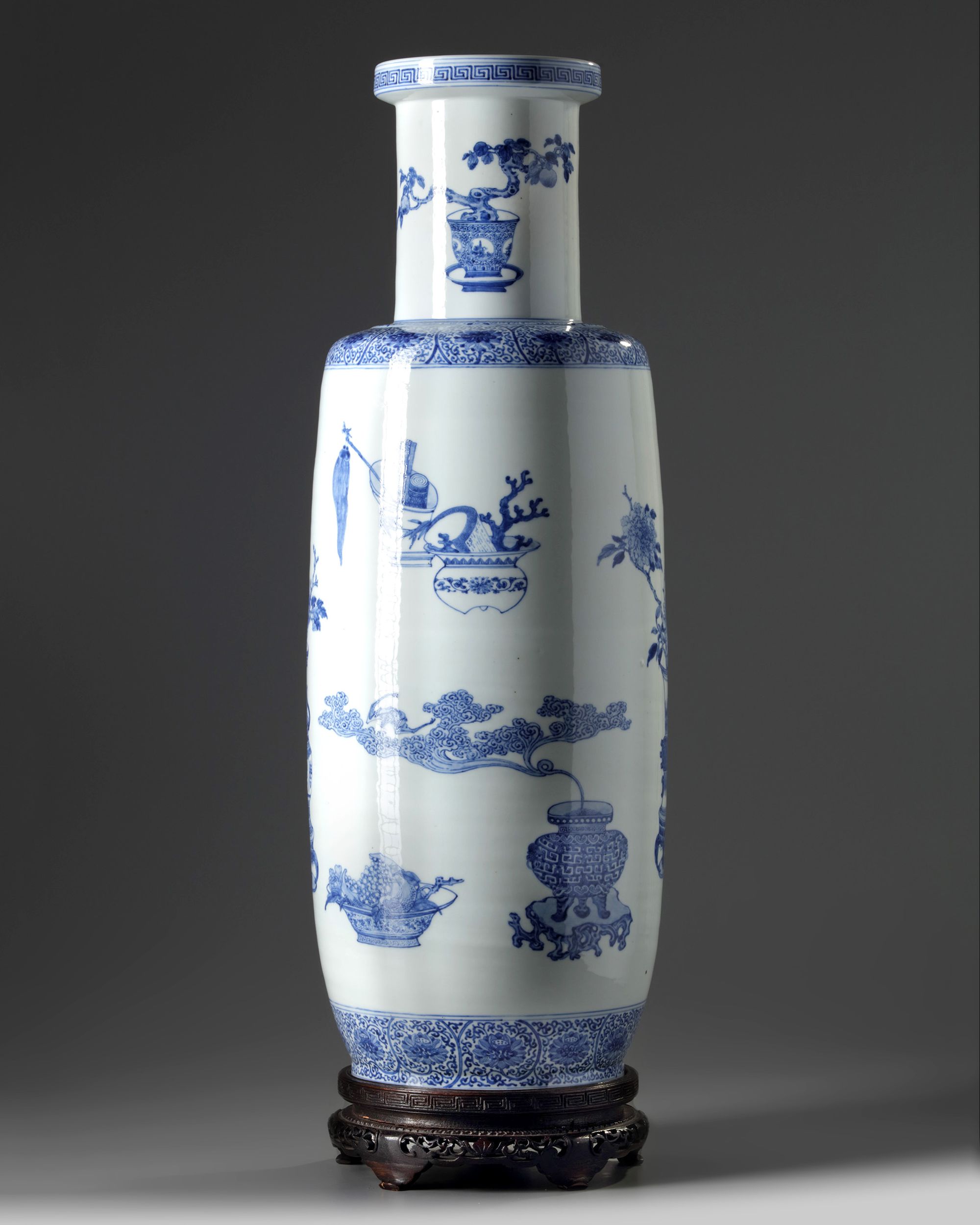 The vase is delicately and finely decorated to the body with scattered flowers, fruits, and precious objects all below a scrolling lotus border to the shoulder. The base is unglazed.