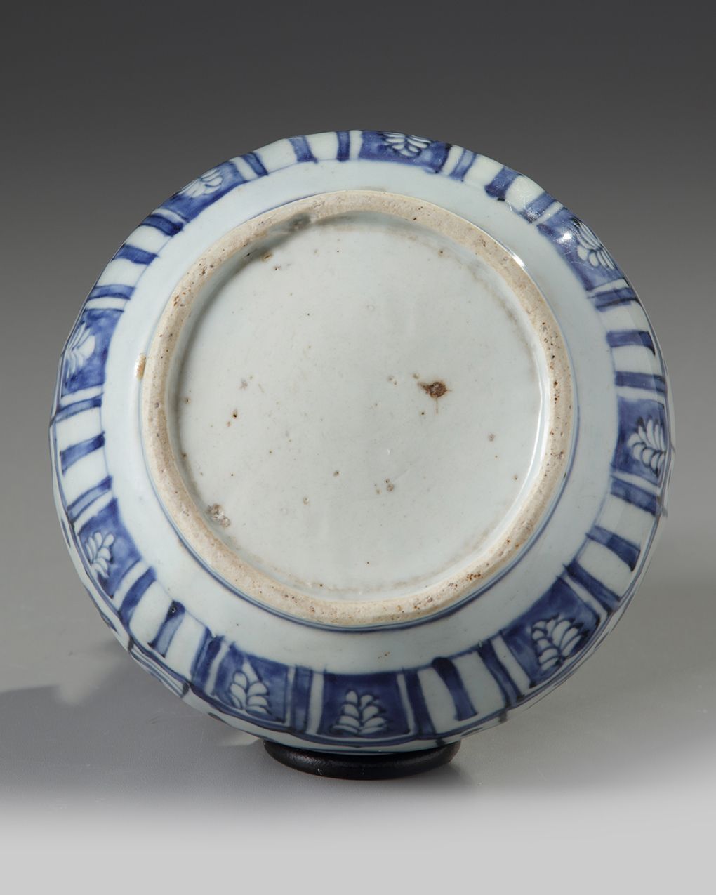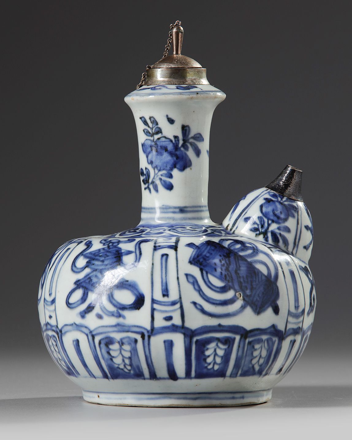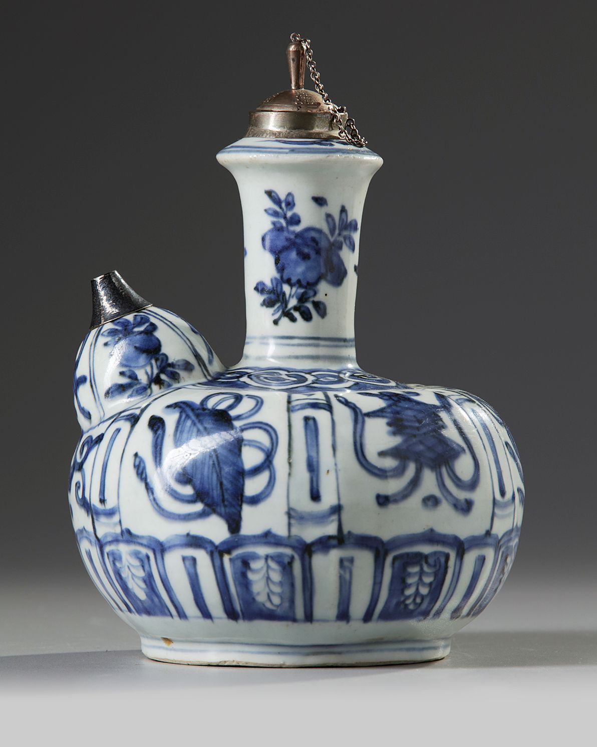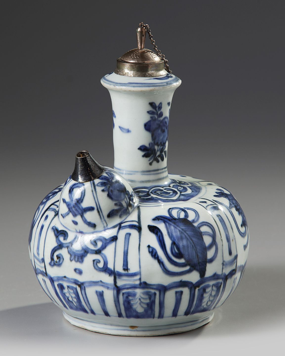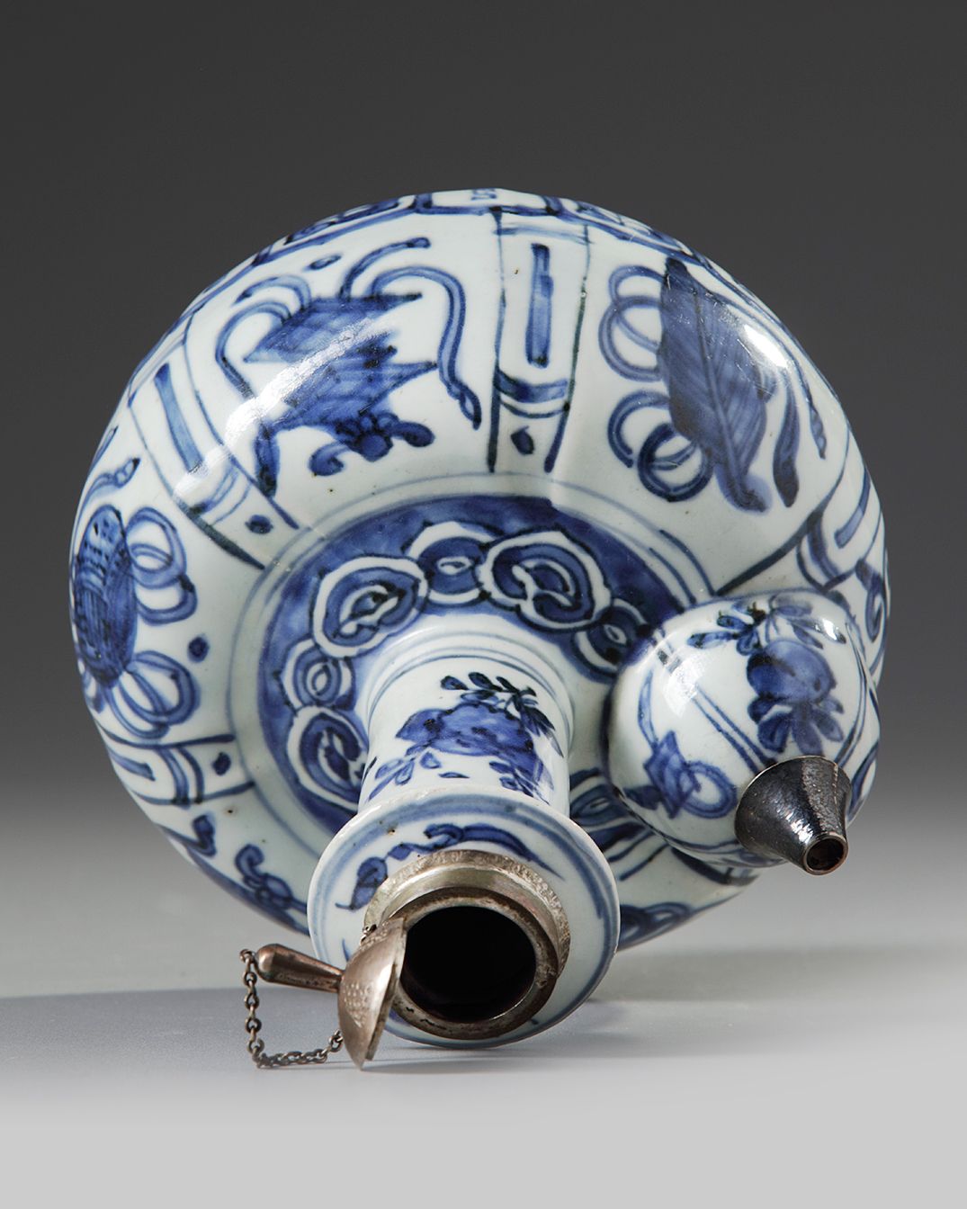 The kendi is decorated to the body with moulded panels enclosing beribonned precious objects in bordered panels, all below a ruyi-head band to the shoulder. The neck and spout are decorated with flowers. The spout and rim are mounted in silver with a cover.