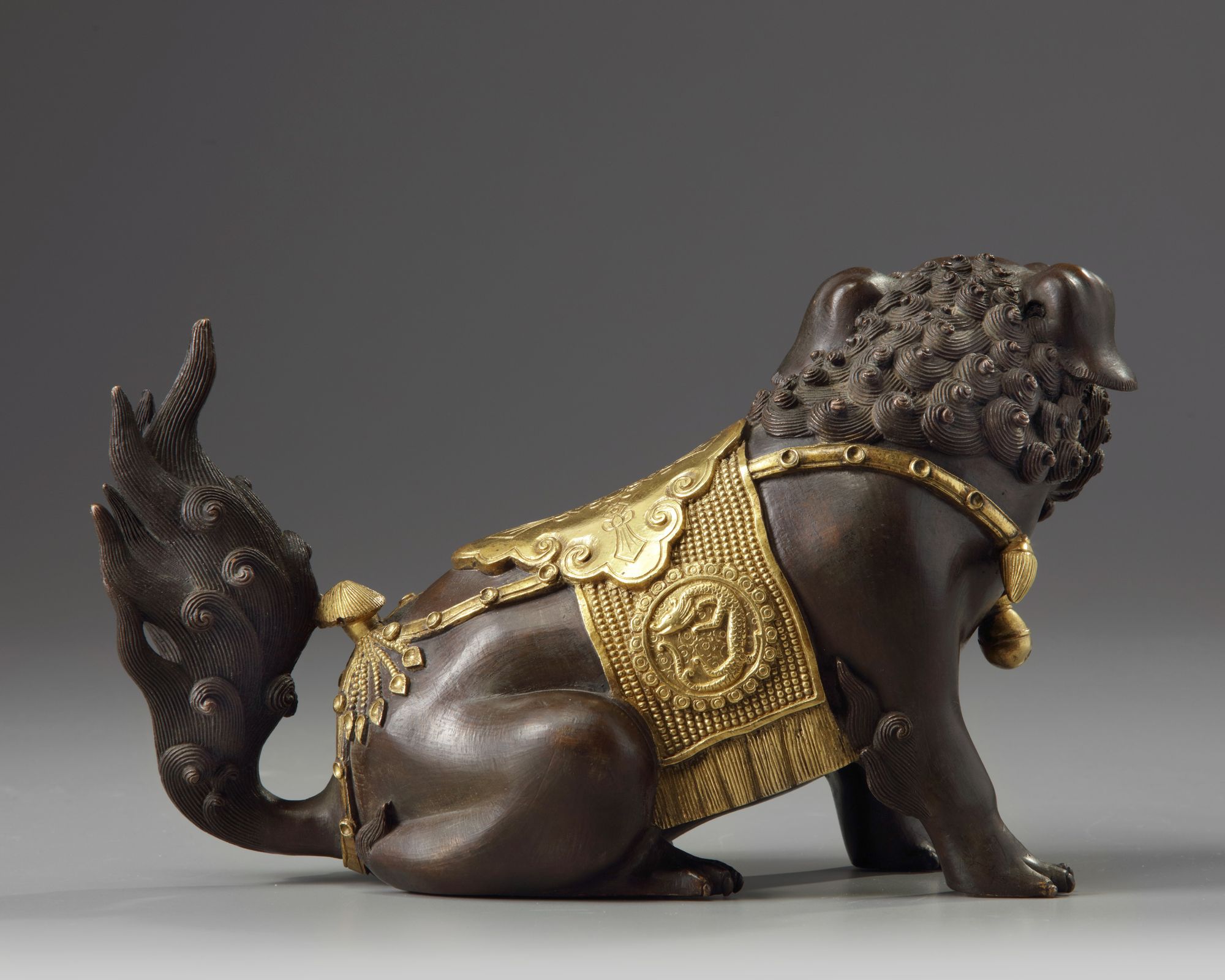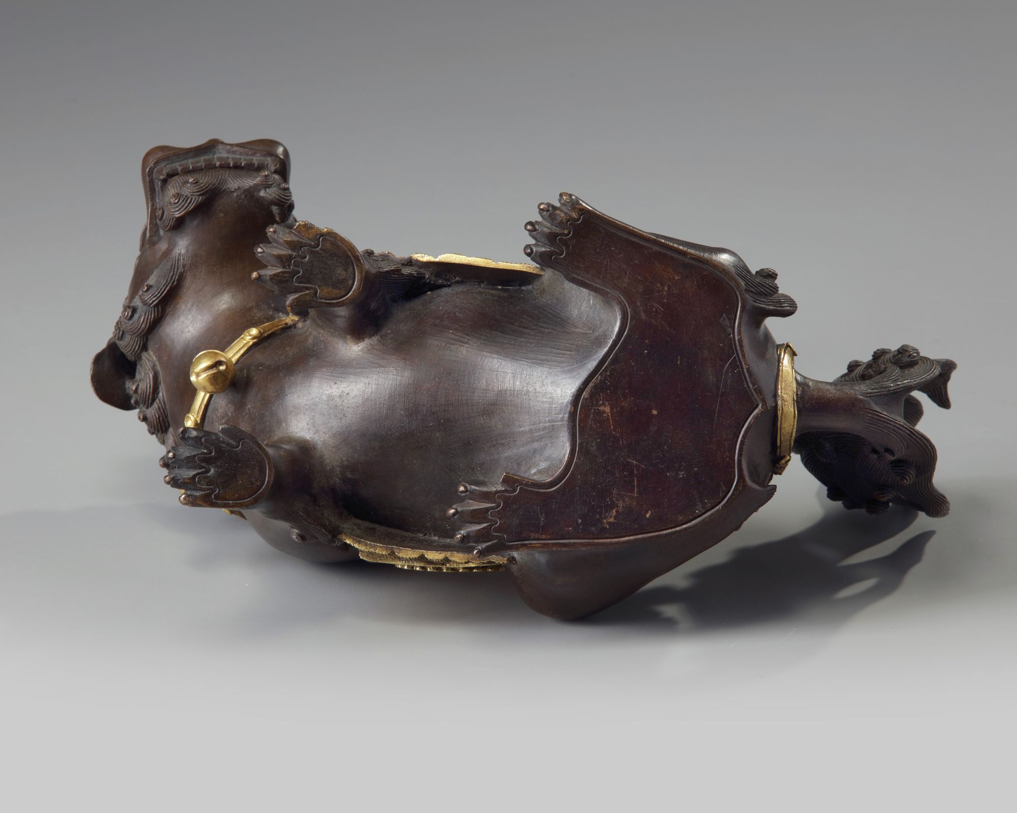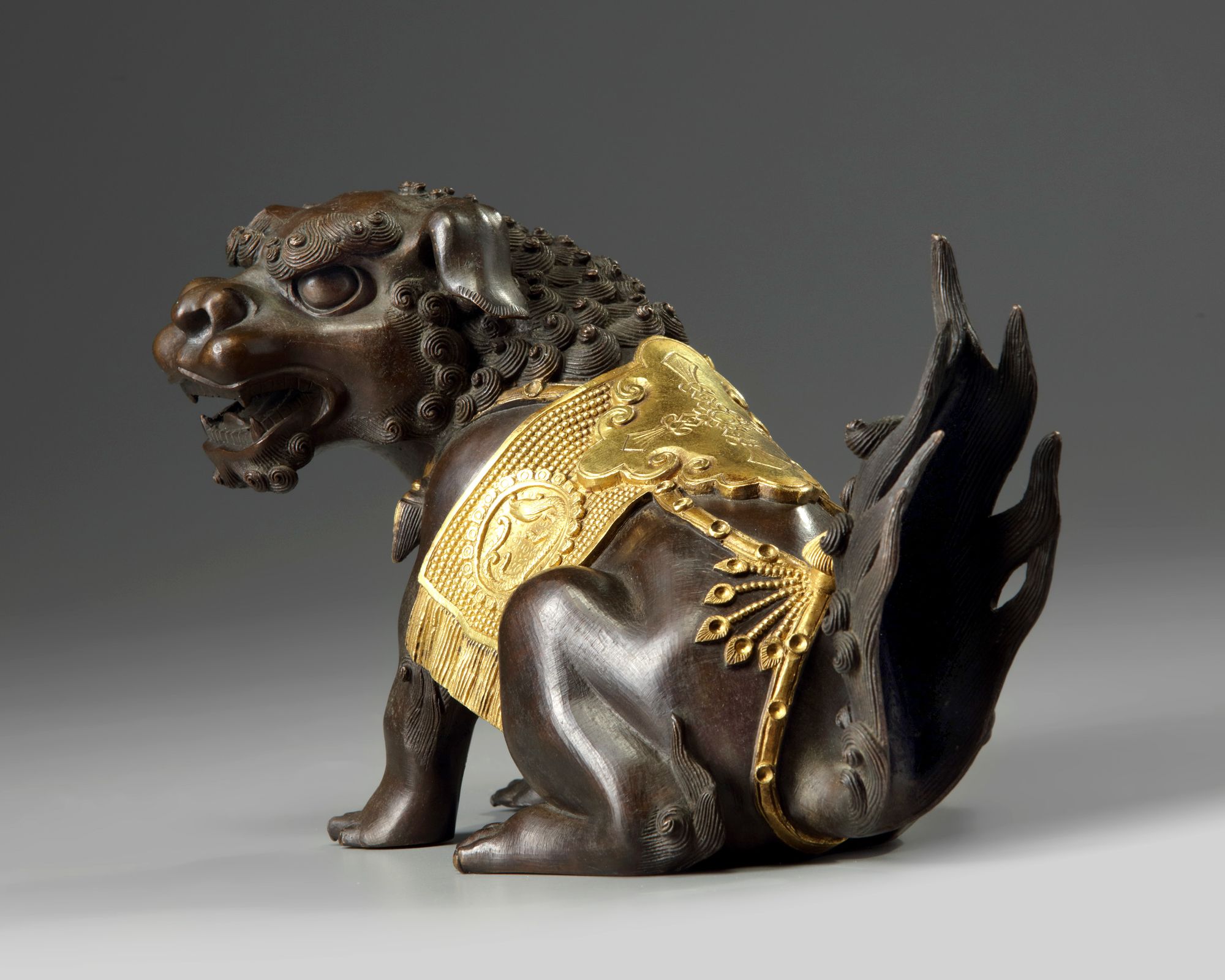 The fierce creature is cast crouching with its head turned to one side with its mouth open, it wears collar with bells and tassels and a saddlecloth decorated with a double vajra and a coiled kui dragon.