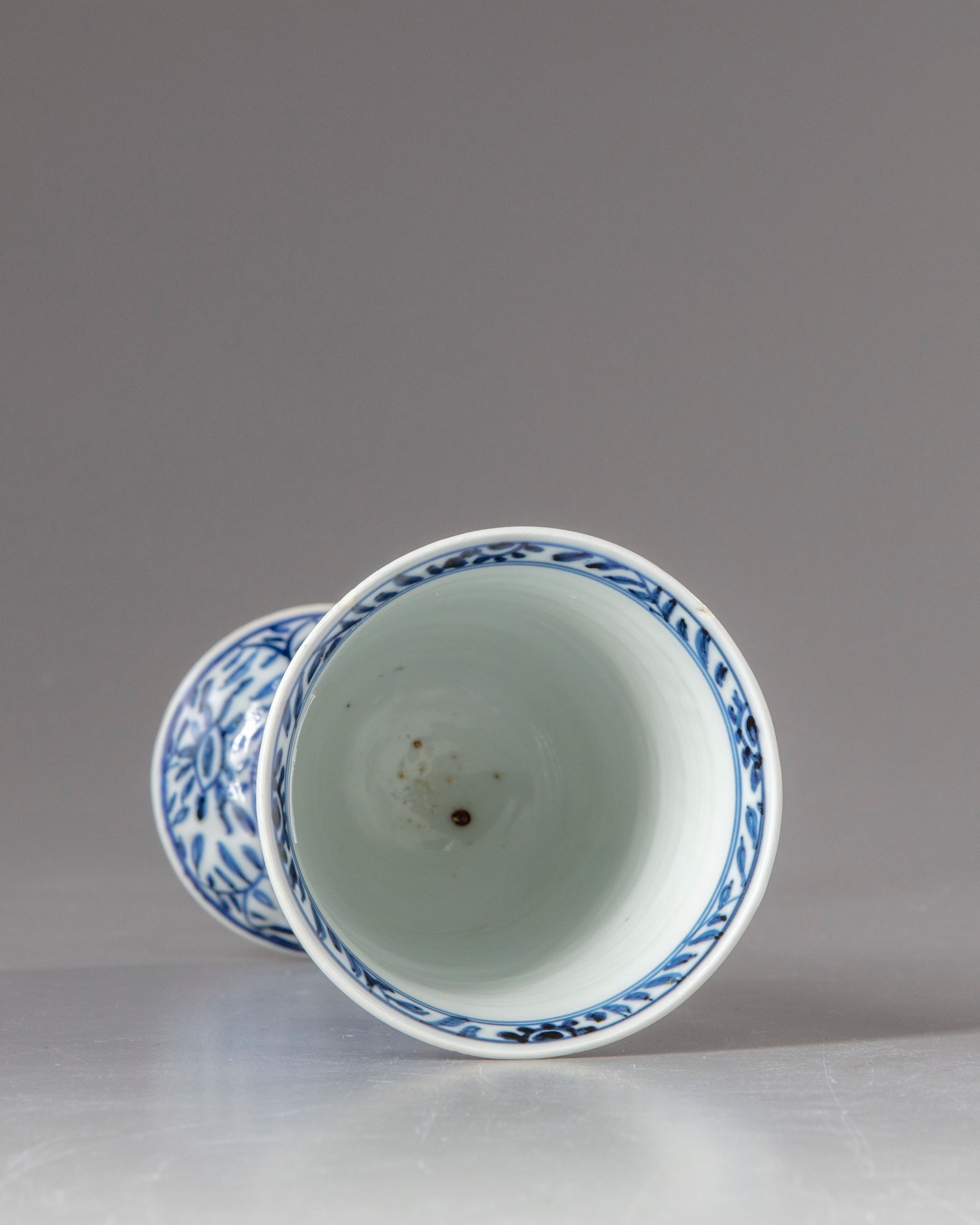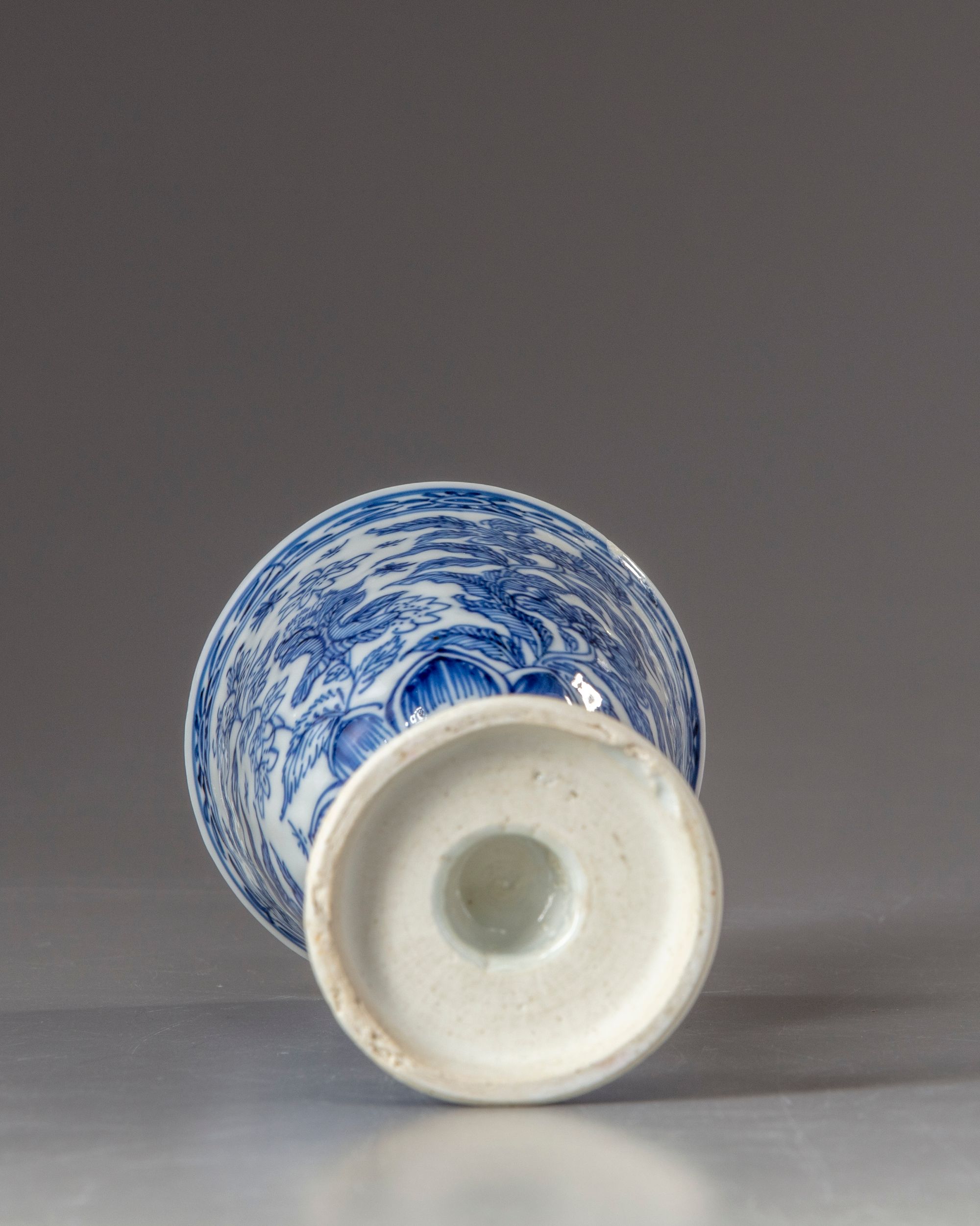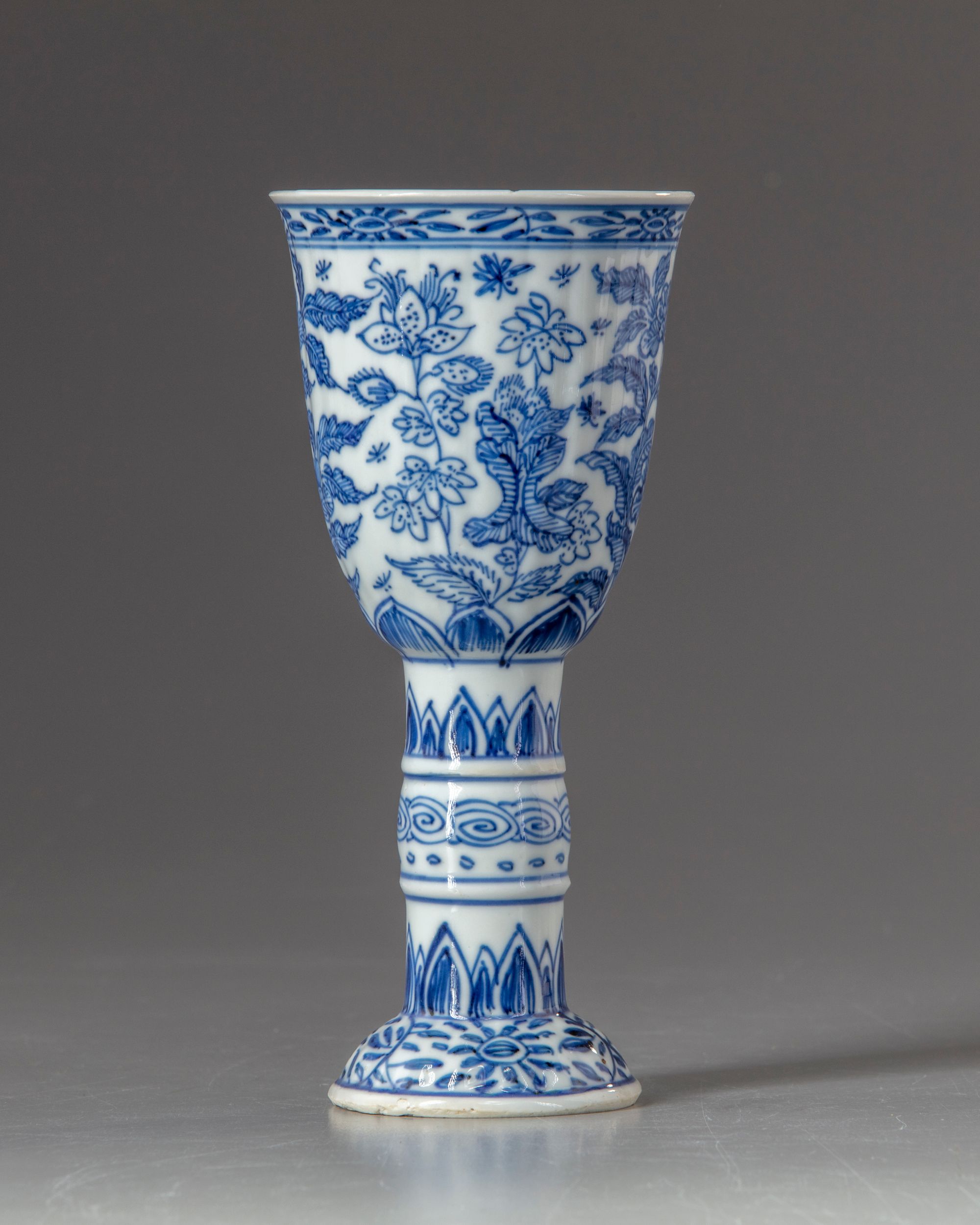 A Chinese stemmed beaker, moulded with fluted edges to the upper body and stands on slender columns rising from a domed foot, decorated in pencil style with blossoming flowers.