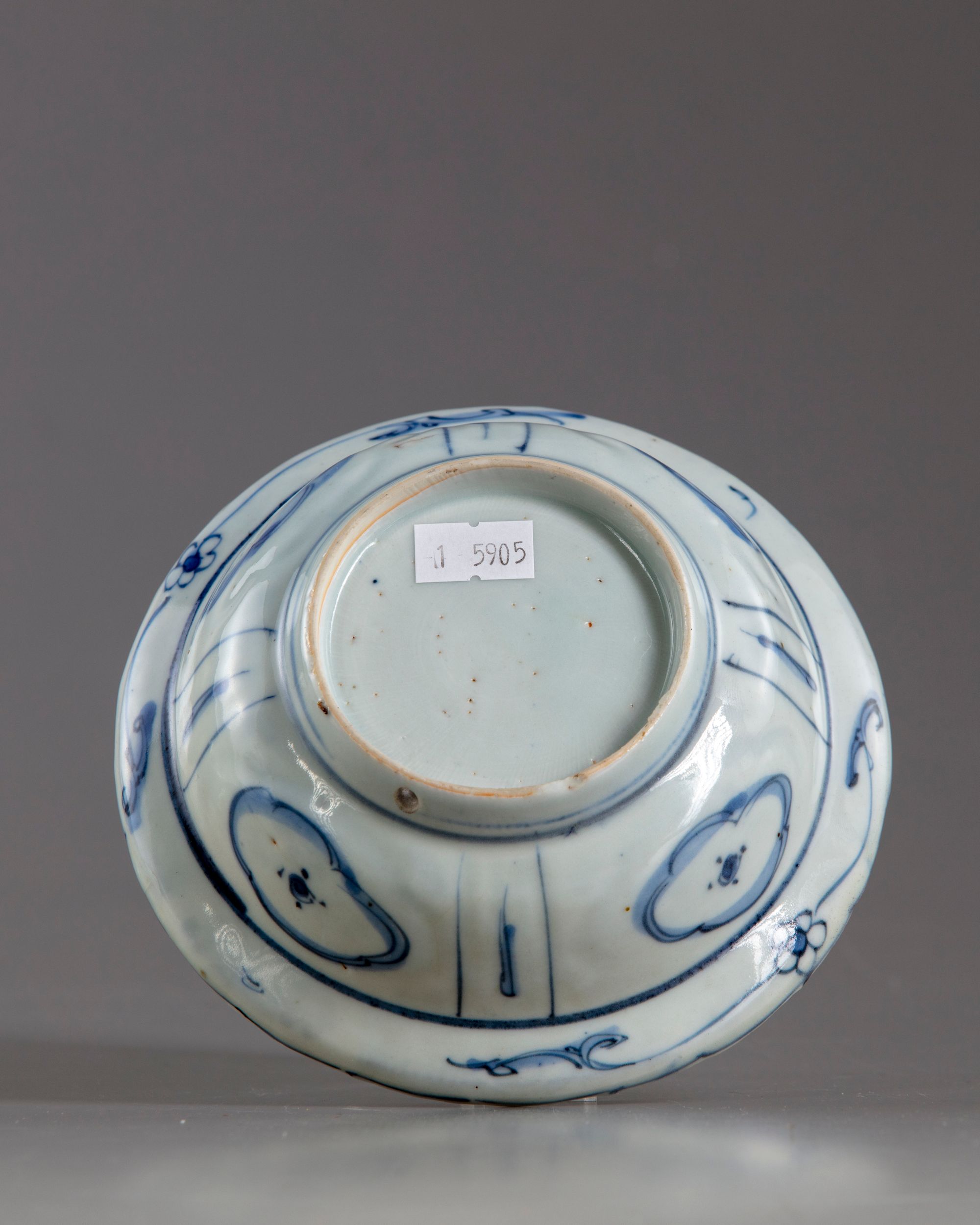 A Chinese porcelain bowl, decorated in cobalt-blue with two figures in a landscape, to the sides with panels enclosing flowers.To the everted rim with a diaper band containing cartouches enclosing flowers.