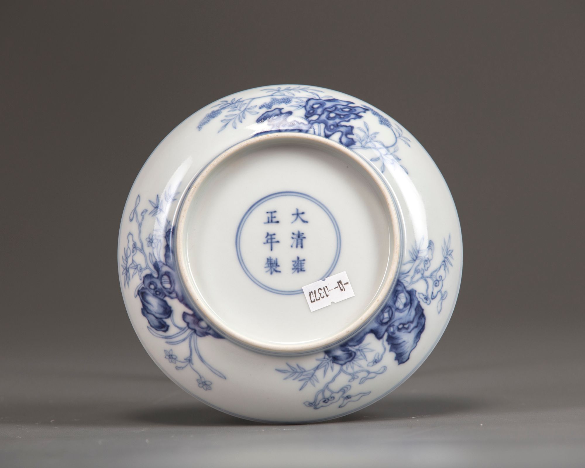 The dish is decorated in a pencil style with a central medallion with narcissus, lingzhi and branches bearing nandina berries growing beside pierced rocks. The exterior is decorated with three scattered groups of narcissus, plants and rocks. The base with an with apocryphal Yongzheng mark.