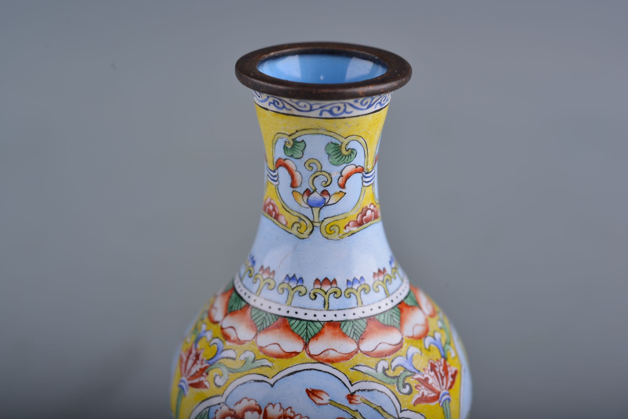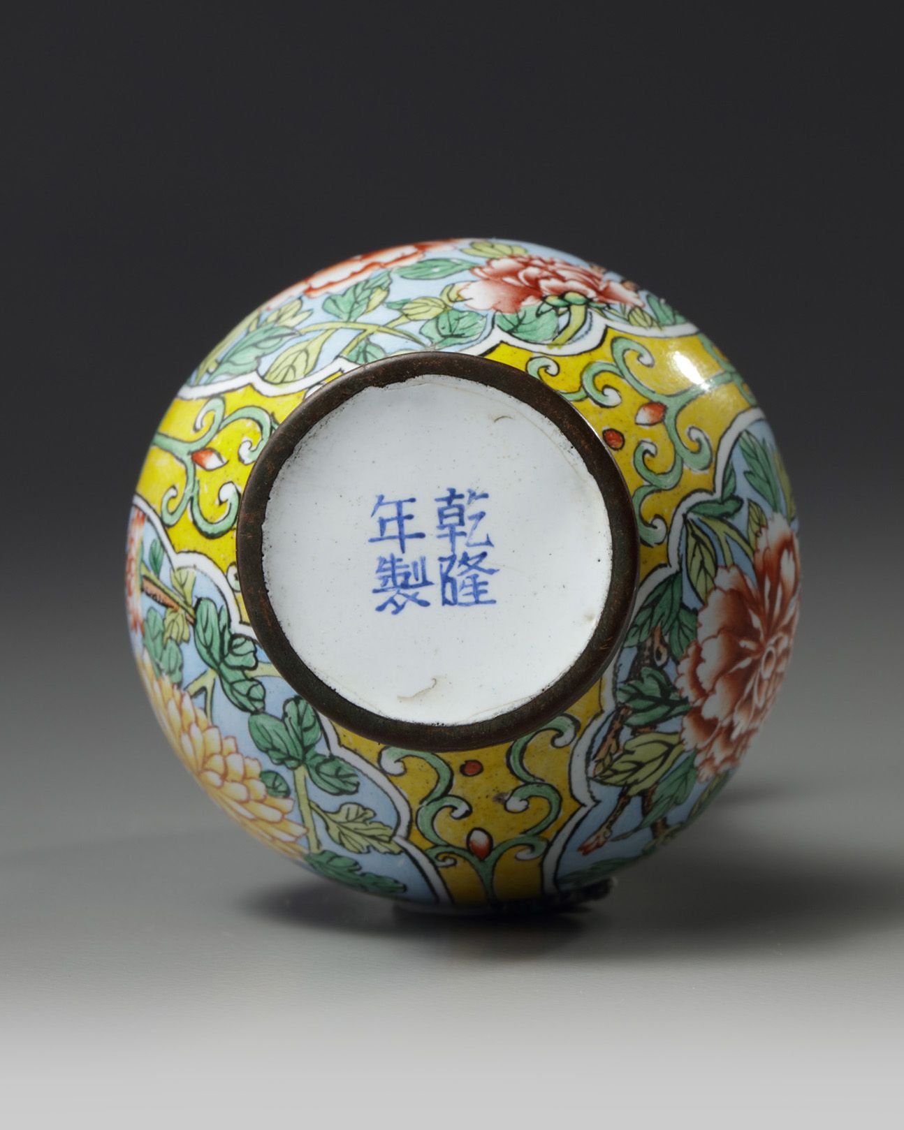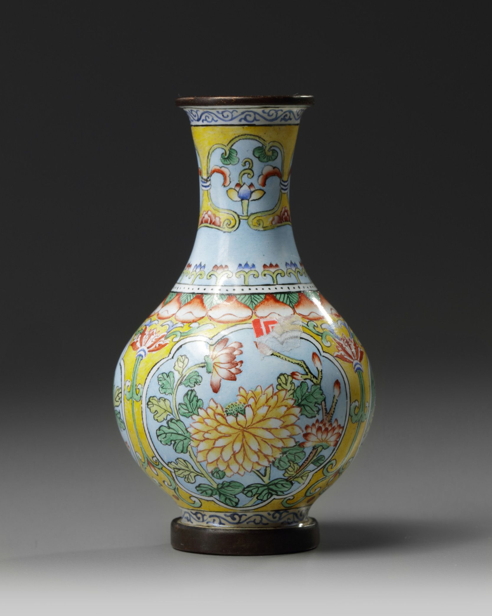 The vase is decorated with three evenly-spaced panels enclosing flowers, all reserved on a yellow ground below lotus petals and pendant lappets to the rim. The base with an apocryphal Qianlong mark.