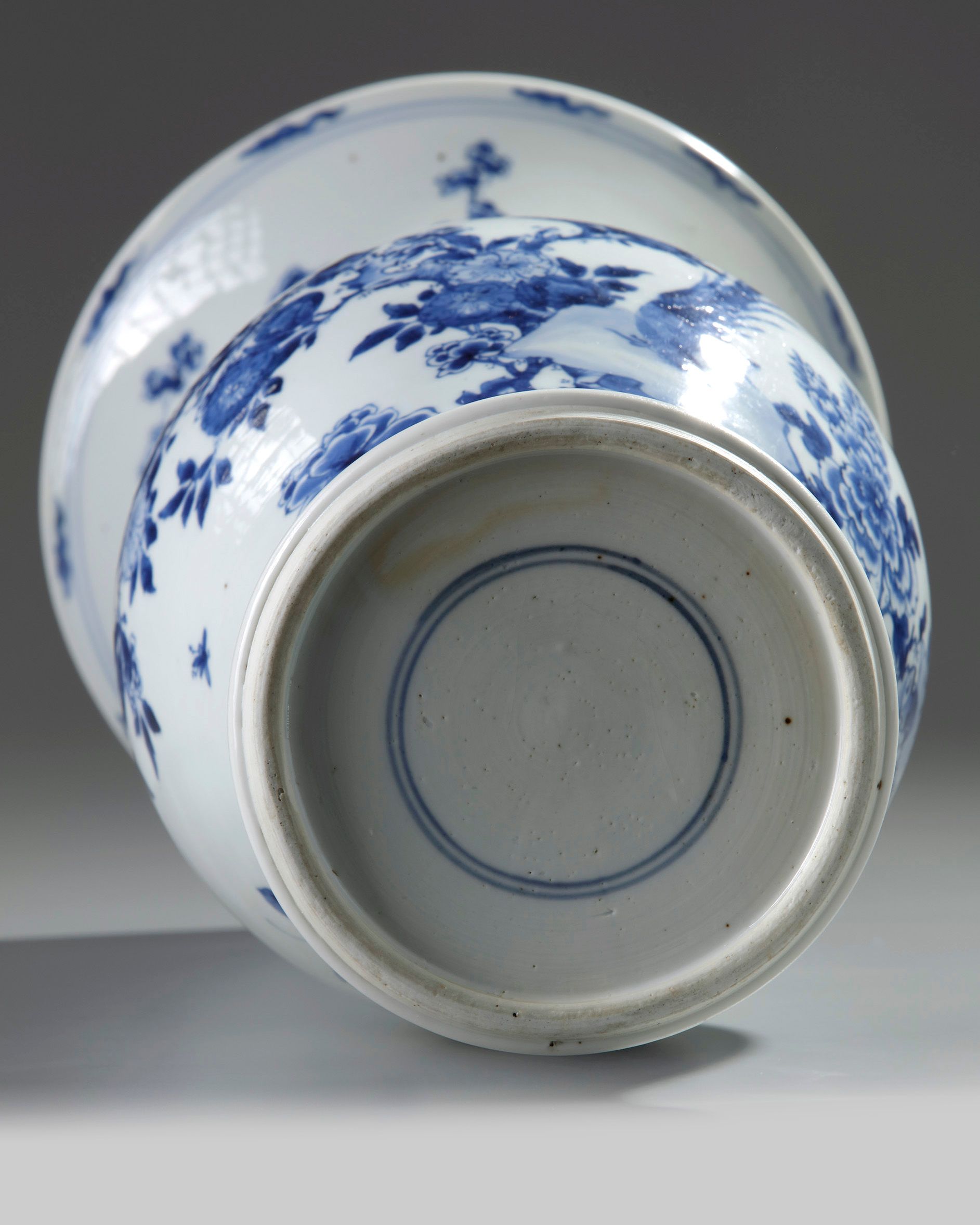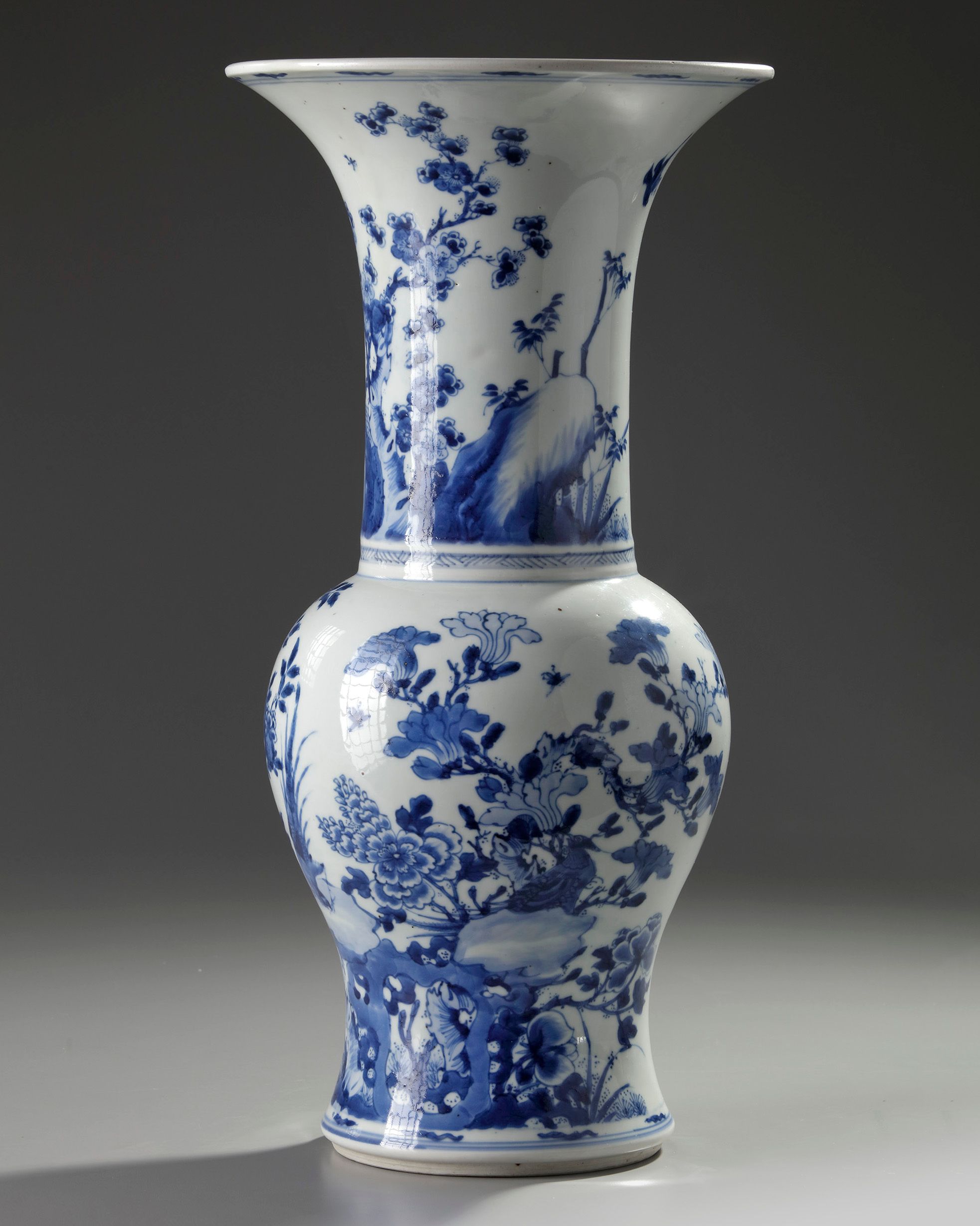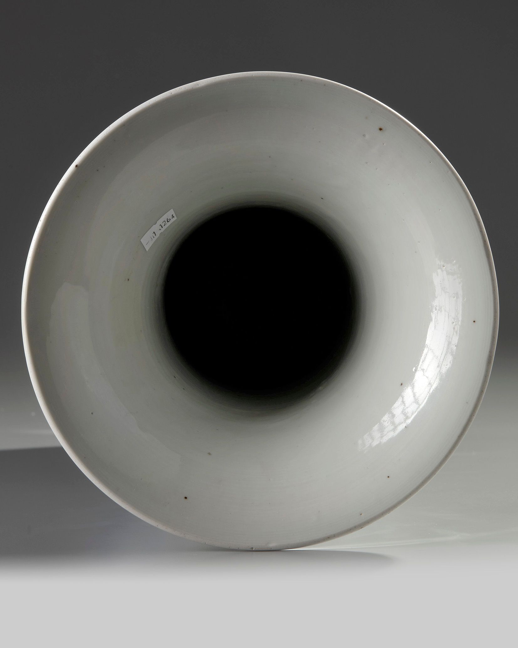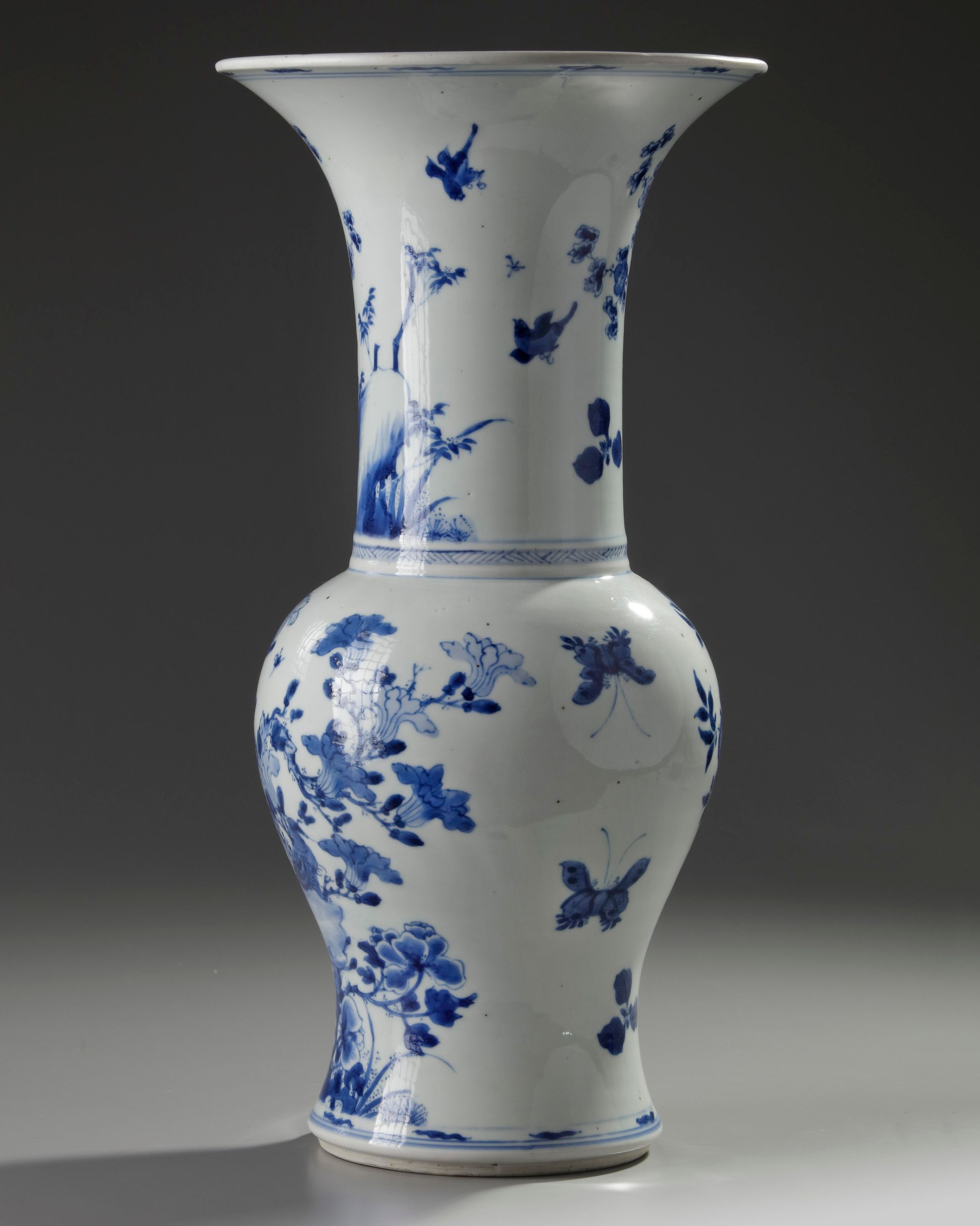 The vase is decorated to the body and neck with birds and butterflies amongst flowers and flowering trees, with a cloud scroll band to the rim, the neck, and the foot. The base with an underglaze blue double circle.