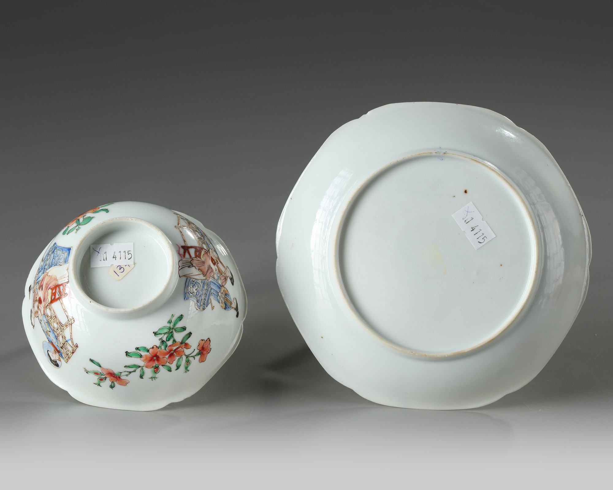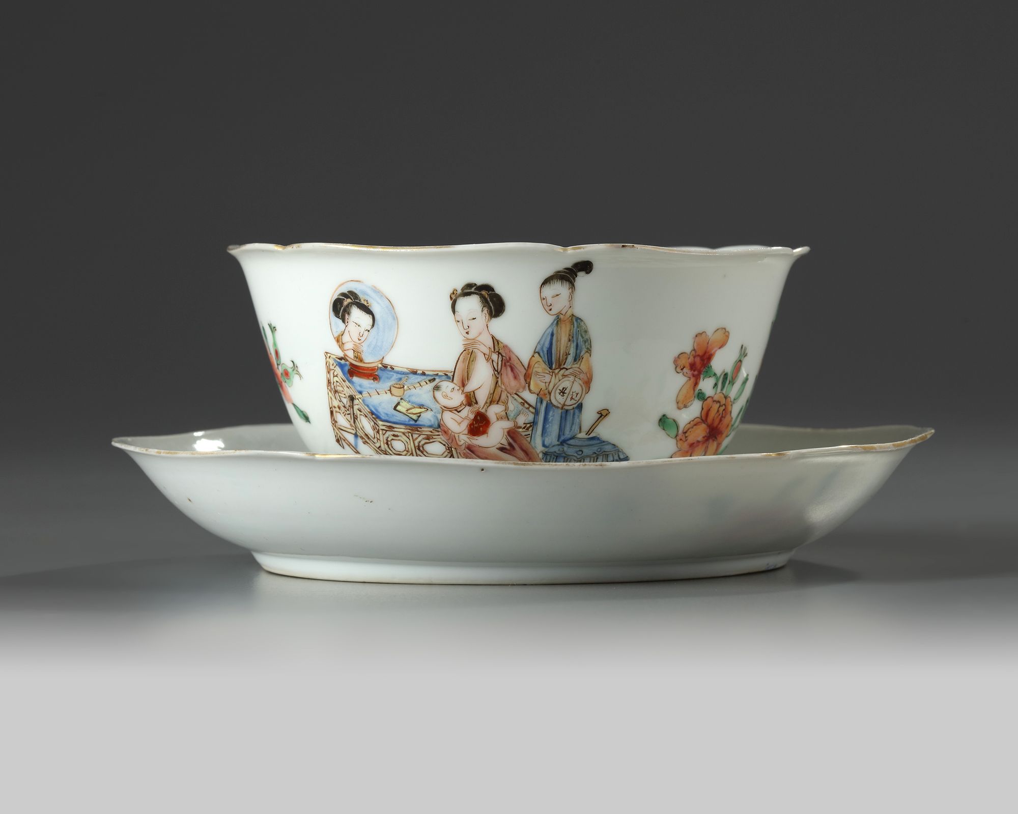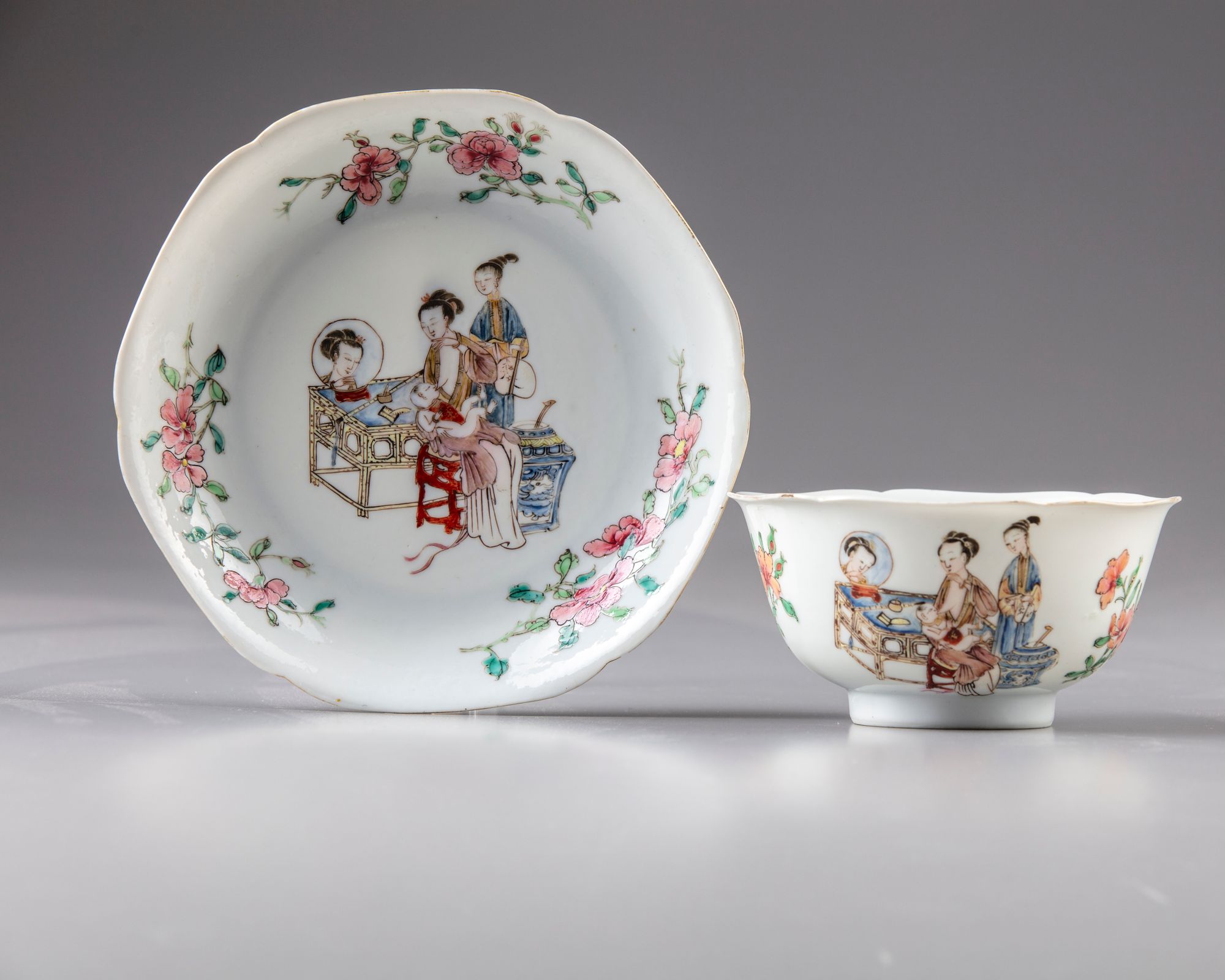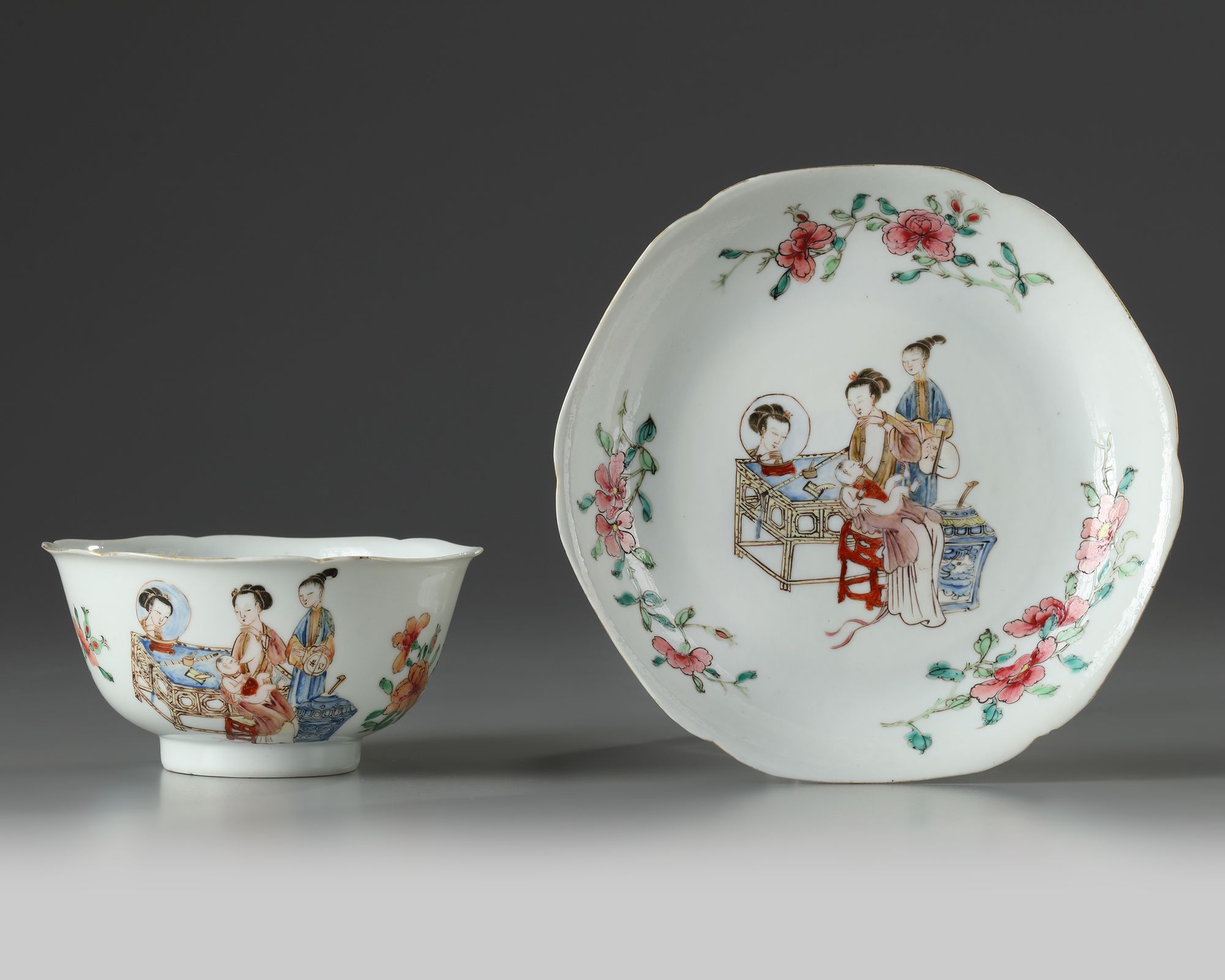 The bowl is delicately enamelled and gilt depicting alternating scenes of a lady feeding boy at a table laden with precious objects next to an attendant, and large blossoming flower sprays. The saucer is similarly finely decorated.