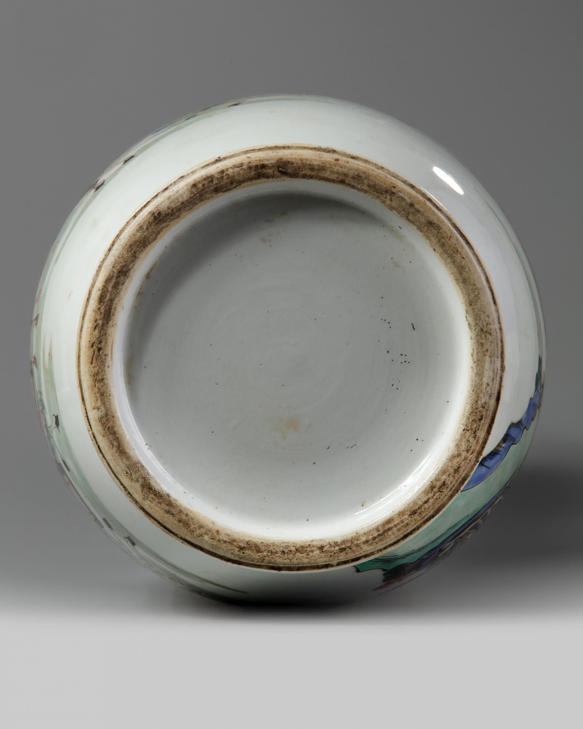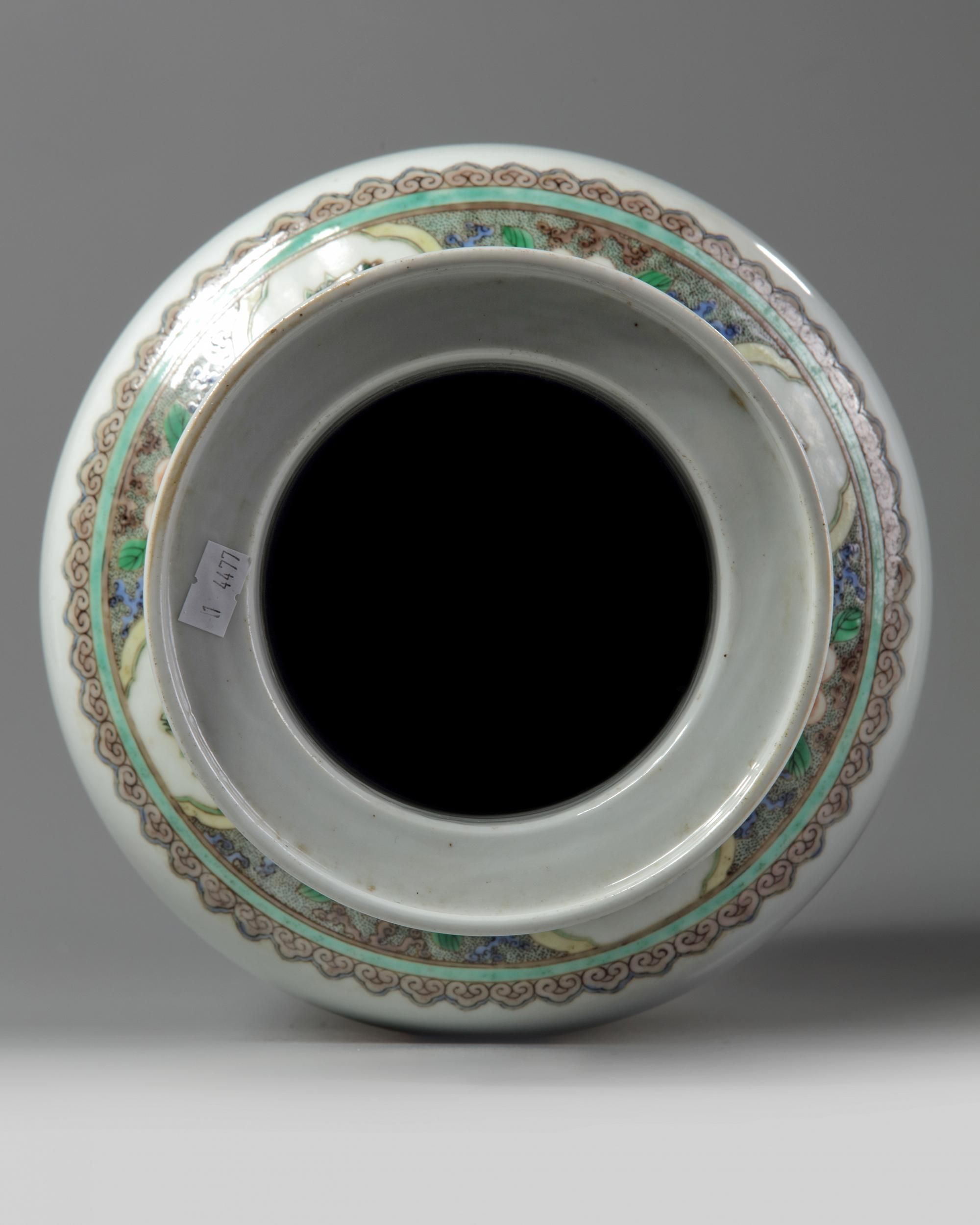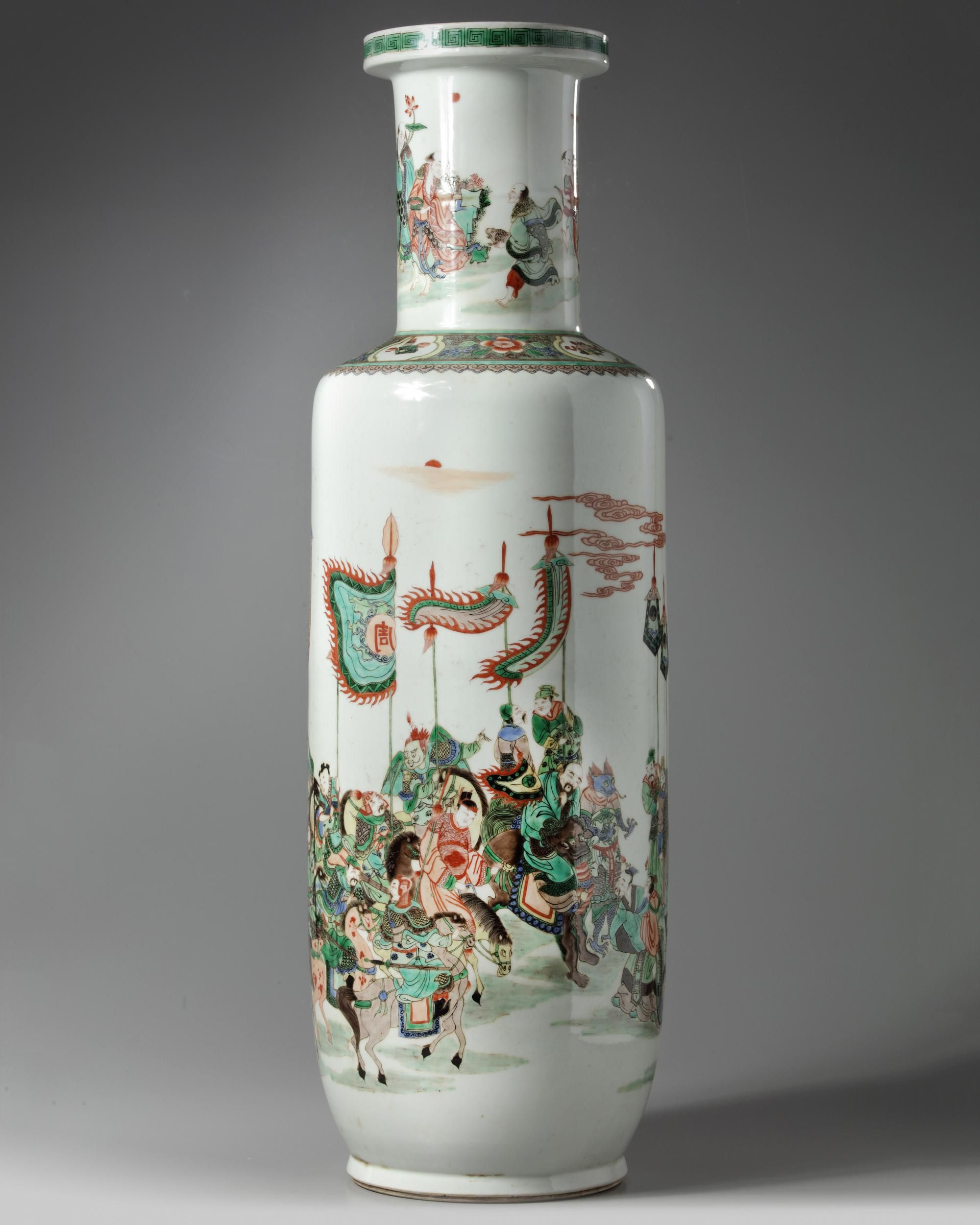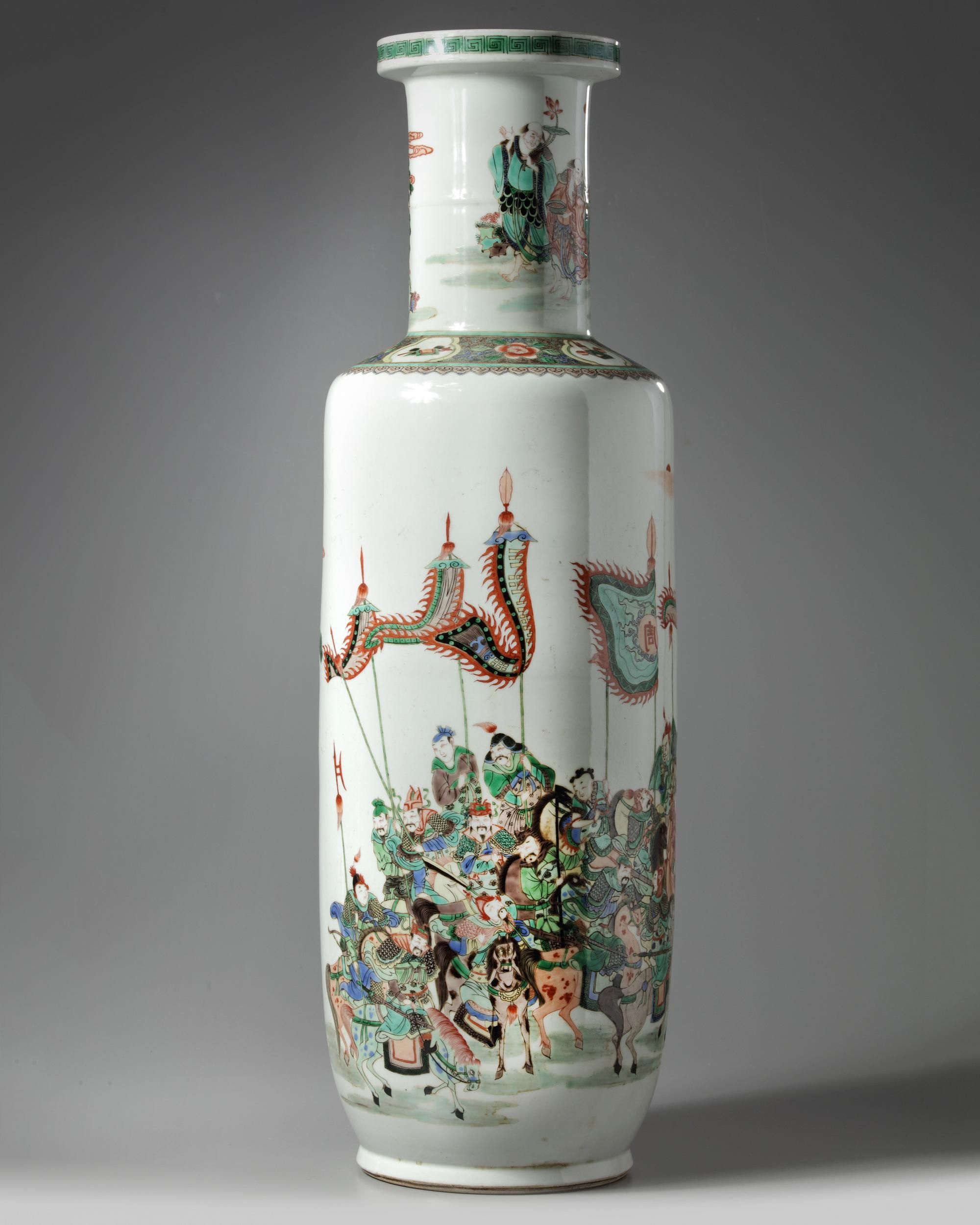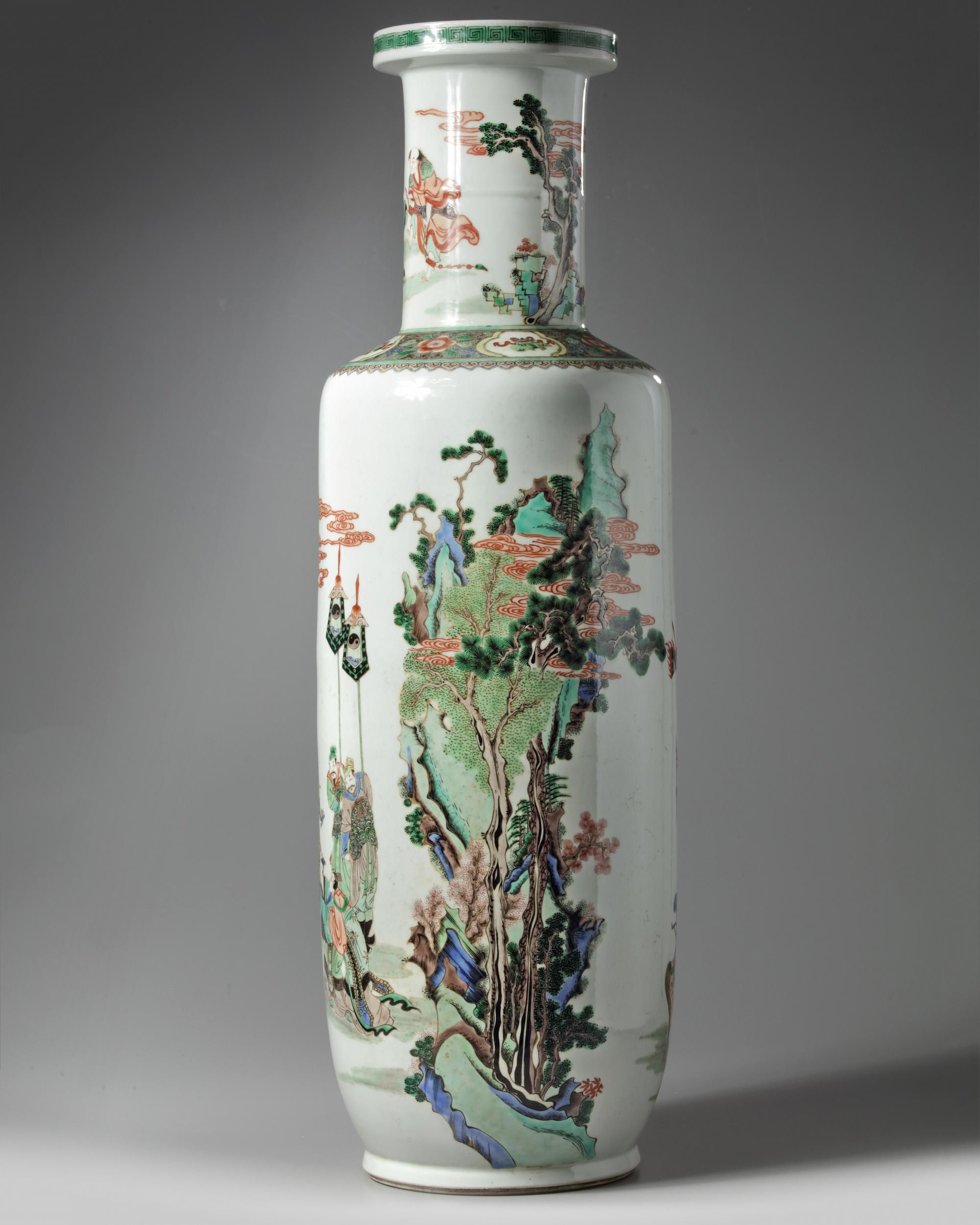 The vase is decorated to the body with various Immortals dressed in army gear in a landscape with rocks under trees. The neck is decorated with further immortals. The shoulder is decorated with a floral band with precious object cartouches. height, 79, cm