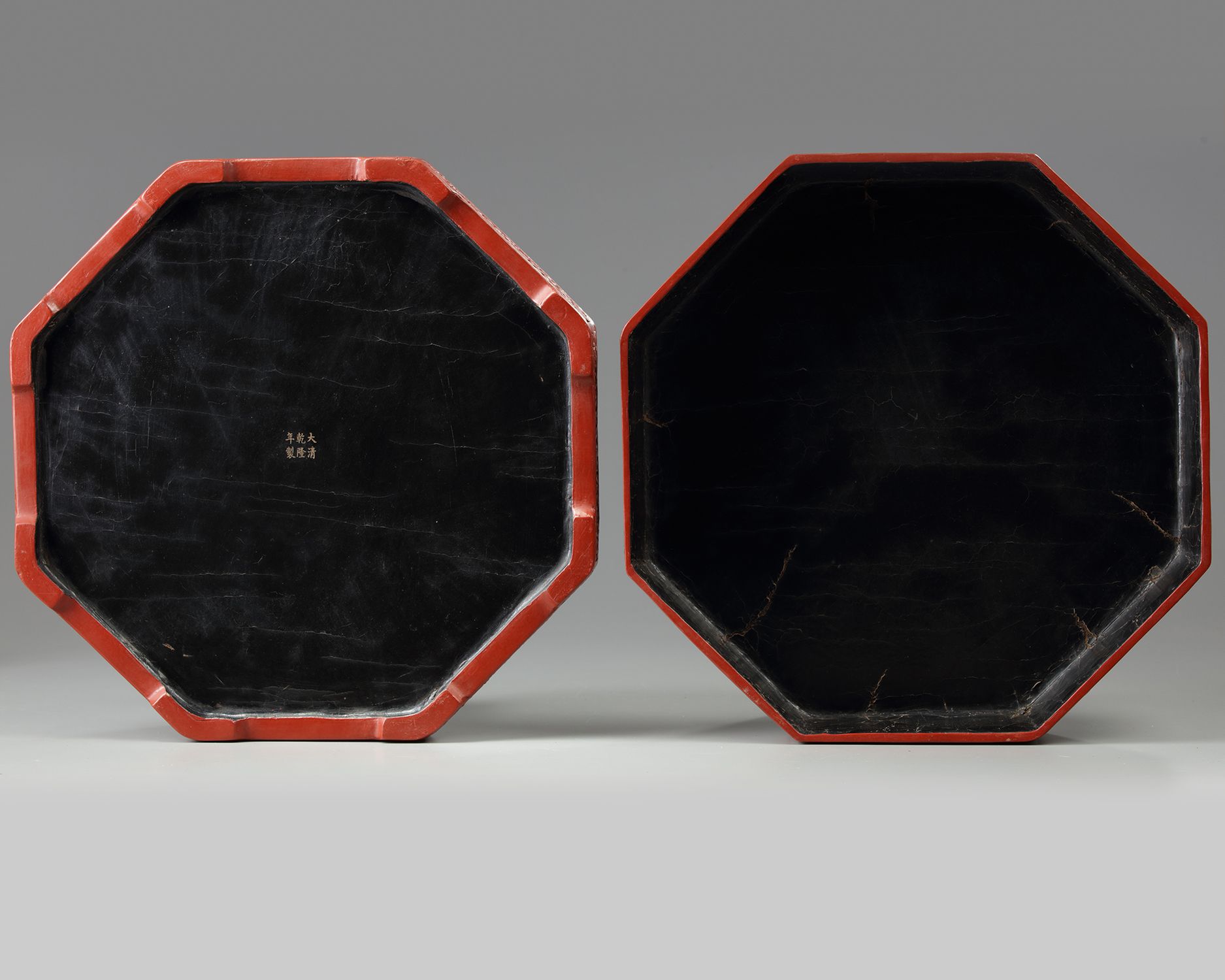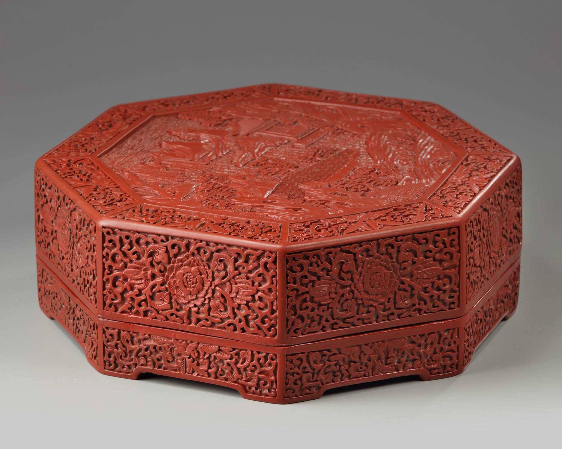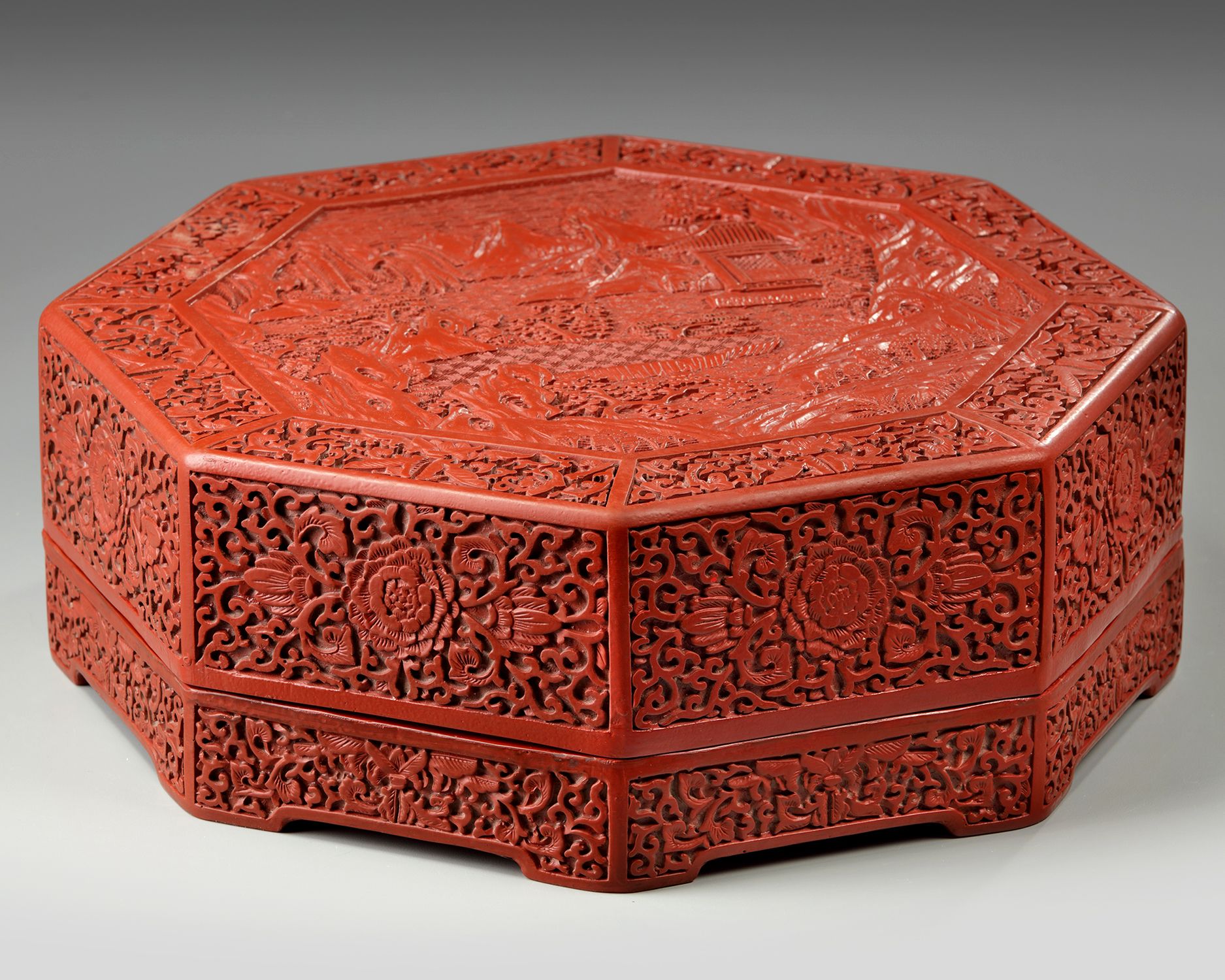 The cover are decorated with a central panel enclosing pavilions amongst trees in a river landscape, the scene is bordered by floral panels. The sides of the cover and base are decorated with further flower scroll panels. The interior and base are lacquered black, the base with an apocryphal Qianlong mark.