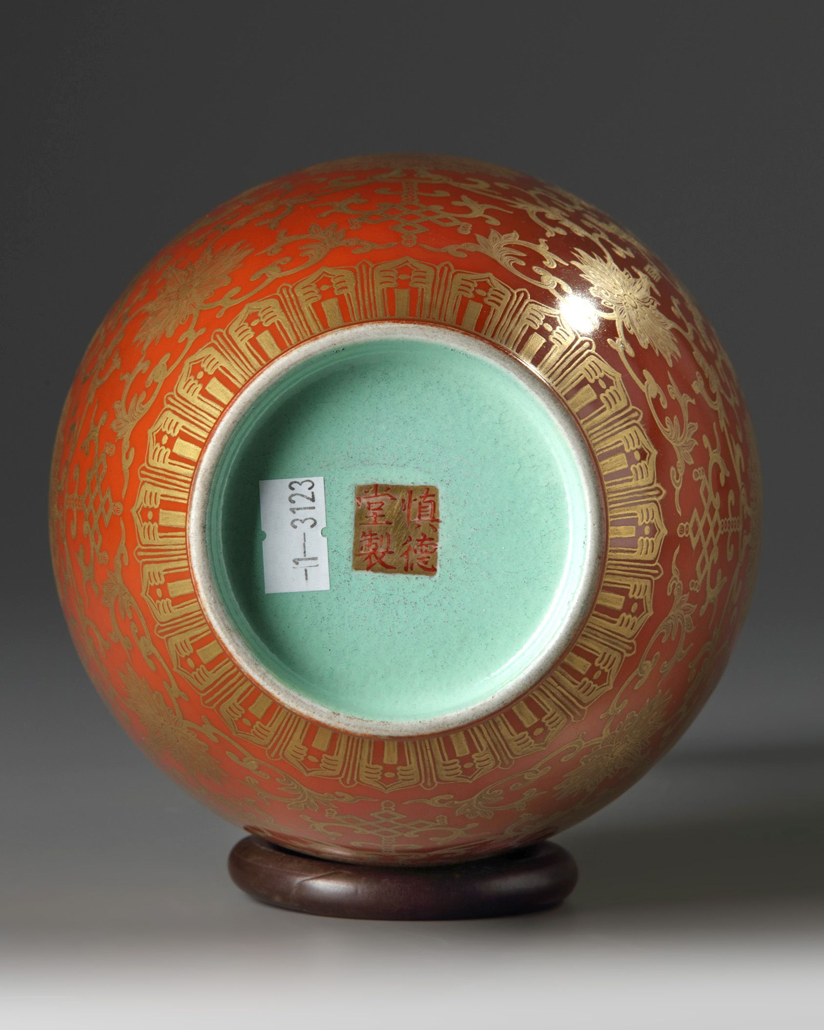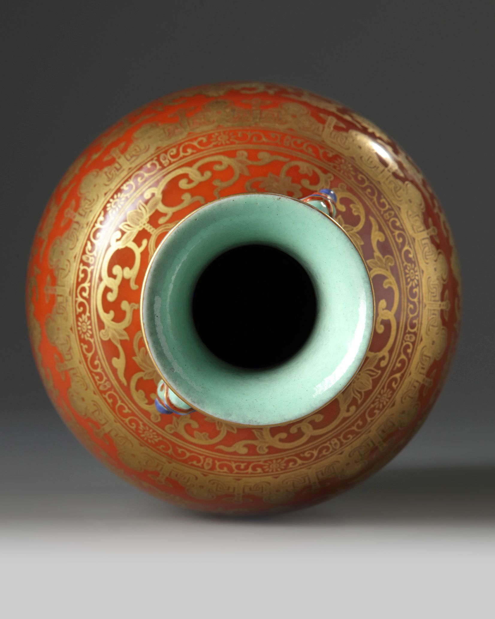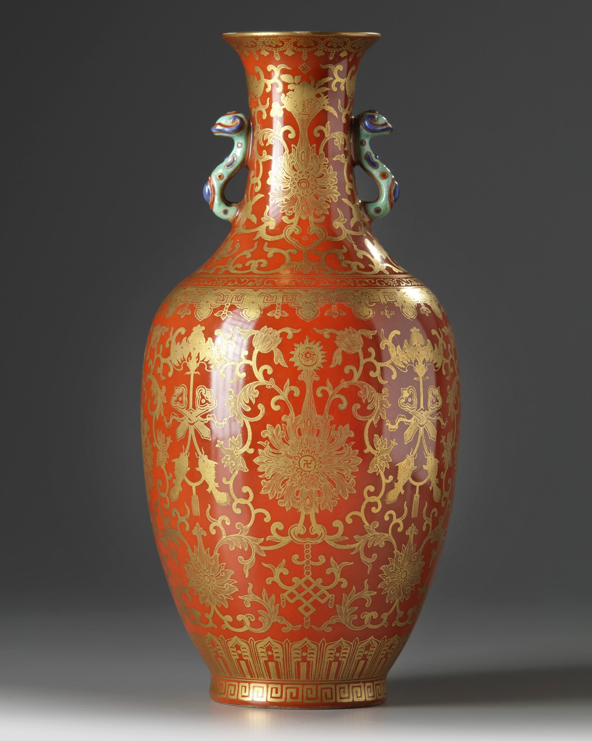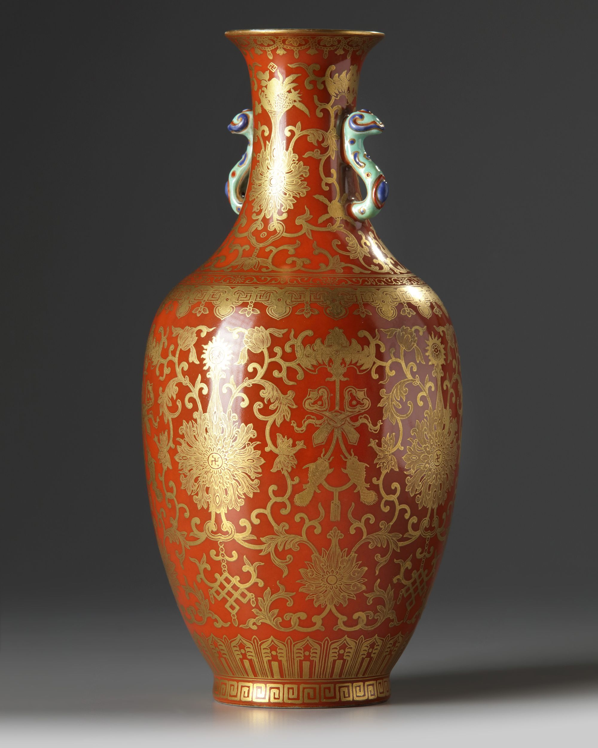 The vase is decorated with two ruyi-sceptre handles to the neck, the body is decorated with scrolling lotus amongst endless knots, bats, ruyi scepters, and twin fishes, all below a band of further scrolling lotus and the three abundances at the neck. The interior and base are glazed turquoise, and the base with a ‘Shendetang zhi’ mark in iron red and gilt.