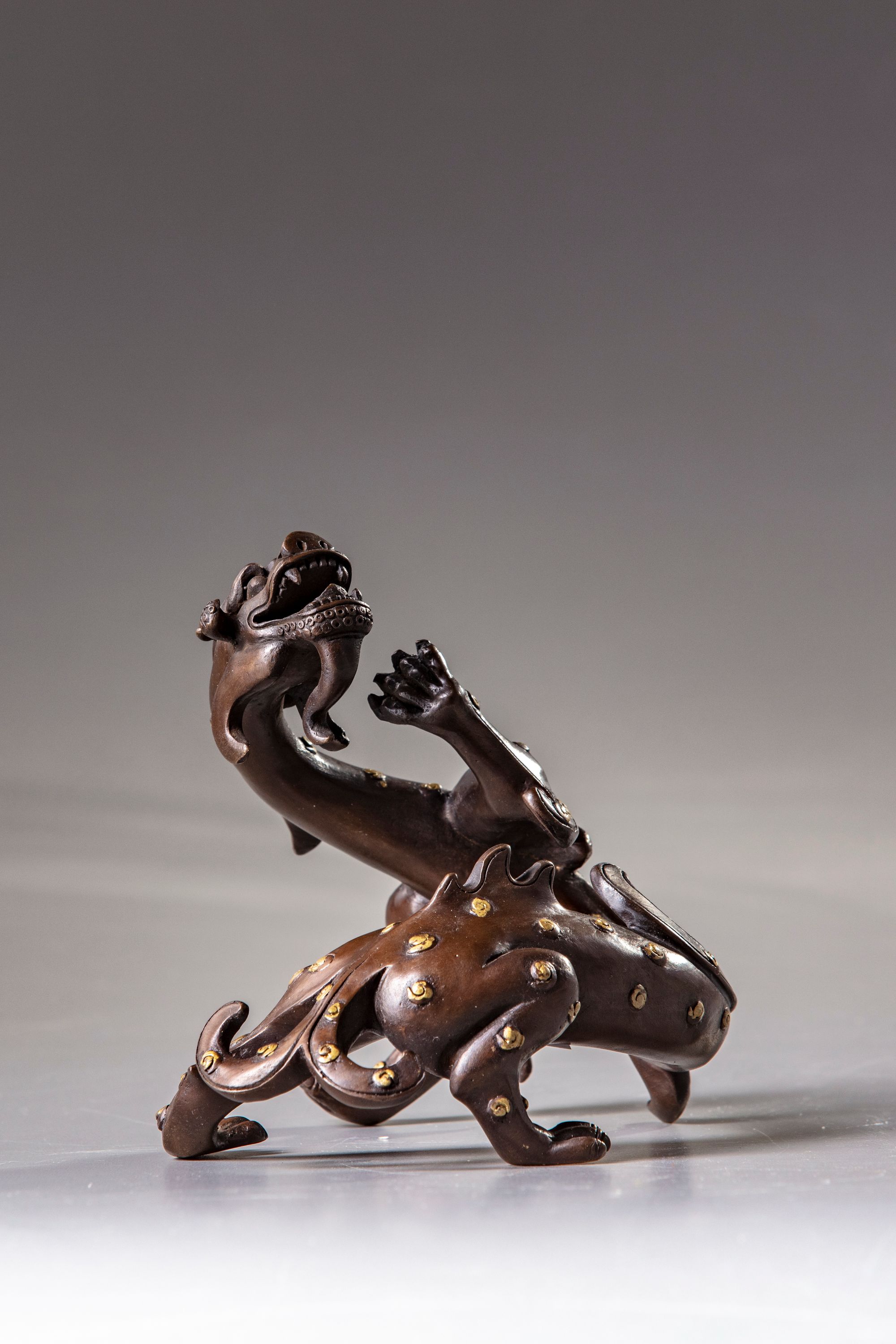 Cast with four clawns feet, standing on three feet and holding the fourth high. The exterior is decorated overall with fine gold splashes.