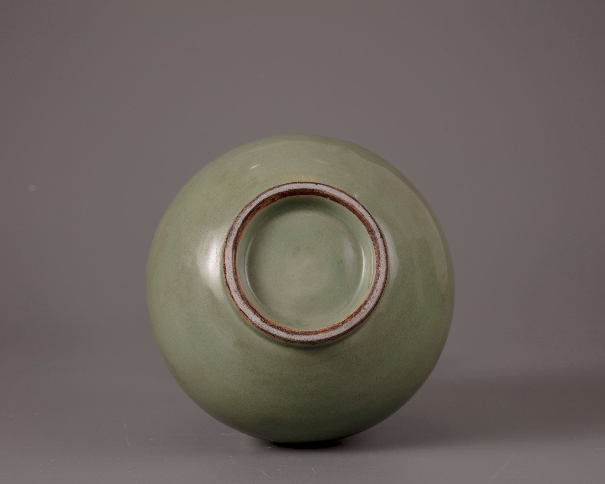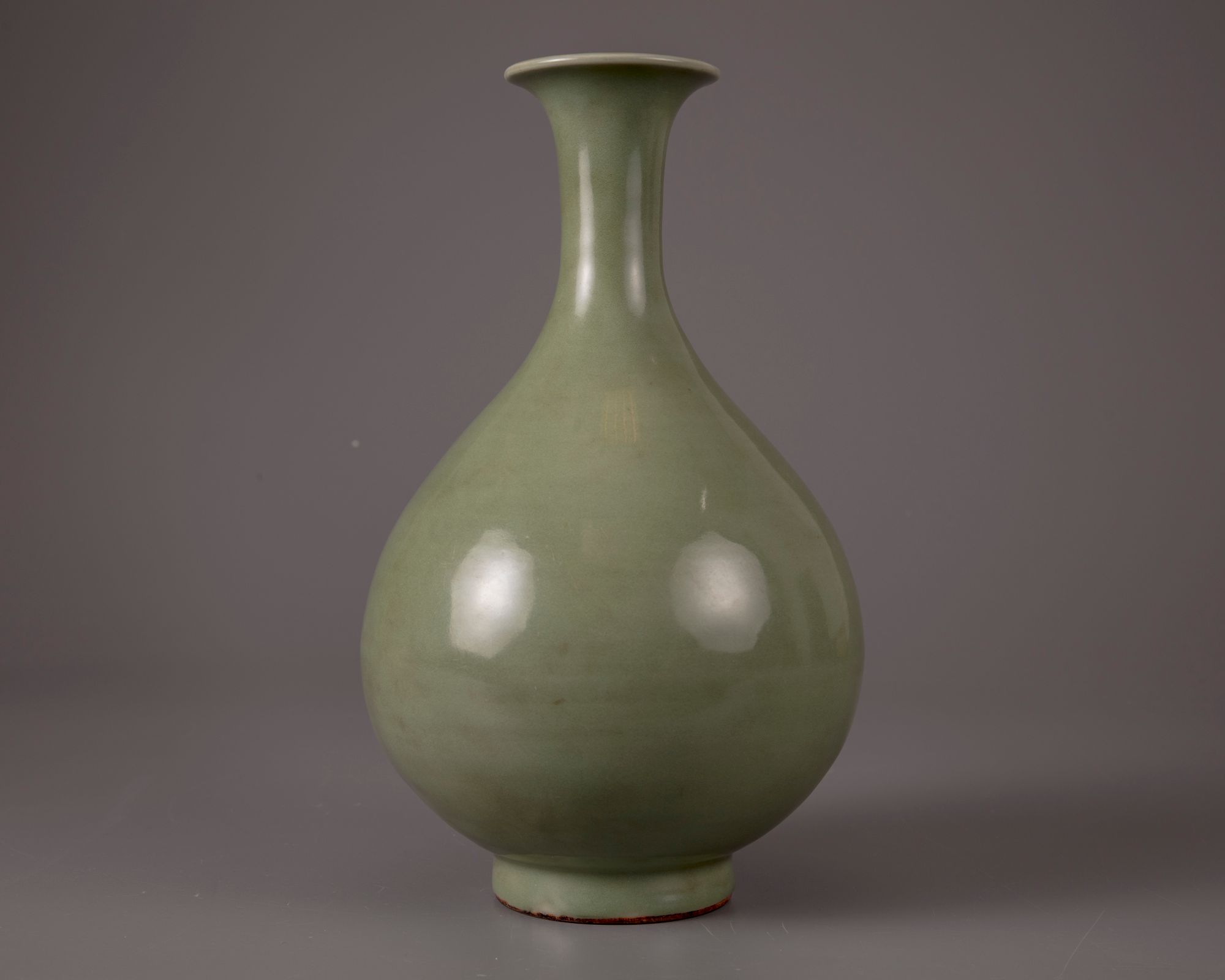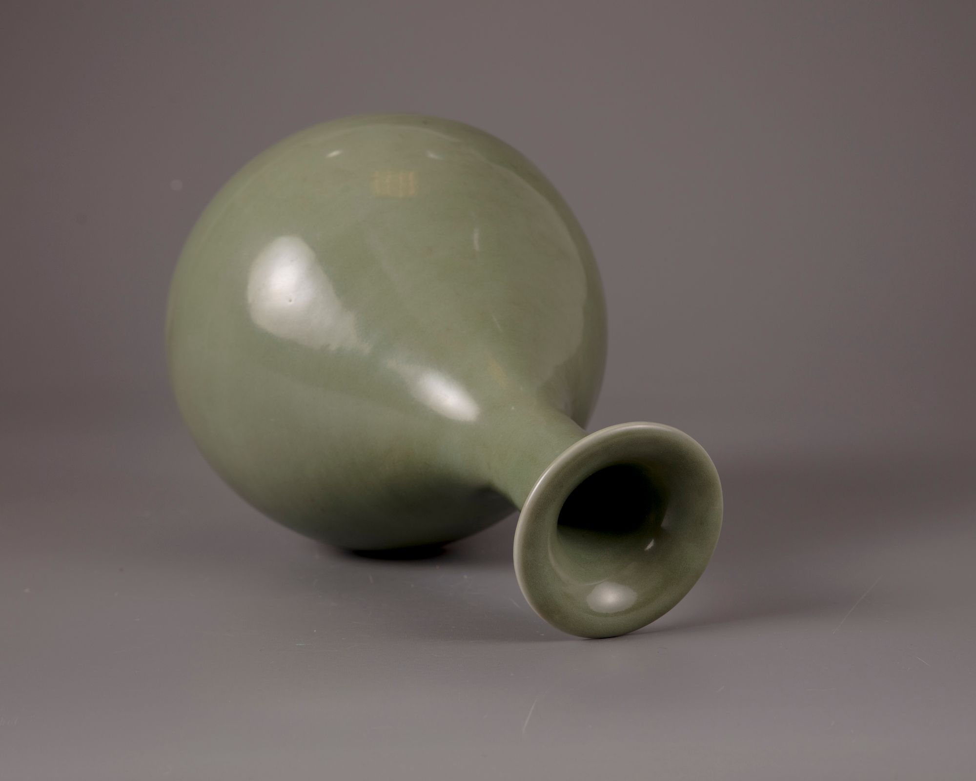 The elegantly proportioned pear-shaped body rising from a splayed foot, sweeping up to a tall waisted neck and an everted rim, covered overall in an even sea-green glaze. save for the unglazed footring.