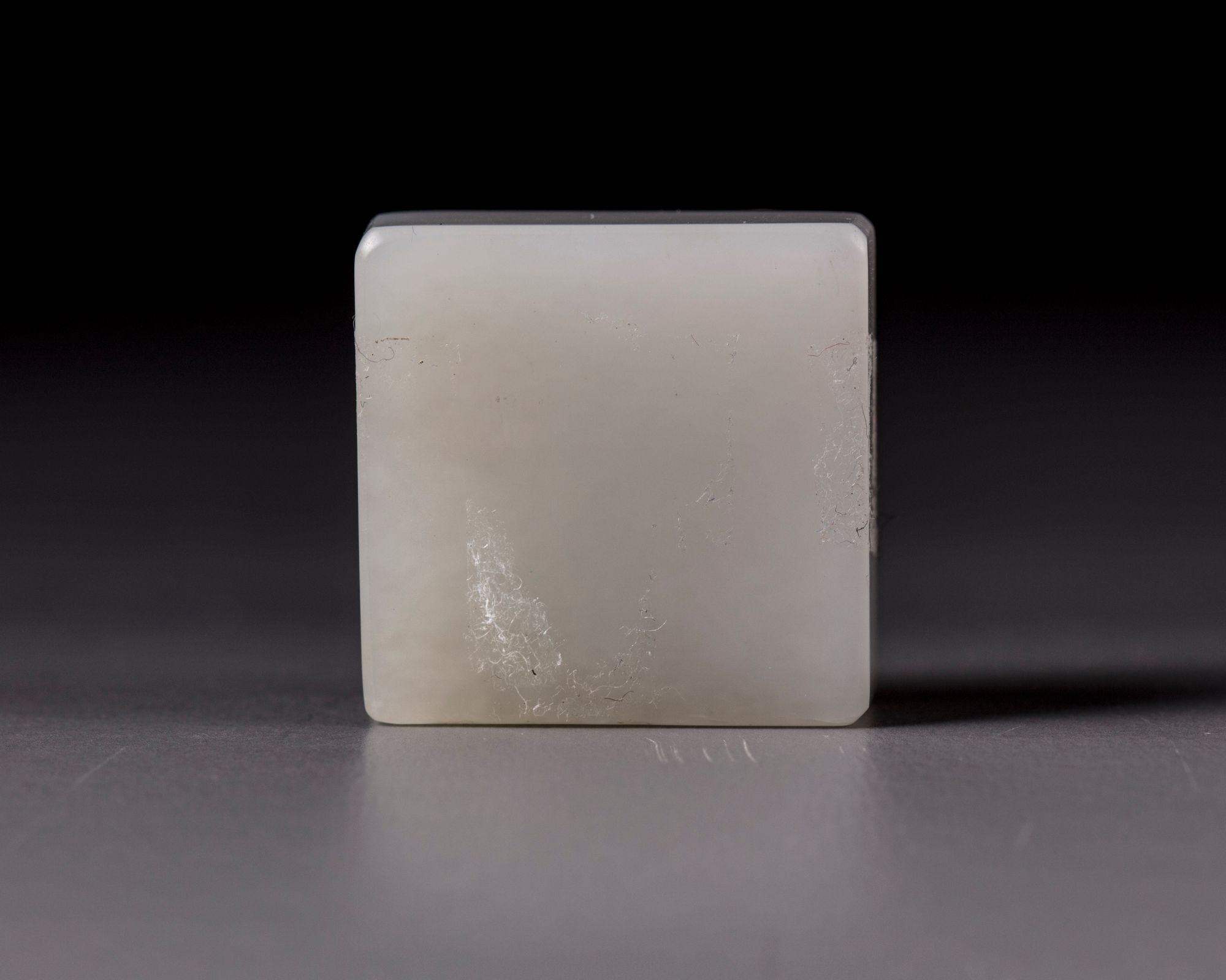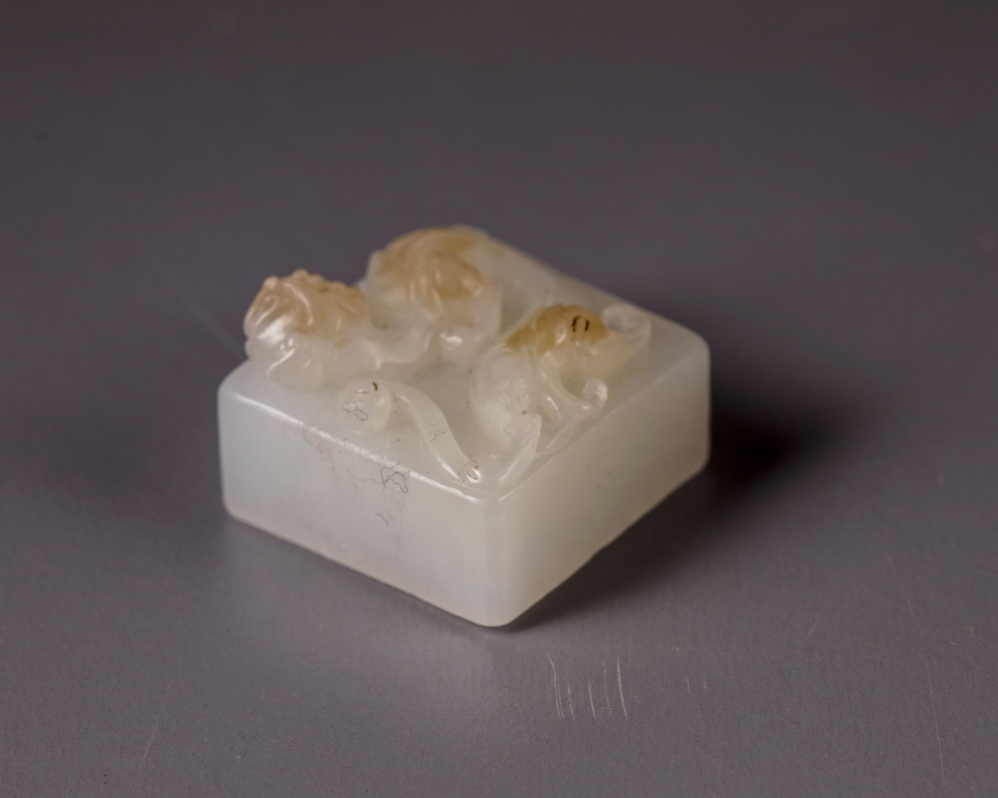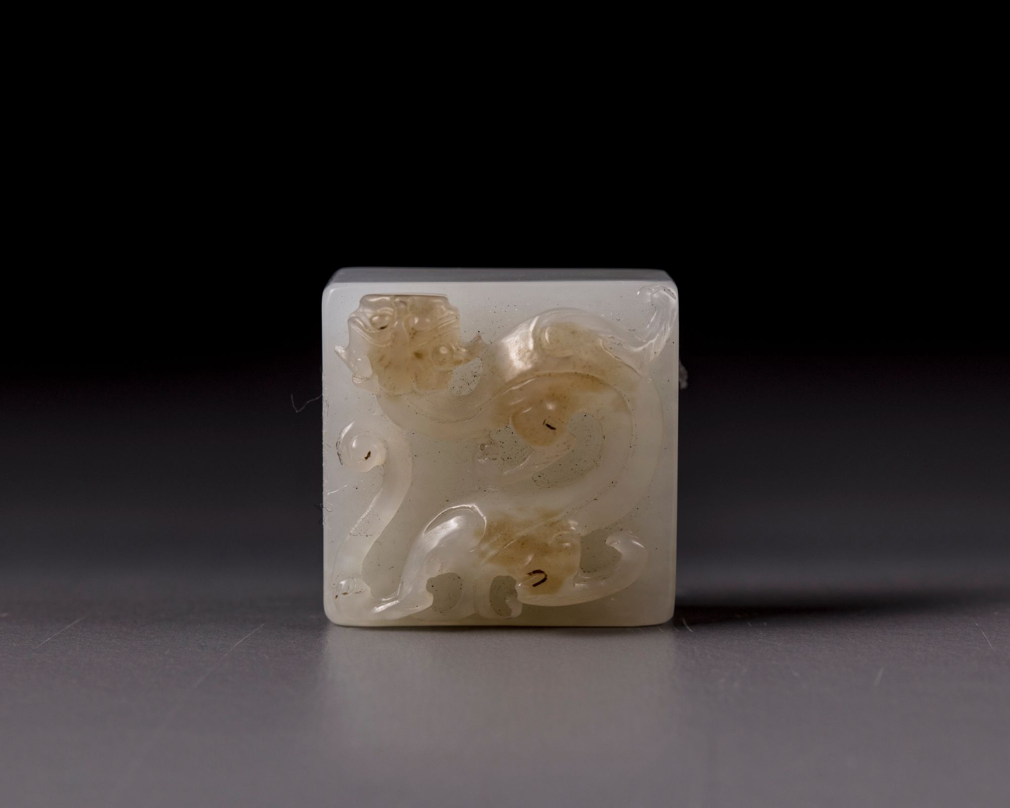 The jade seal is surmounted by a winding chilong carved in high relief. The stone of a pale tone with some russet inclusions. The seal face is uncarved.