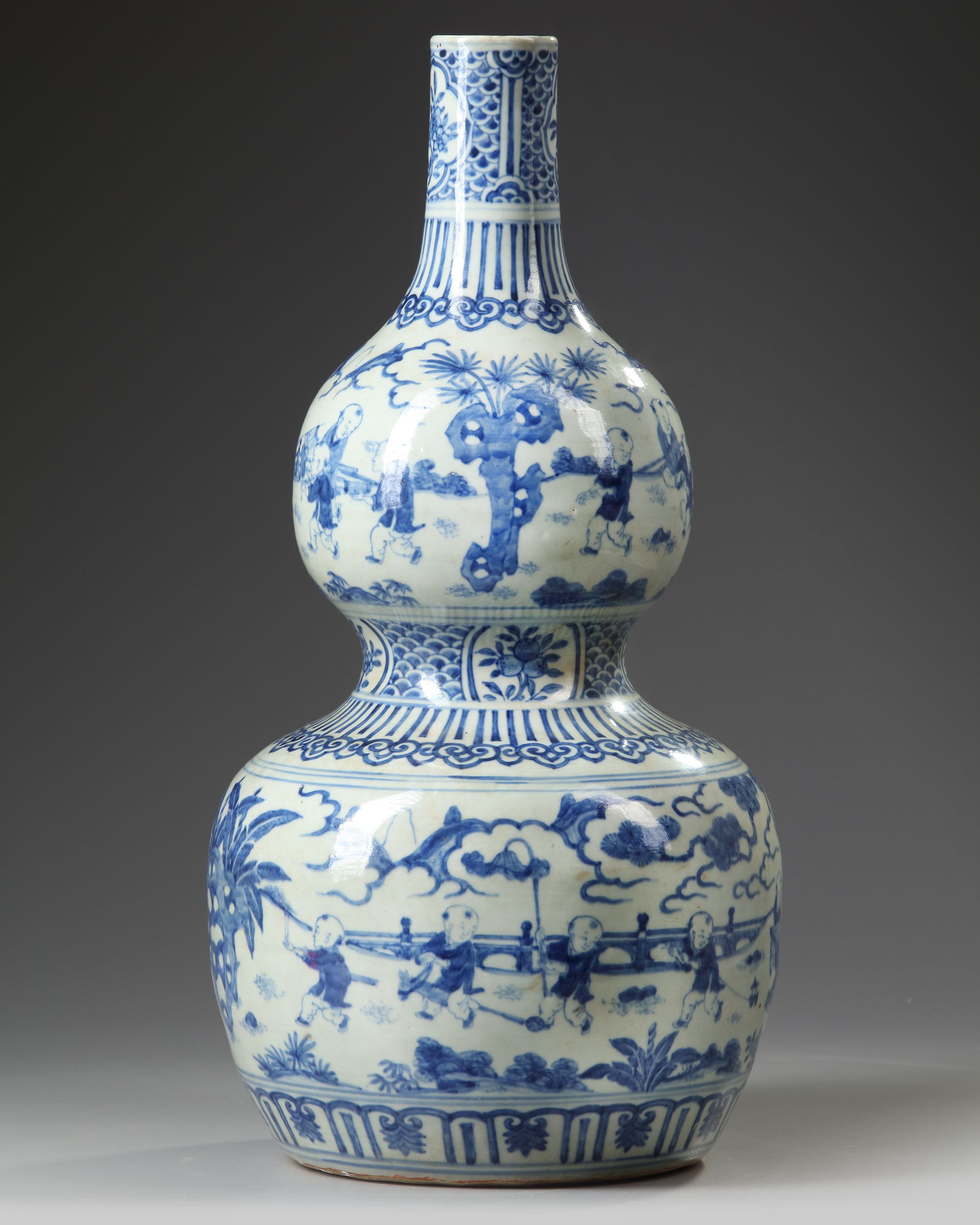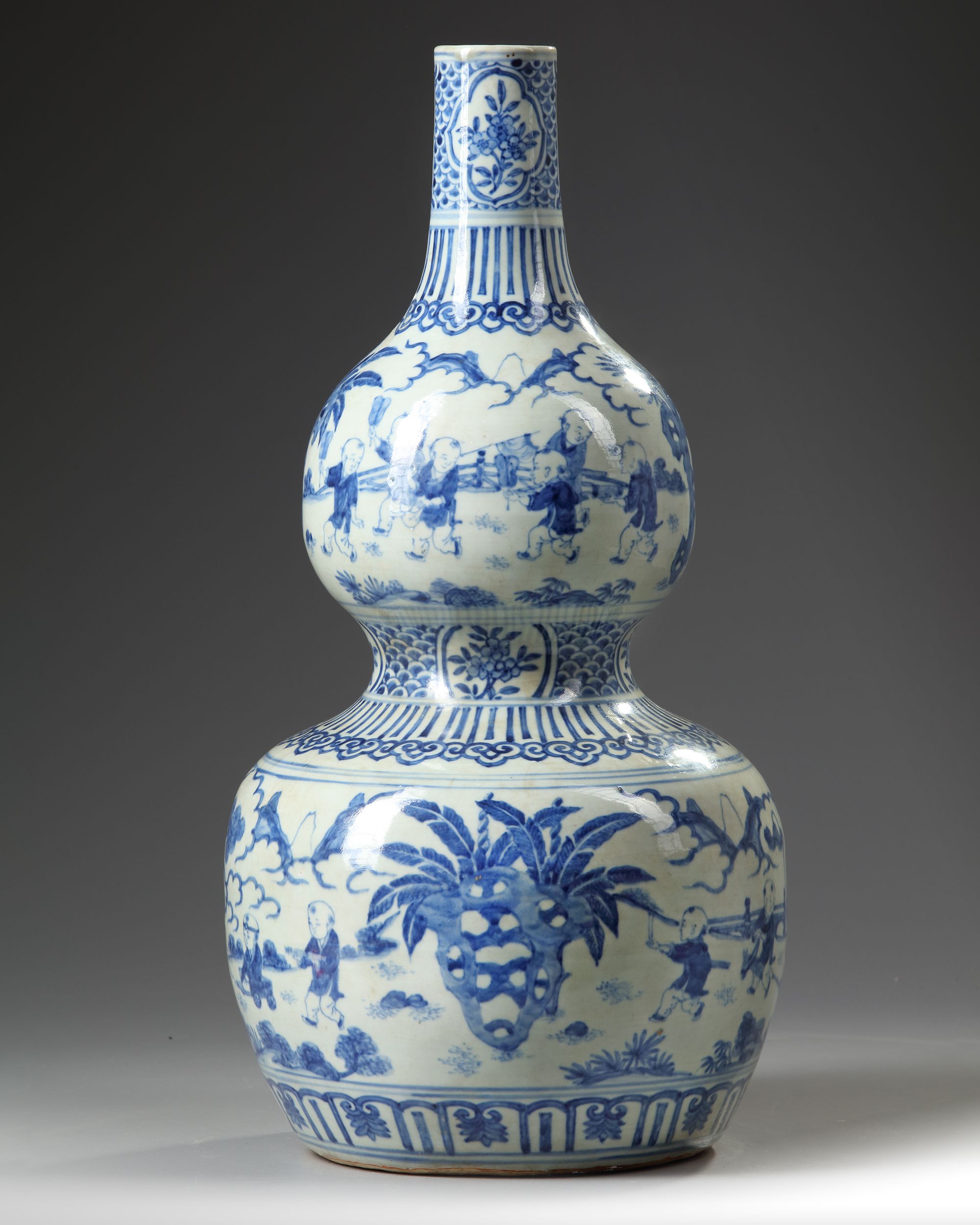 A Large Chinese double gourd vase, decorated with hundred boys at play separated by a band of ruyi heads and a diaper band coating flowers.