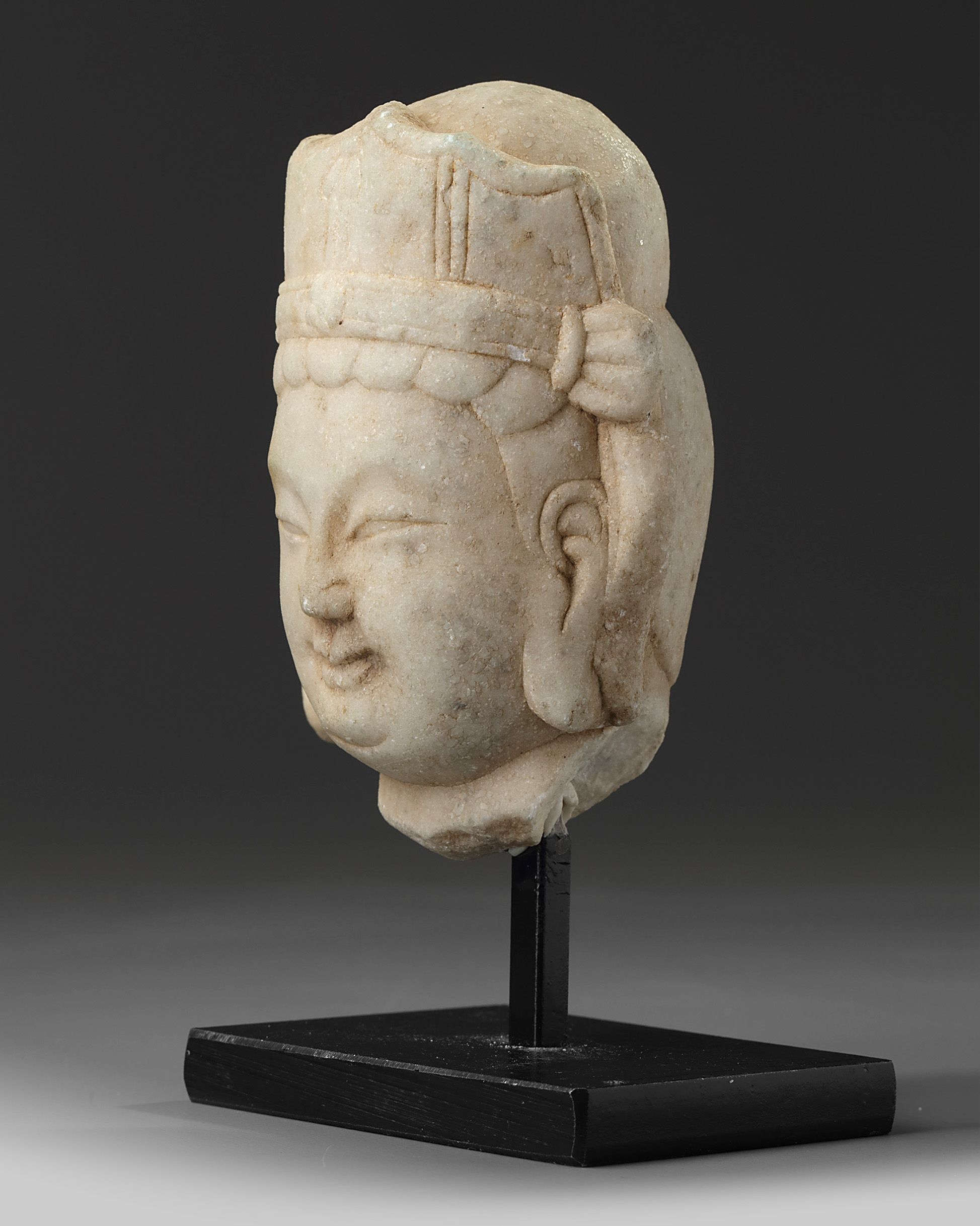 The head is carved smiling with her hair piled high on her head behind a crown, with some dangling tassels by her head still visible. The stone is of an even white tone.
