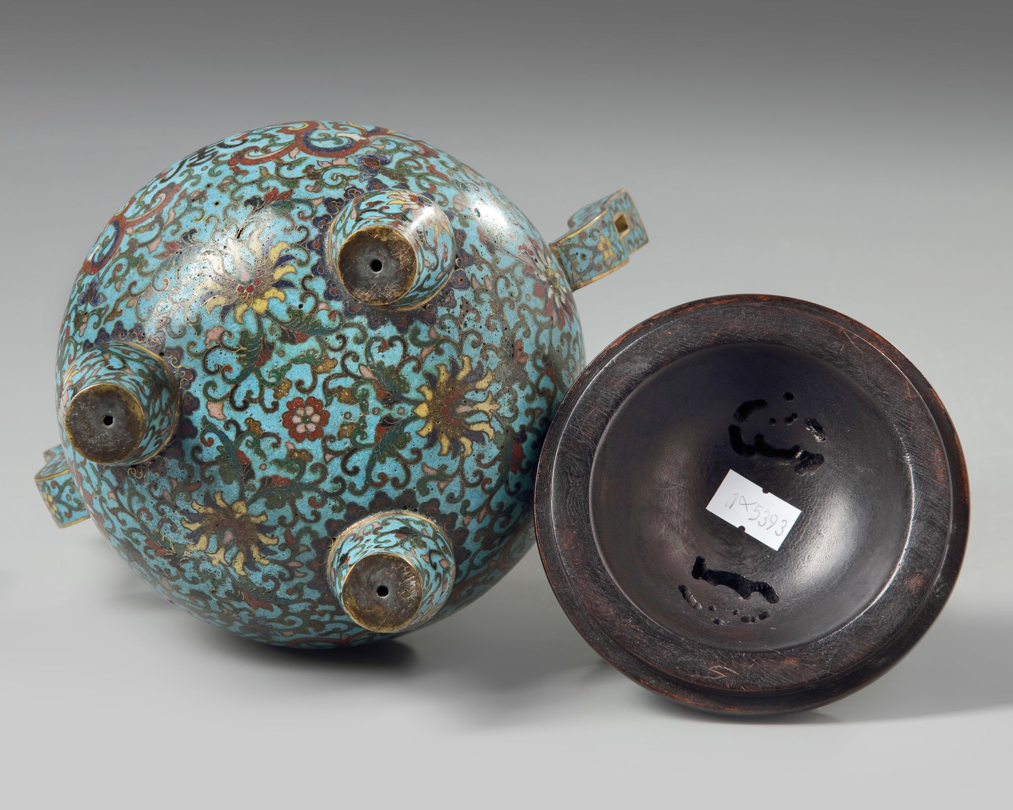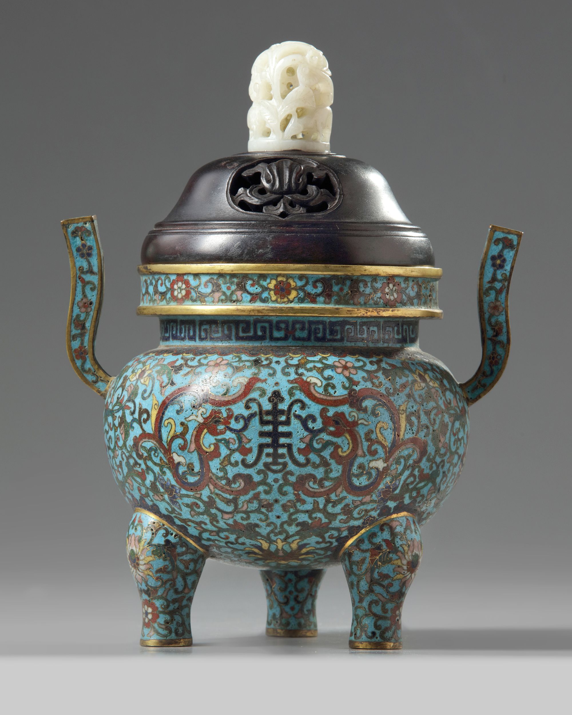 The censer is decorated to the body with two upright handles and a shou character in archaic script flanked by two kui dragons on a ground of scrolling lotus. The neck is decorated with a ruyi-head and keyfret band, and the rim is decorated with a flower band. The wood cover is carved with pierced decoration and is surmounted by a white jade finial.
