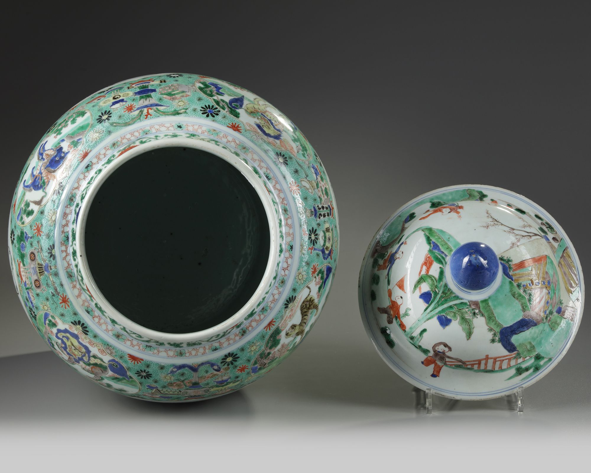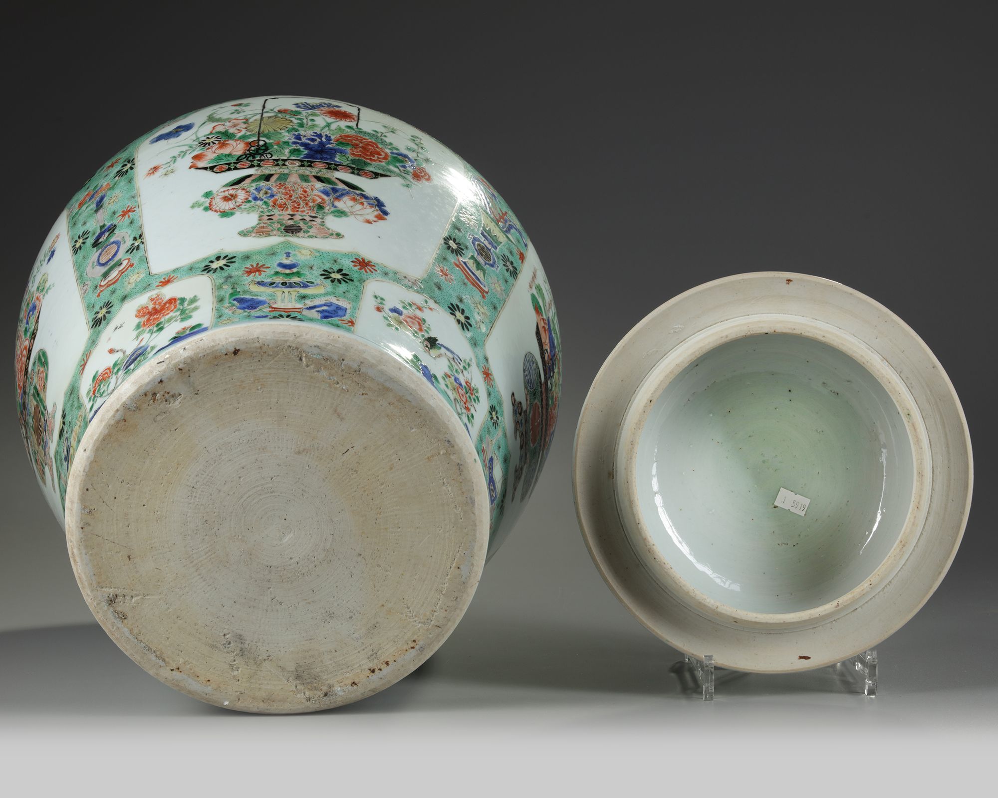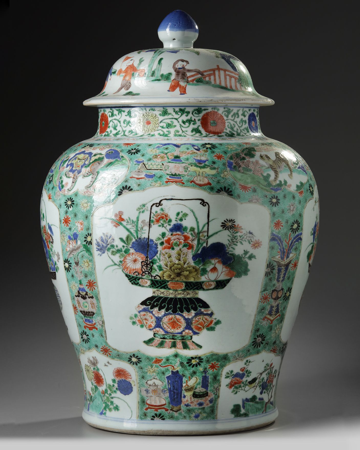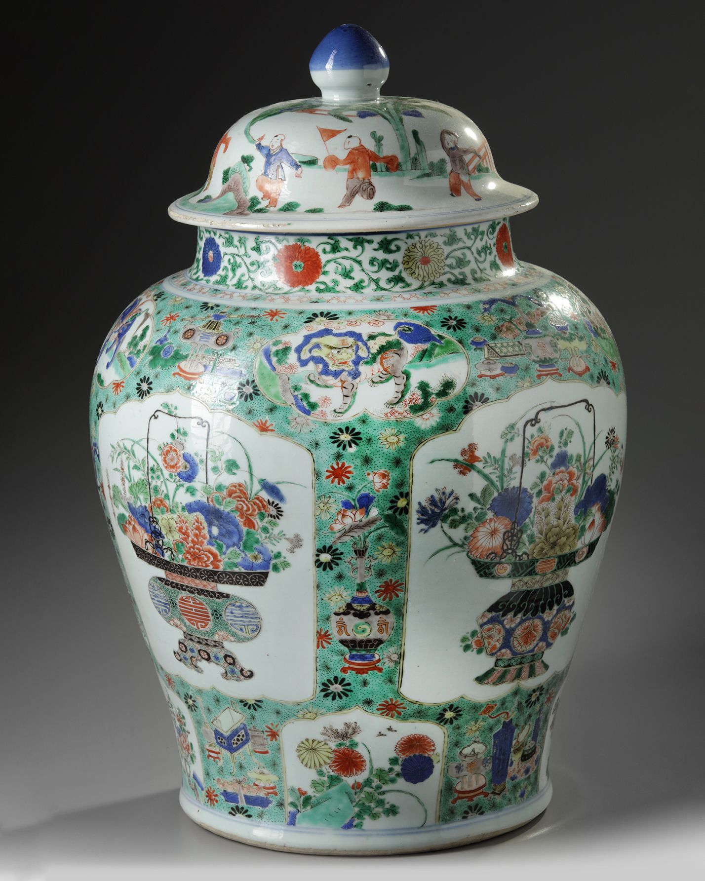 The jar is finely decorated with large panels enclosing flower baskets interspersed with smaller cartouches enclosing auspicious beasts, all reserved on a ground of precious objects and flower heads. The foot is decorated with panels enclosing flowers. The associated wucai cover is decorated with boys at play.