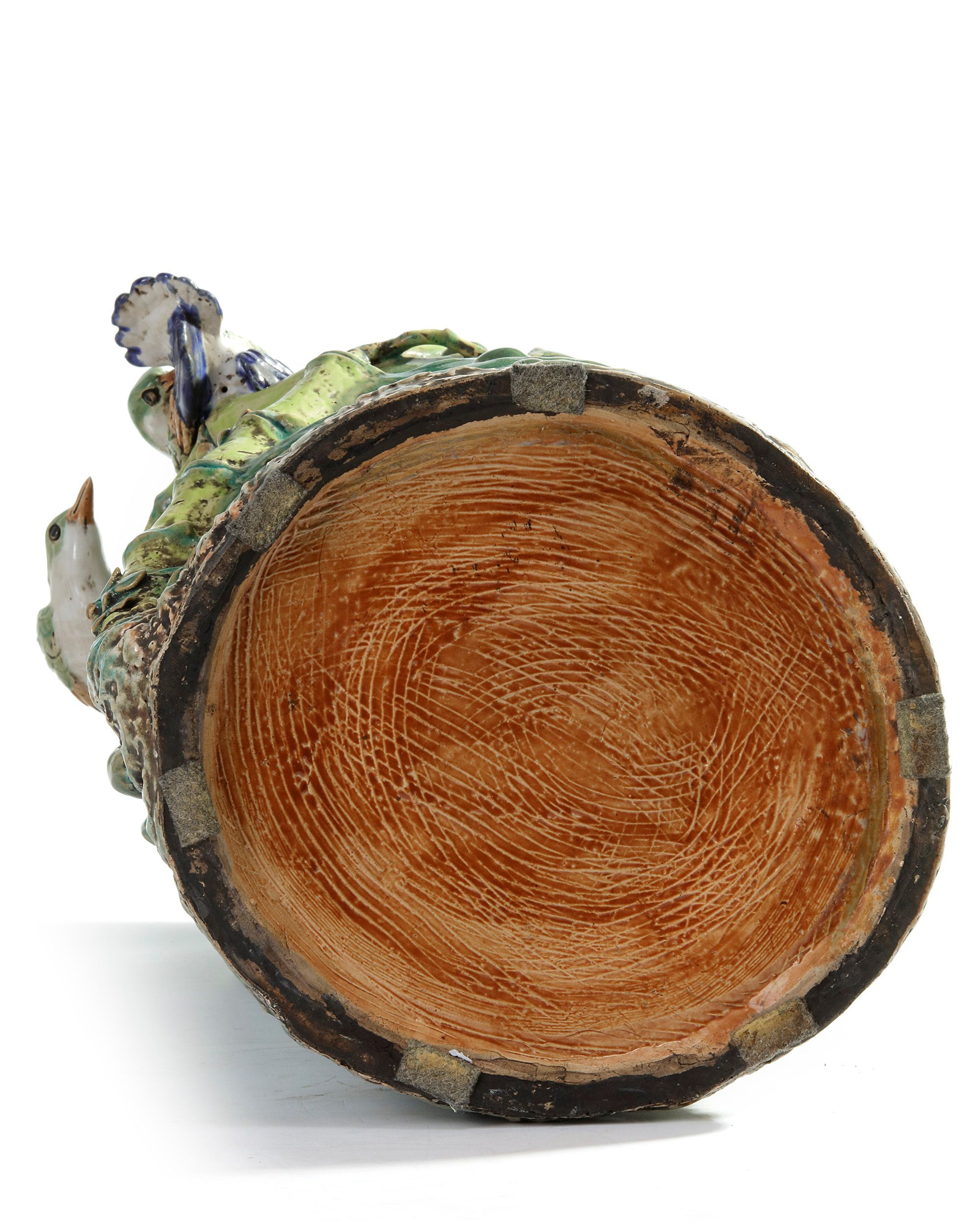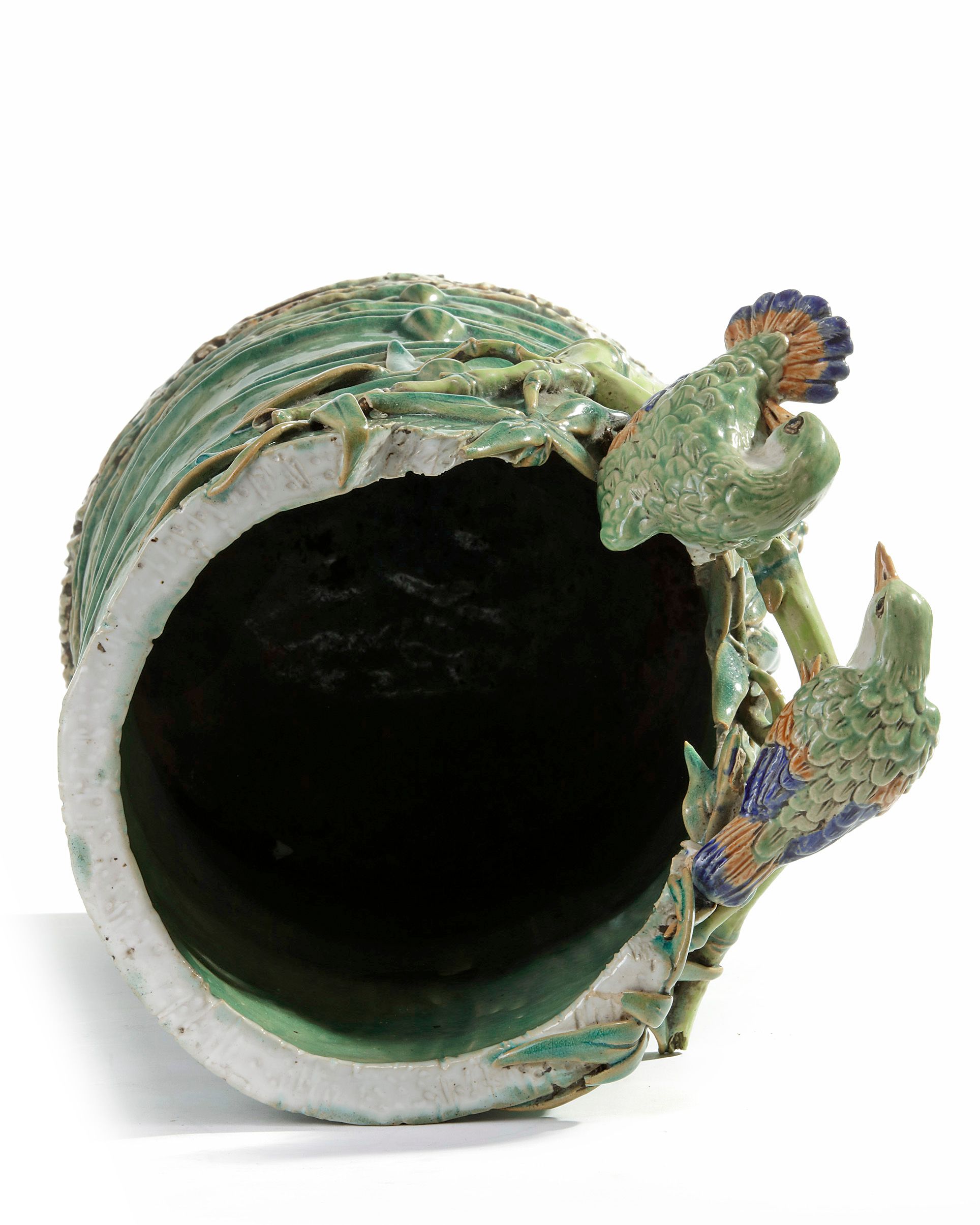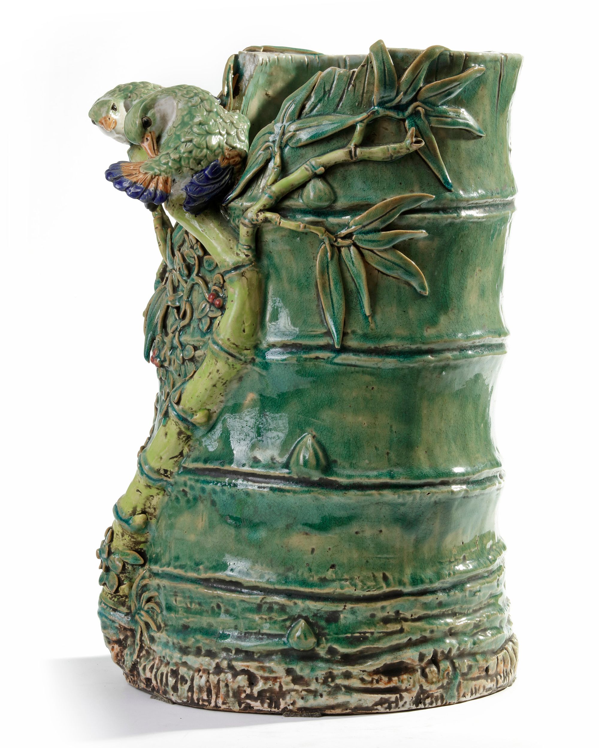 The umbrella stand is delicately modelled as a thick bamboo stalk with a flowering plant growing to the side with two birds perched on top.