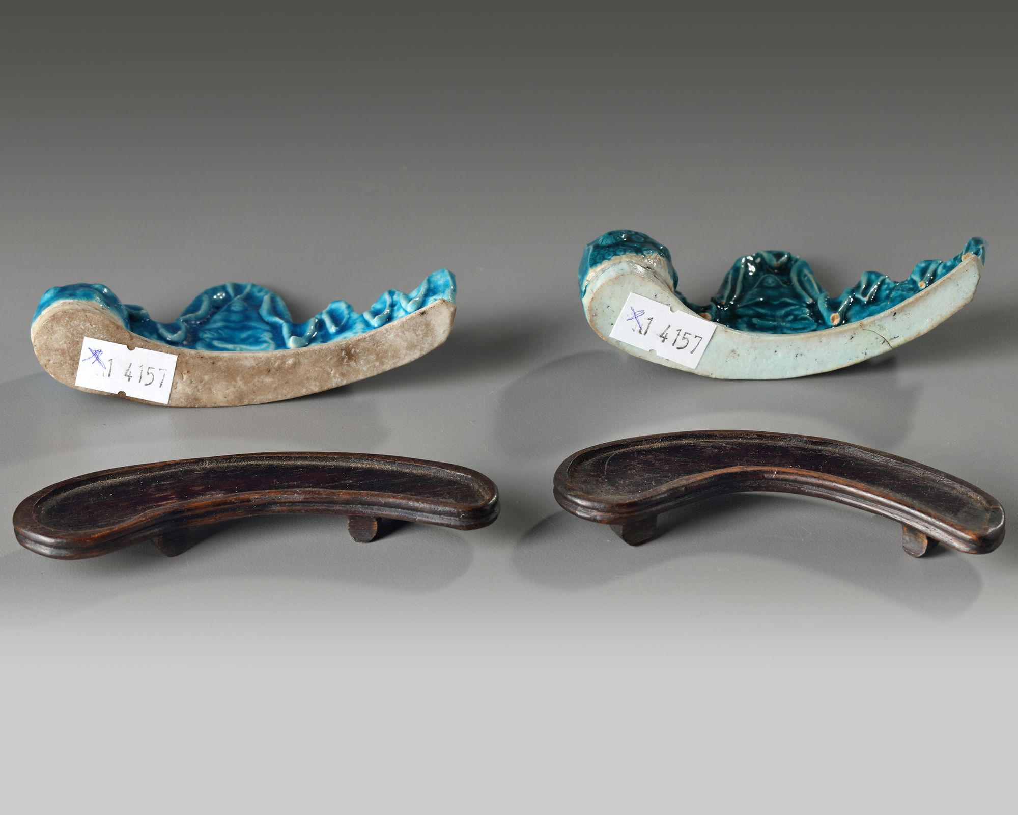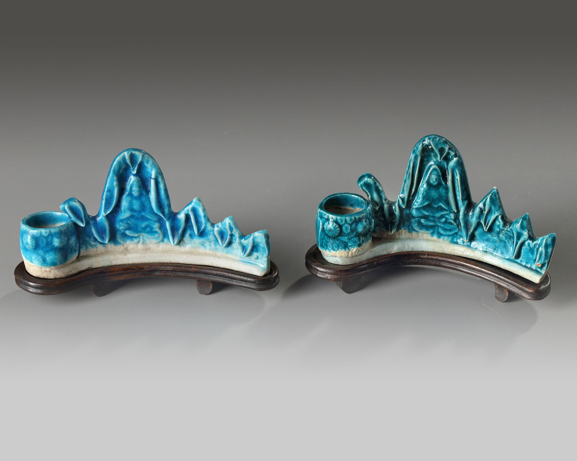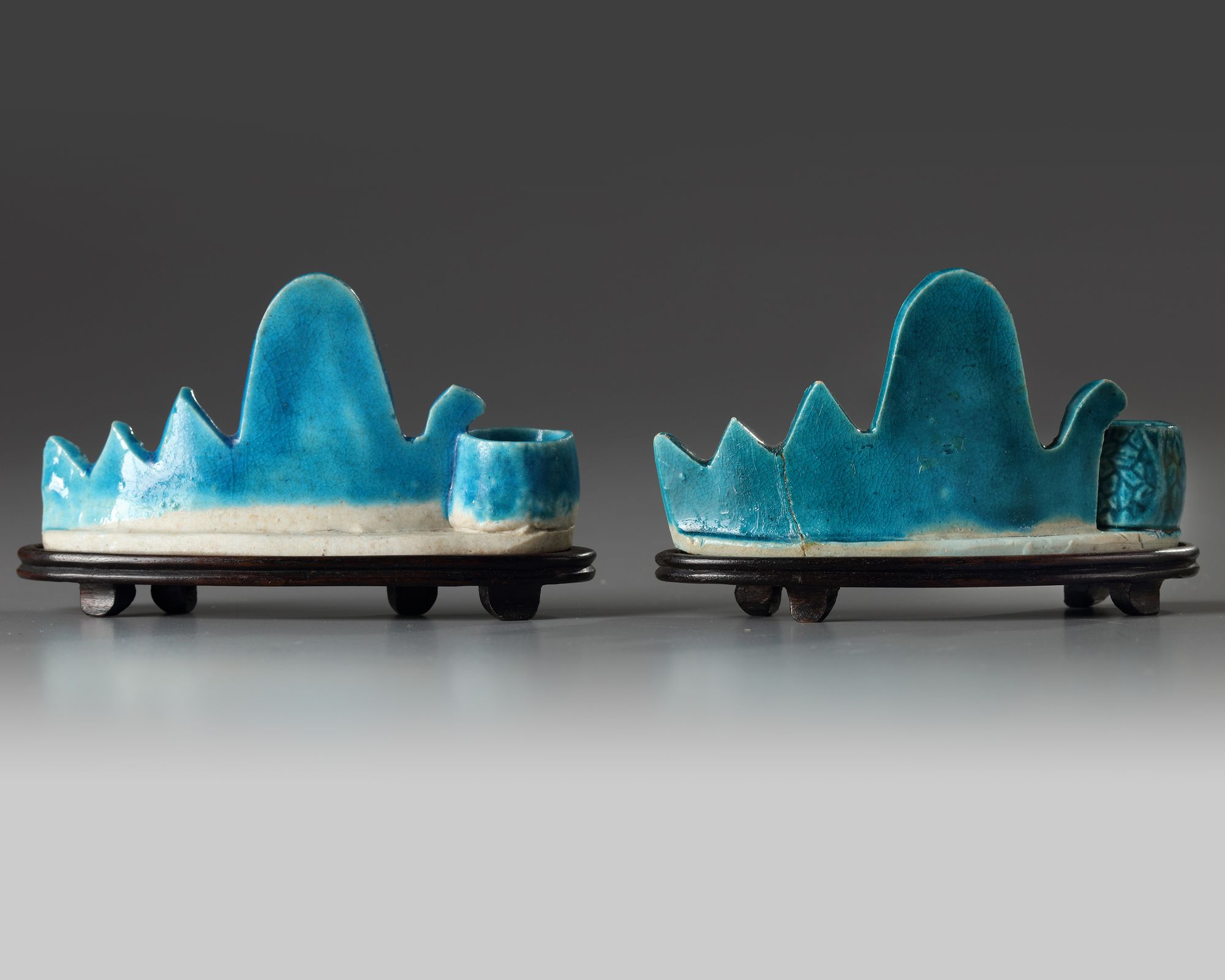 A pair of Chinese turquoise-glazed mountain-form brush rests