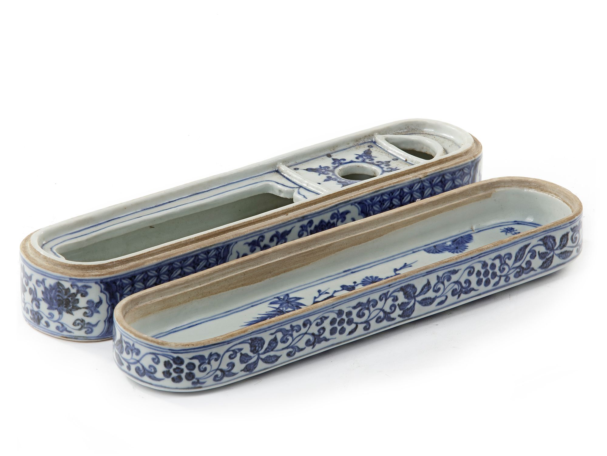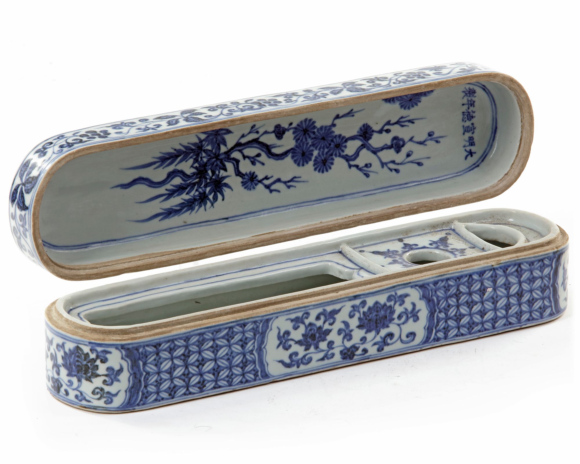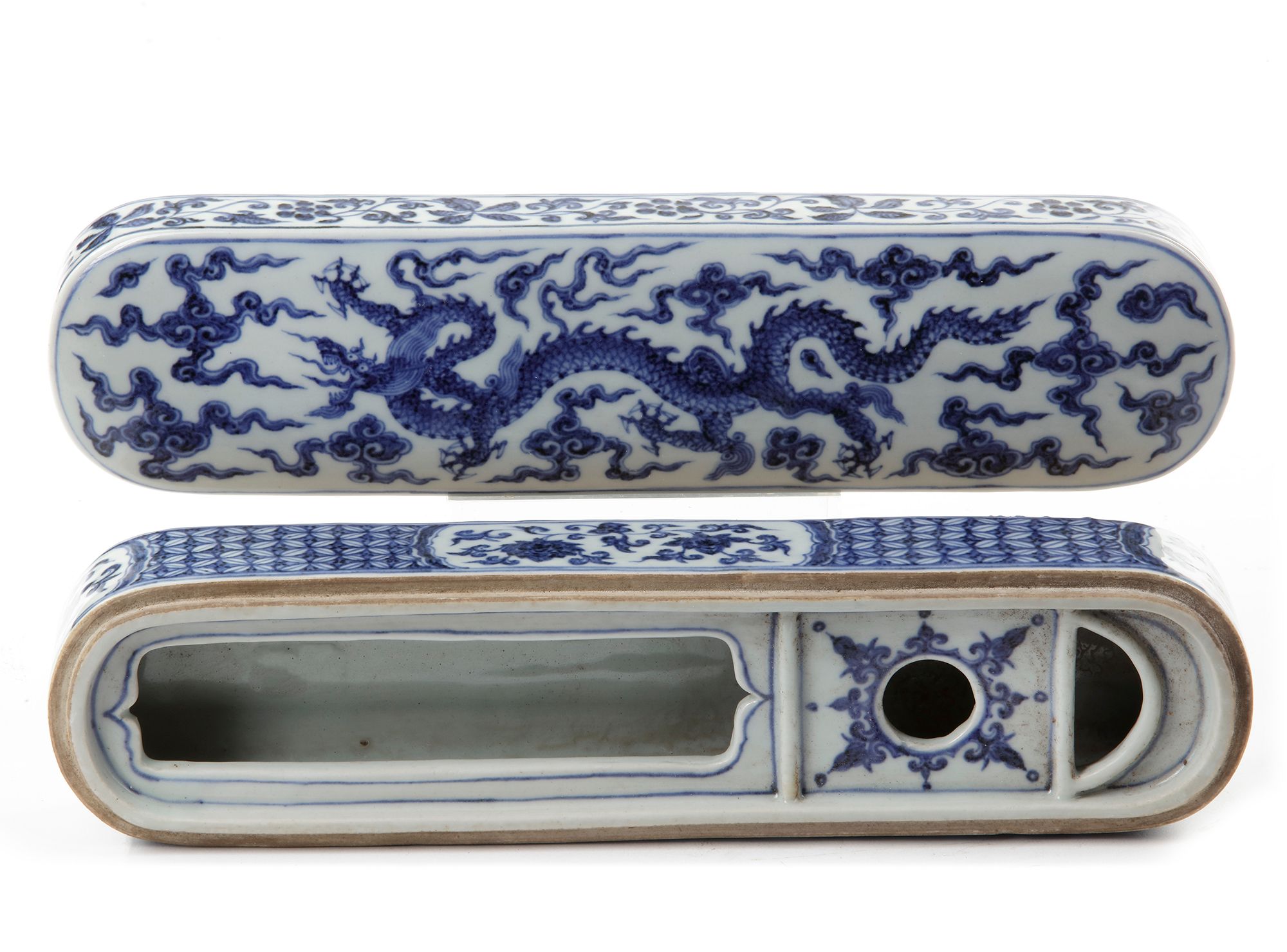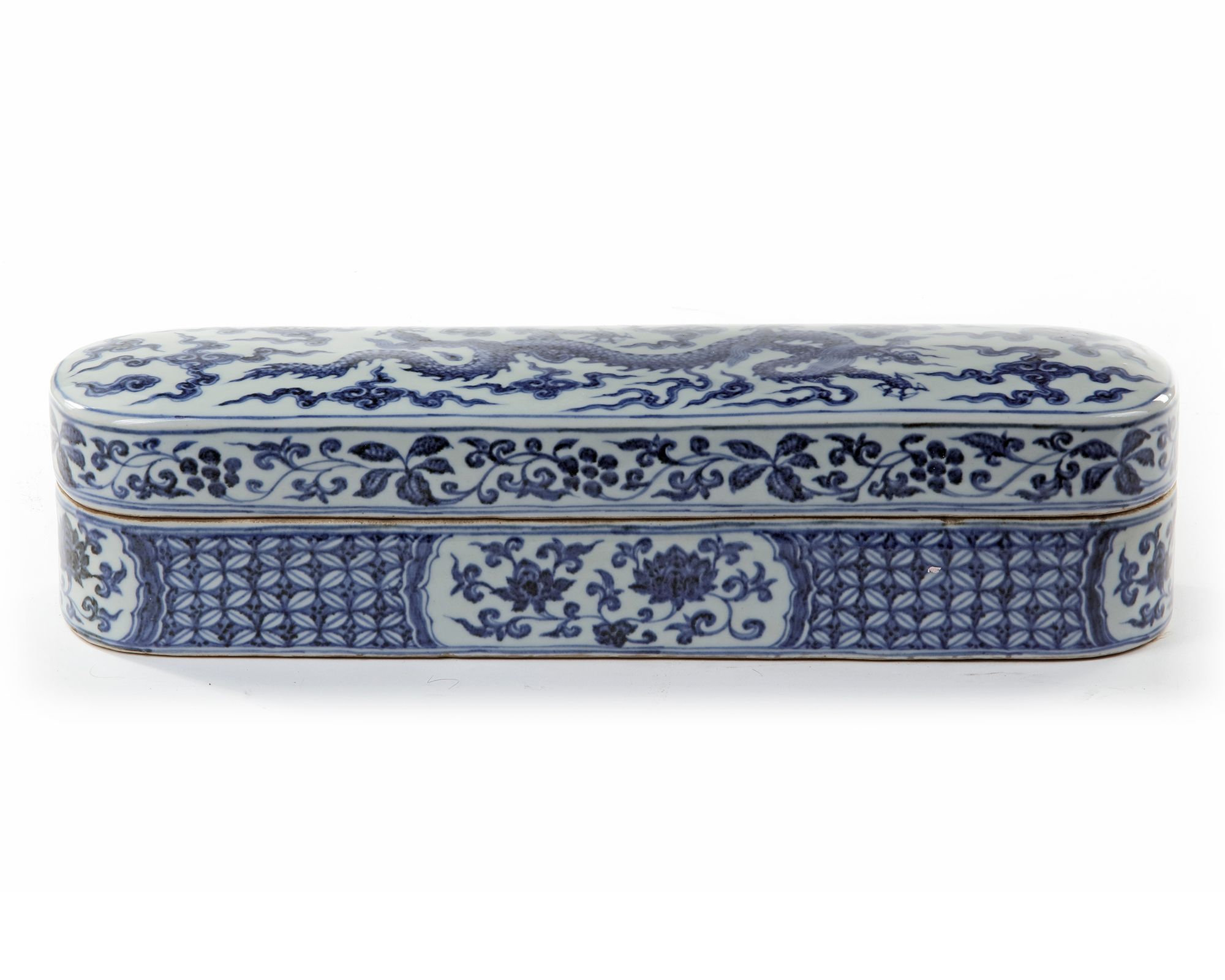 The elongated box is decorated with four cartouches containing lotus scrolls, on a honeycomb ground. The cover is decorated with a five-clawed dragon striding amongst clouds, the sides with flowers and foliage while the inside with the Three Friends of Winter, prunus, bamboo and pine Chinese Xuande six character mark. 32.5 by 8 by 8 cm.