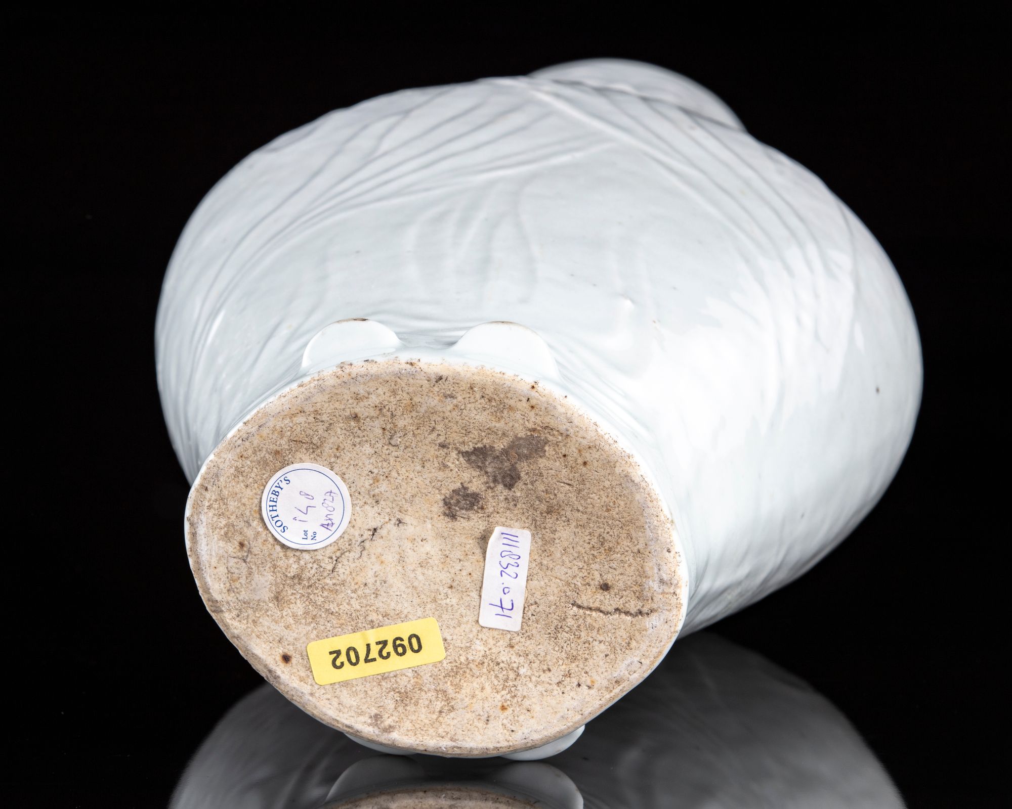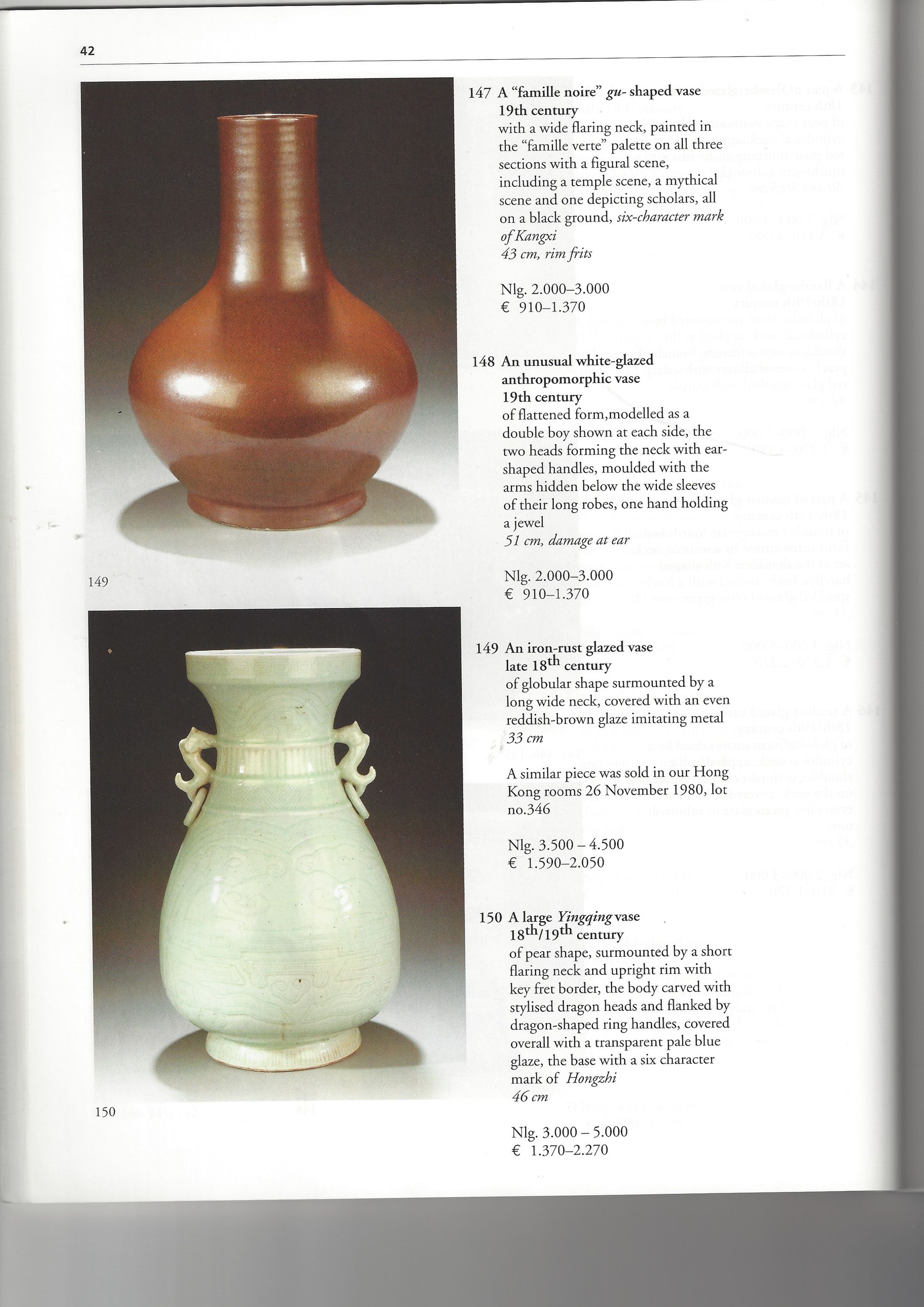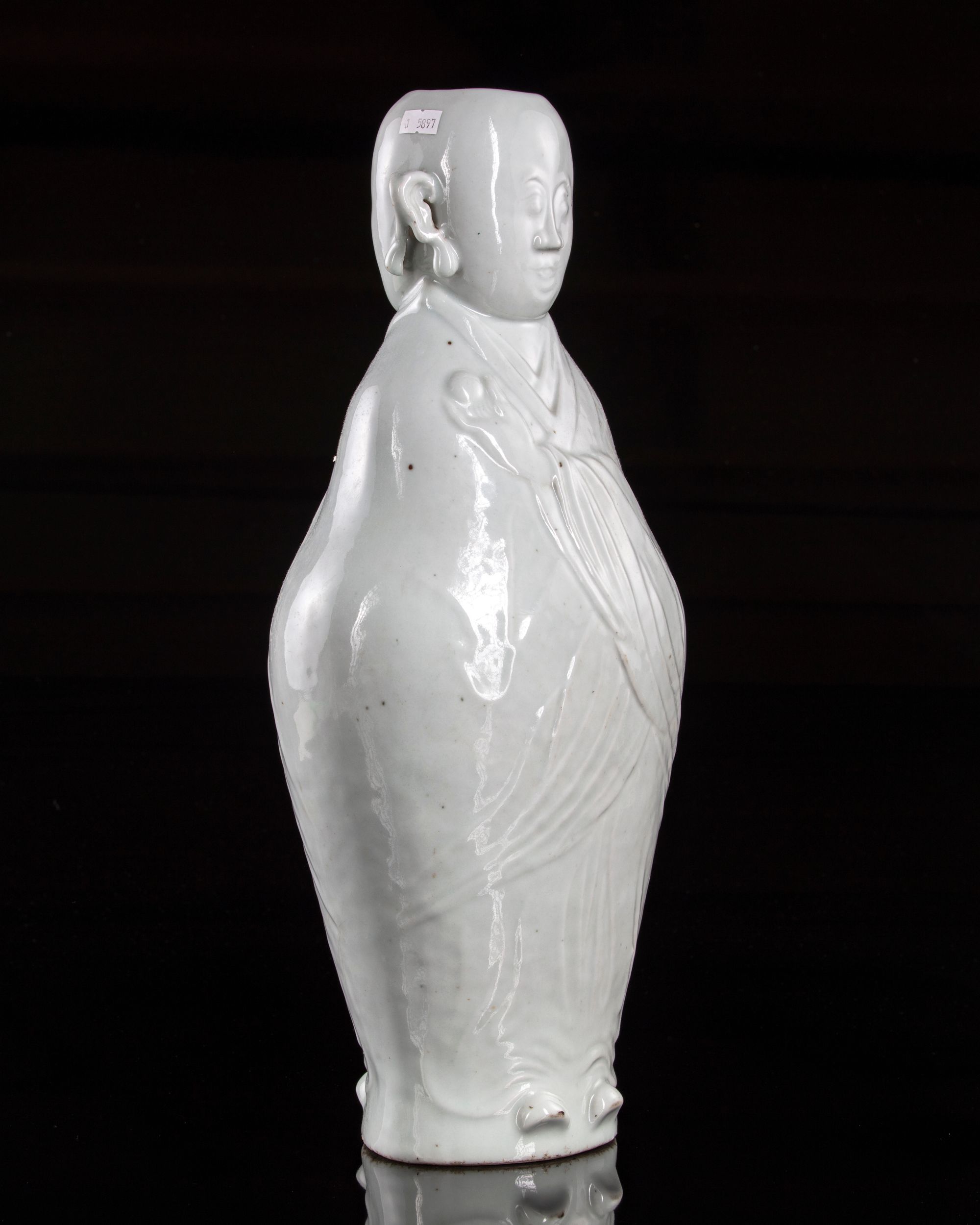 Of flattened form, modelled as a double boy shown at each side, the two heads forming the neck with earshaped handles, moulded with the arms hidden below the wide sleeves of their long robes, one hand holding a jewel. Provenance: An analoge vase lot 148 was sold in Sothebys auction house in Amsterdam 21 November 2001