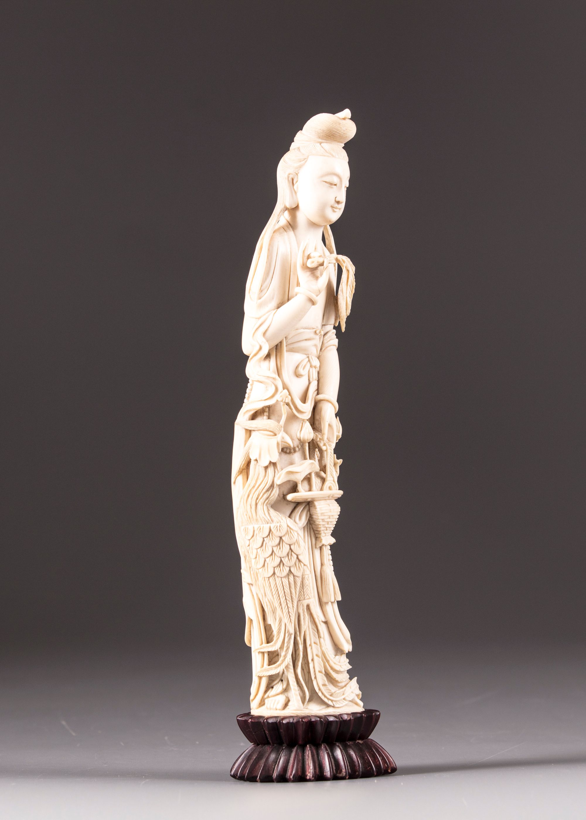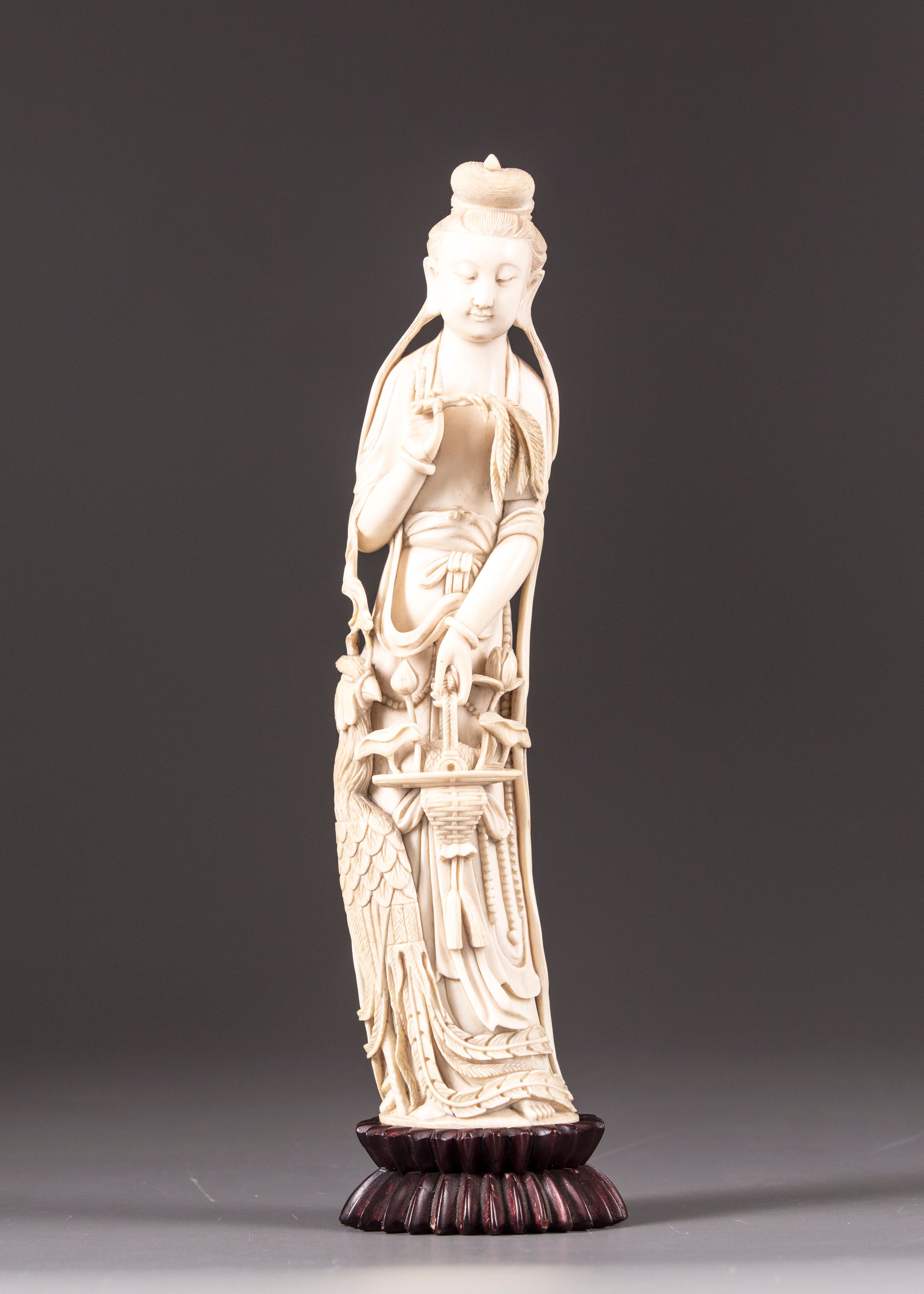 An ivory figure of a lady holding phoenix feathers in her right hand and a basket containing a fish with lotus flowers in her left. She's standing beside a Phoenix.