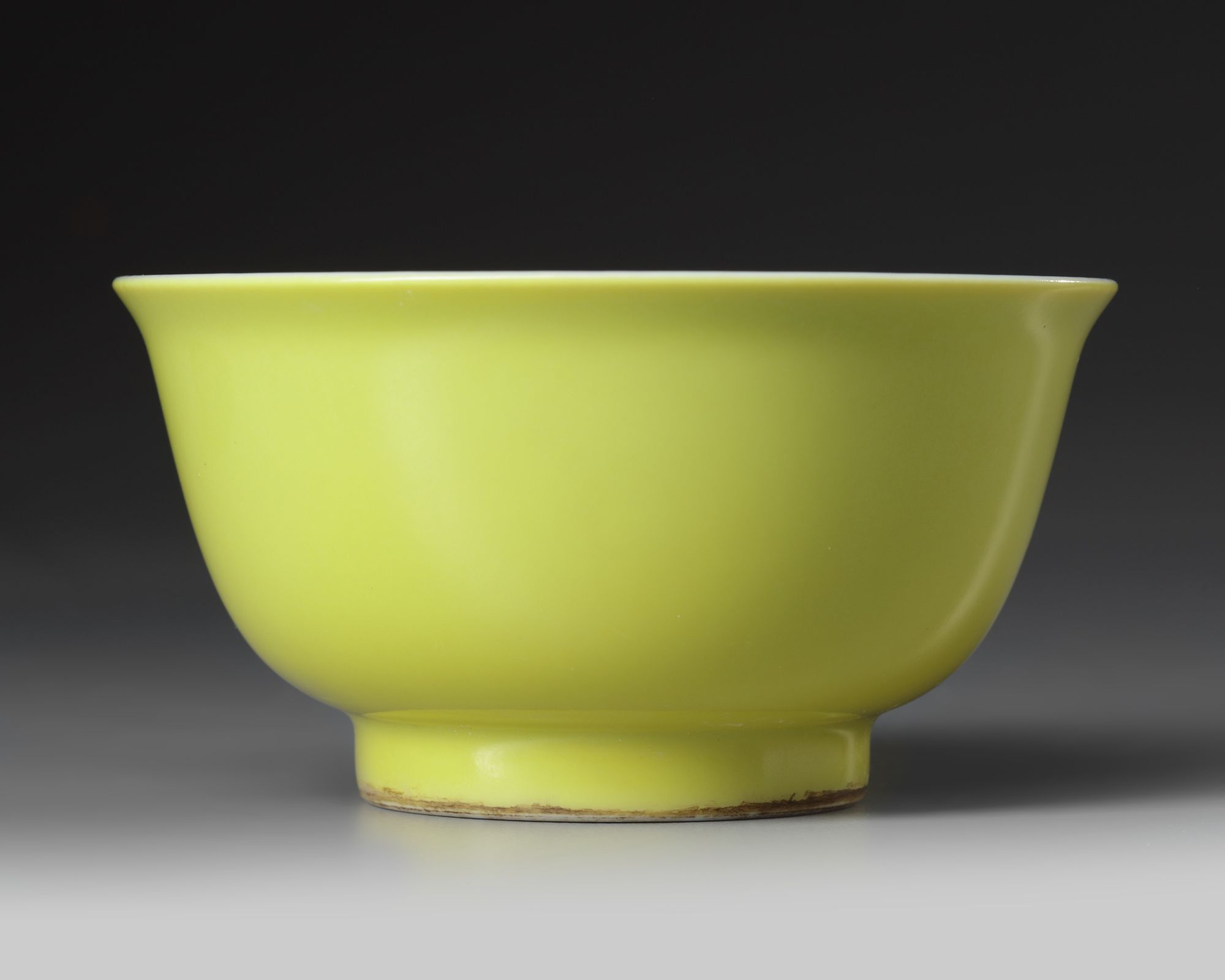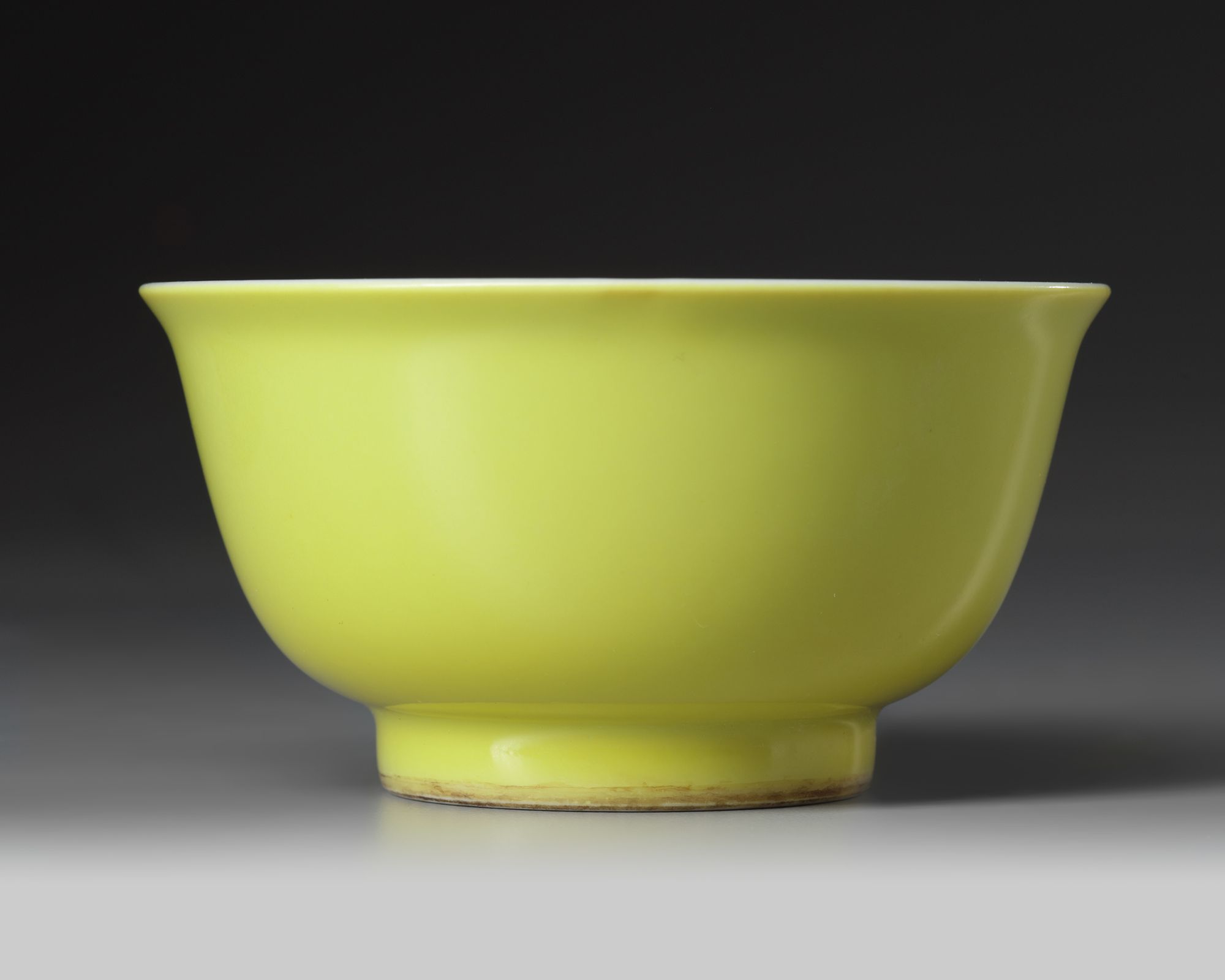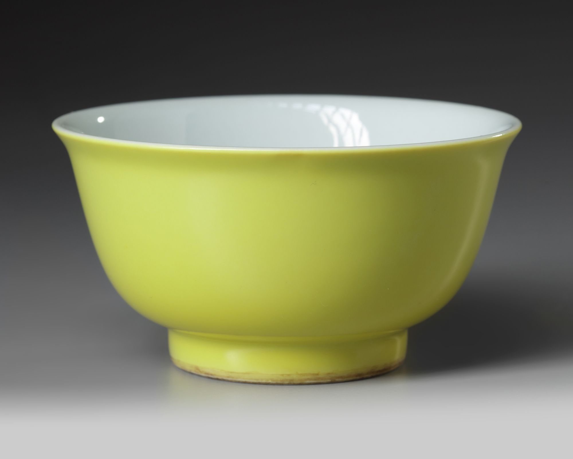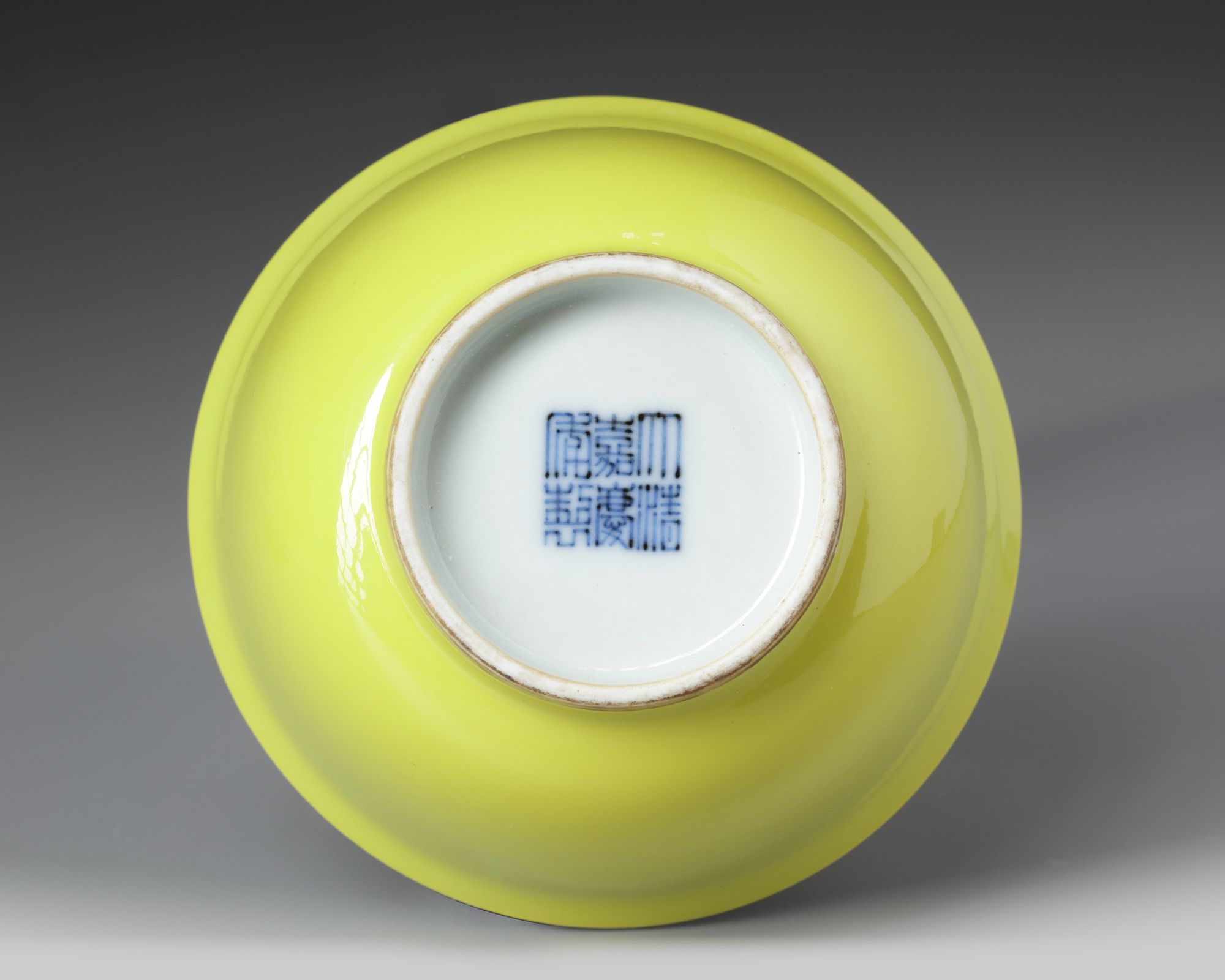 The bowl is glazed to the exterior in lemon yellow, each interior and base are white glazed. The base bears an apocryphal Jiaqing mark.