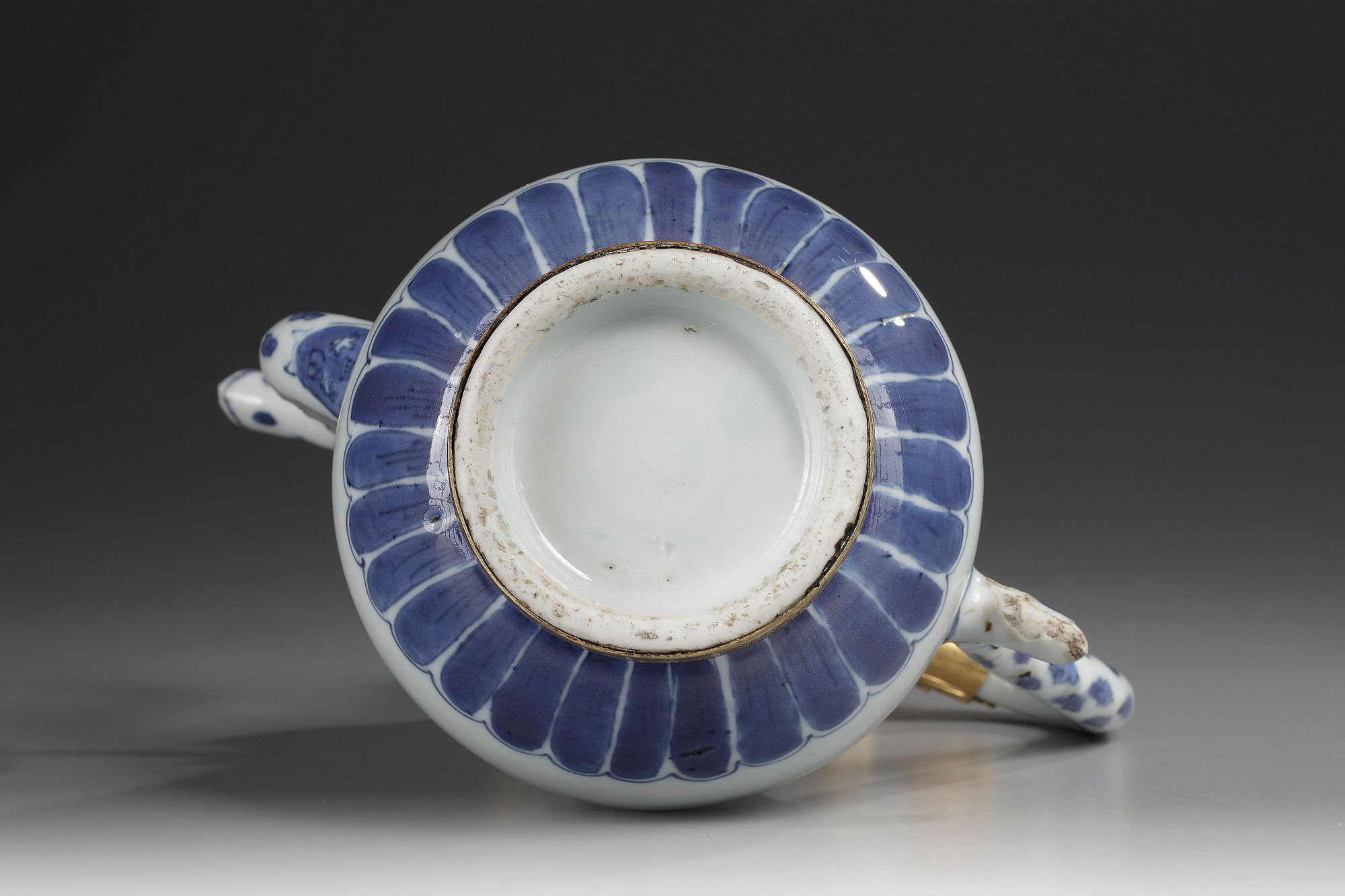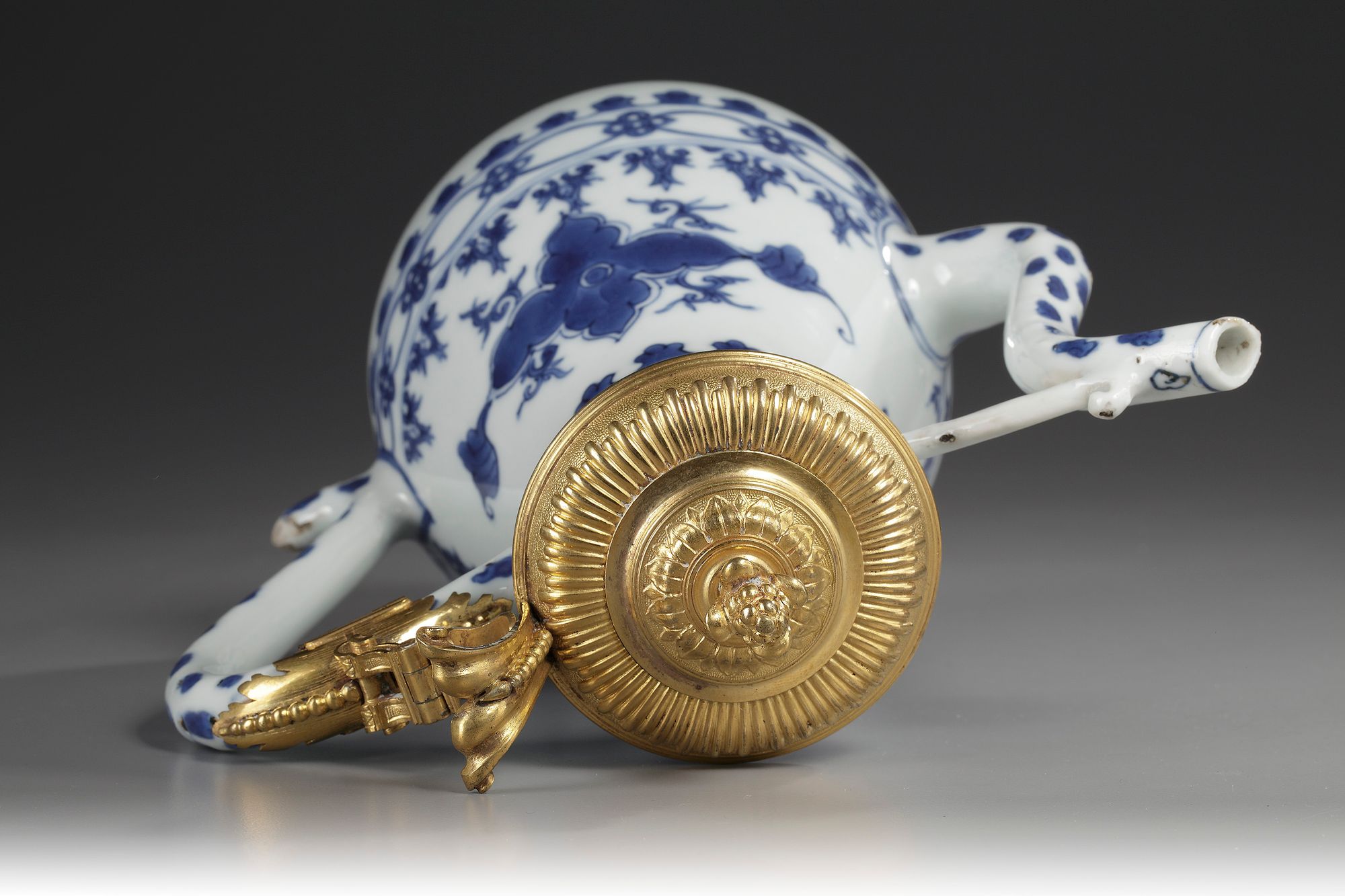 The pear-shaped body with a serpentine spout attached to the body with a stretcher, s-shaped handle and decorated with clouds in underglaze blue. The body is decorated with large flower sprays amongst patterned bands all above a petal band by the foot.