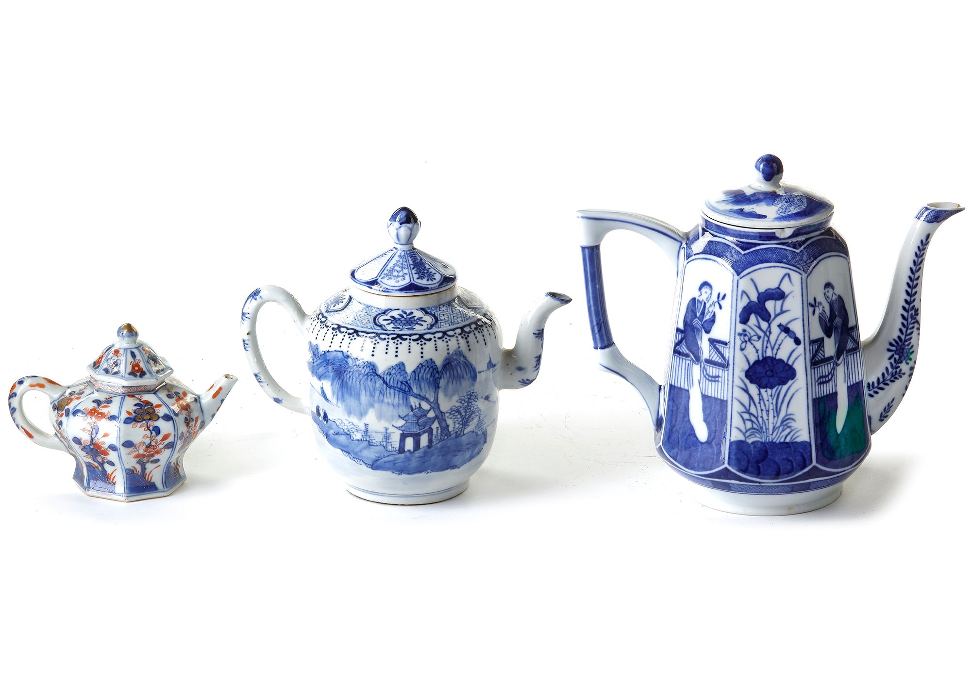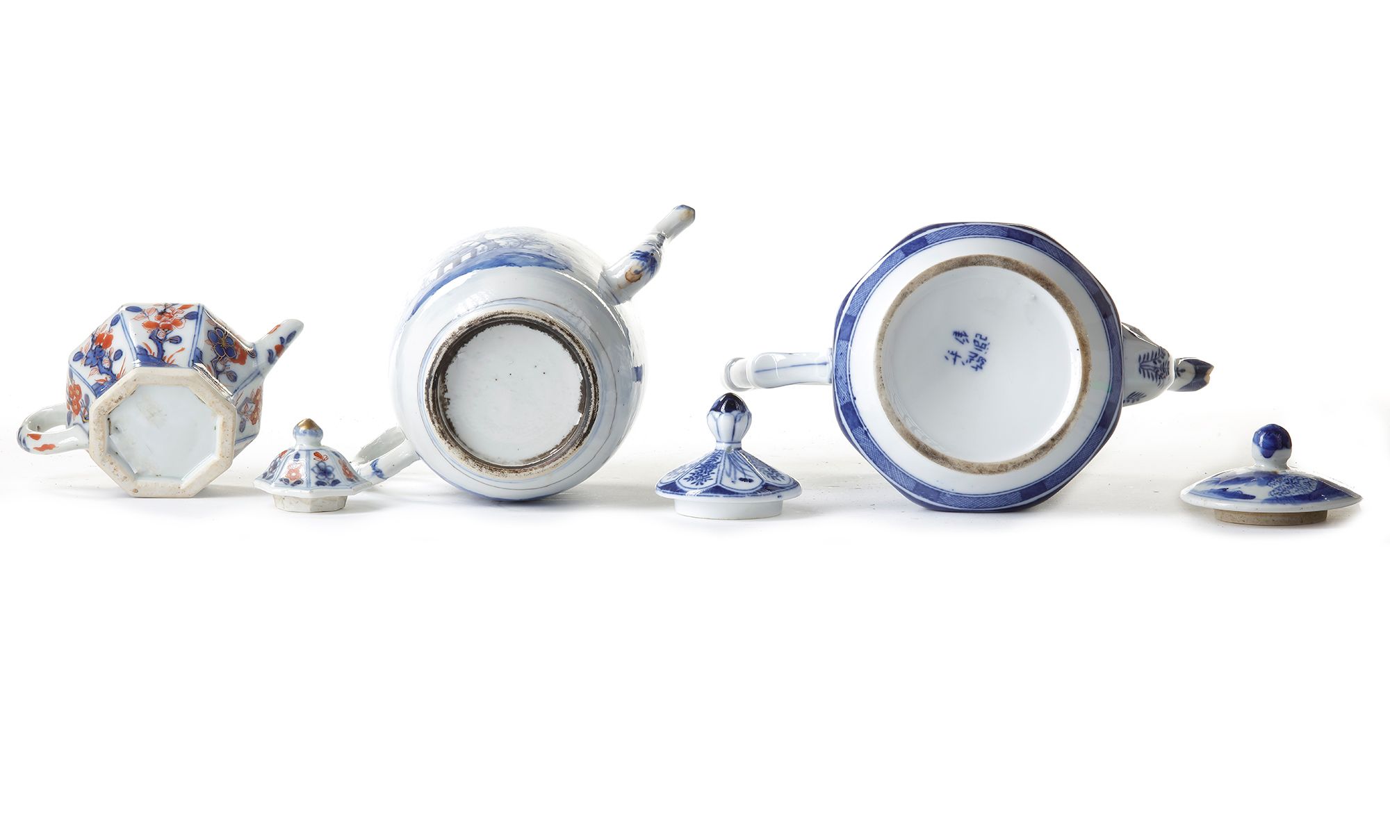 A Chinese octagonal Imari teapot with cover decorated with panels enclosing gilt flower sprays, 10 cm. A Chinese blue and white teapot decorated with figures in a lake landscape, 18 cm. A Chinese blue and white teapot and over decorated with panels enclosing figures and flower sprays, 22 cm.