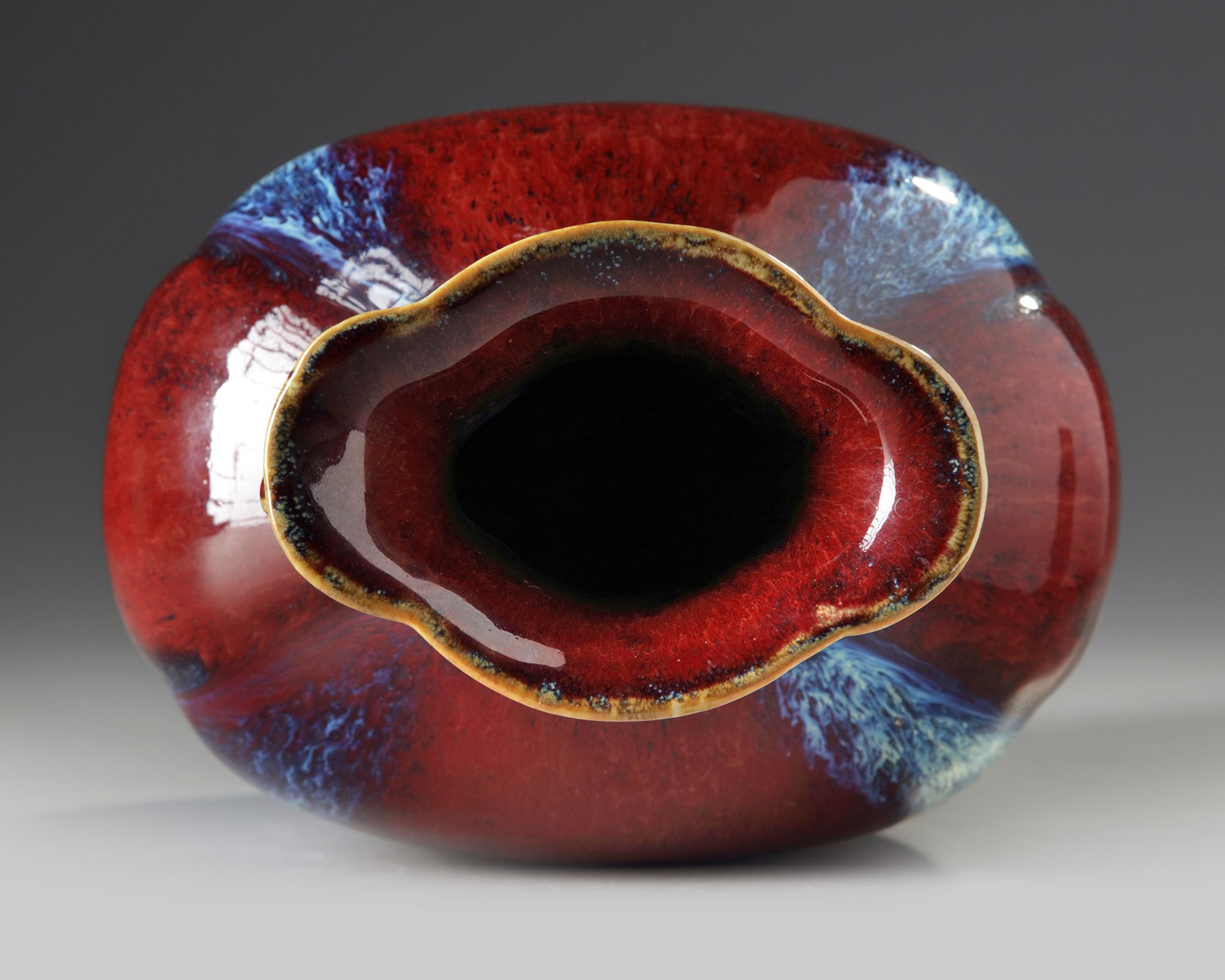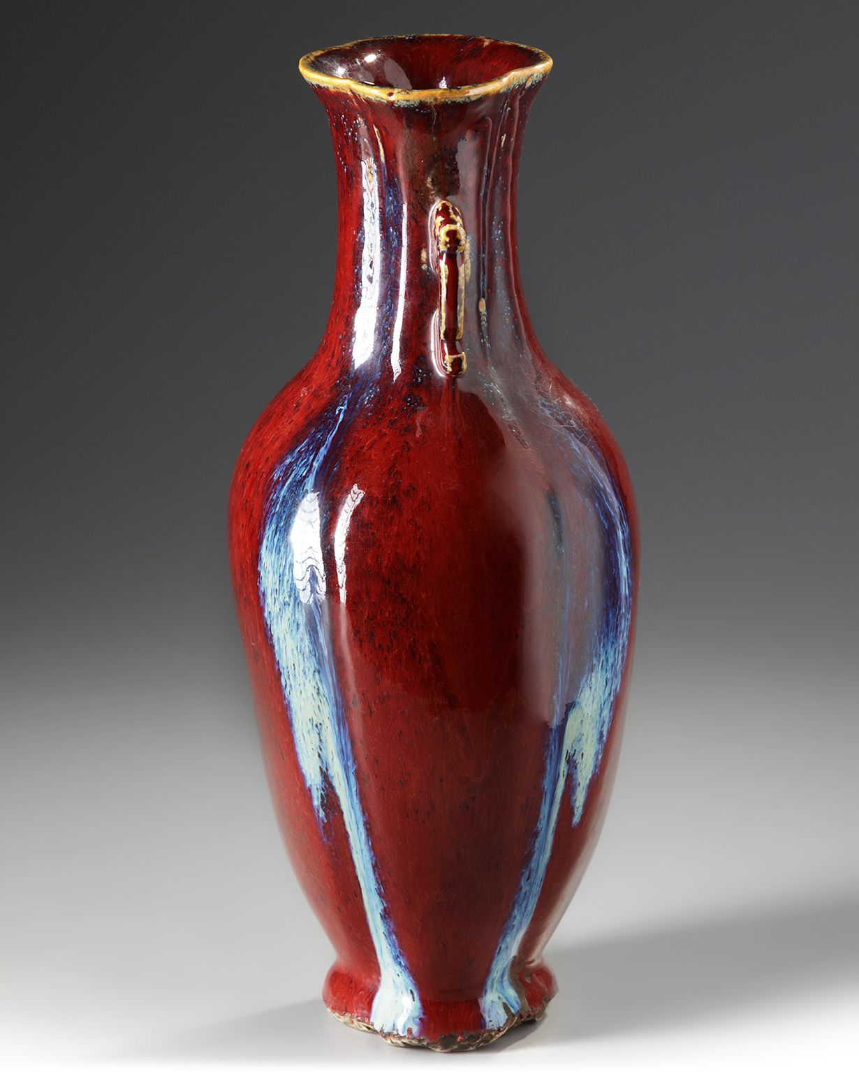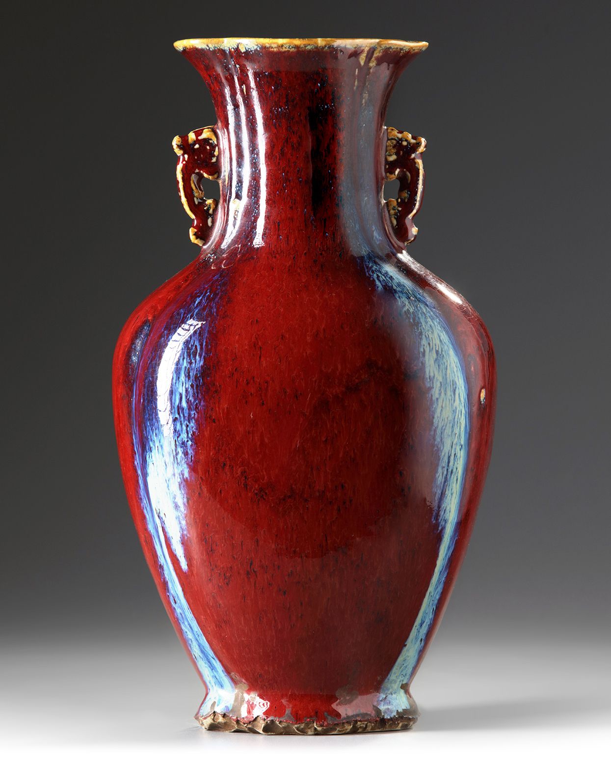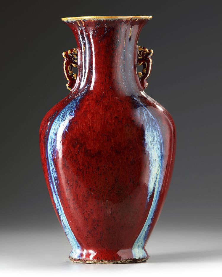 The quatrefoil-section vase is decorated with two kui-dragon handles to the neck. The vase is covered overall with a vibrant deep red glaze suffused with lavender, purple, and pale blue streaks thinning to mushroom at the rim. The sepia-glazed base bears an apocryphal Yongzheng mark.