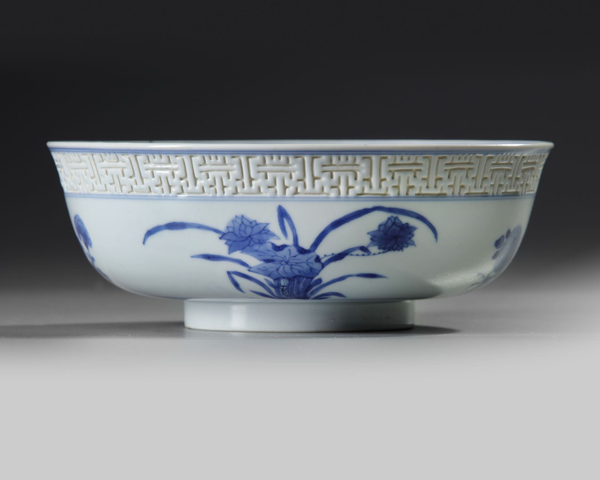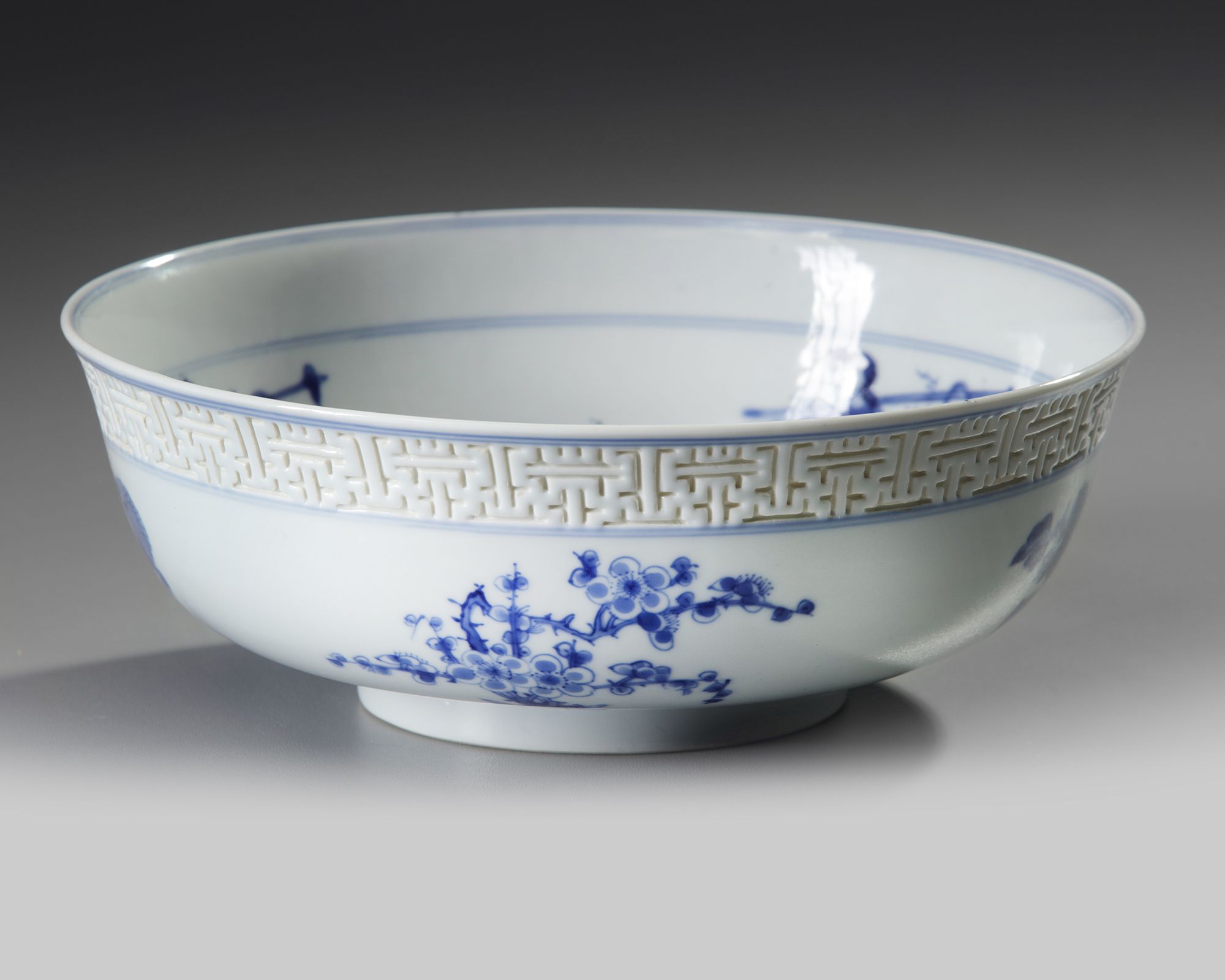 The bowl is finely decorated to the interior with four depictions of the immortal He Xiangu surrounding a band of eight precious objects, babao. The exterior is decorated with the Flowers of the Four Seasons (lotus, chrysanthemum, prunus, and peony). The rim of the exterior is delicately incised in relief with an interlocking pattern.