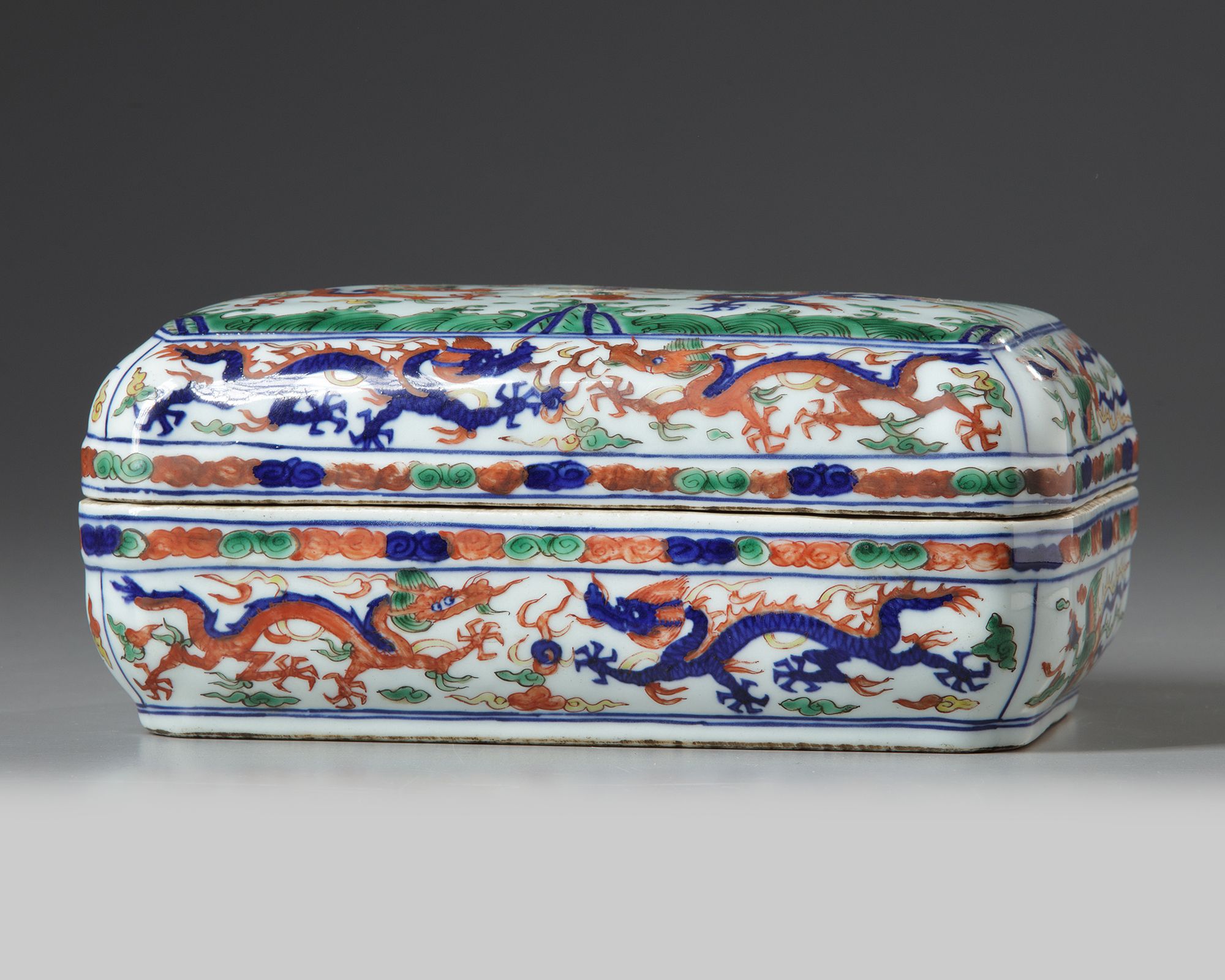 A Chinese wucai box, decorated with two dragons chasing a flaming pearl amongst clouds.The sides with a repeating scene of a phoenix and two dragons.